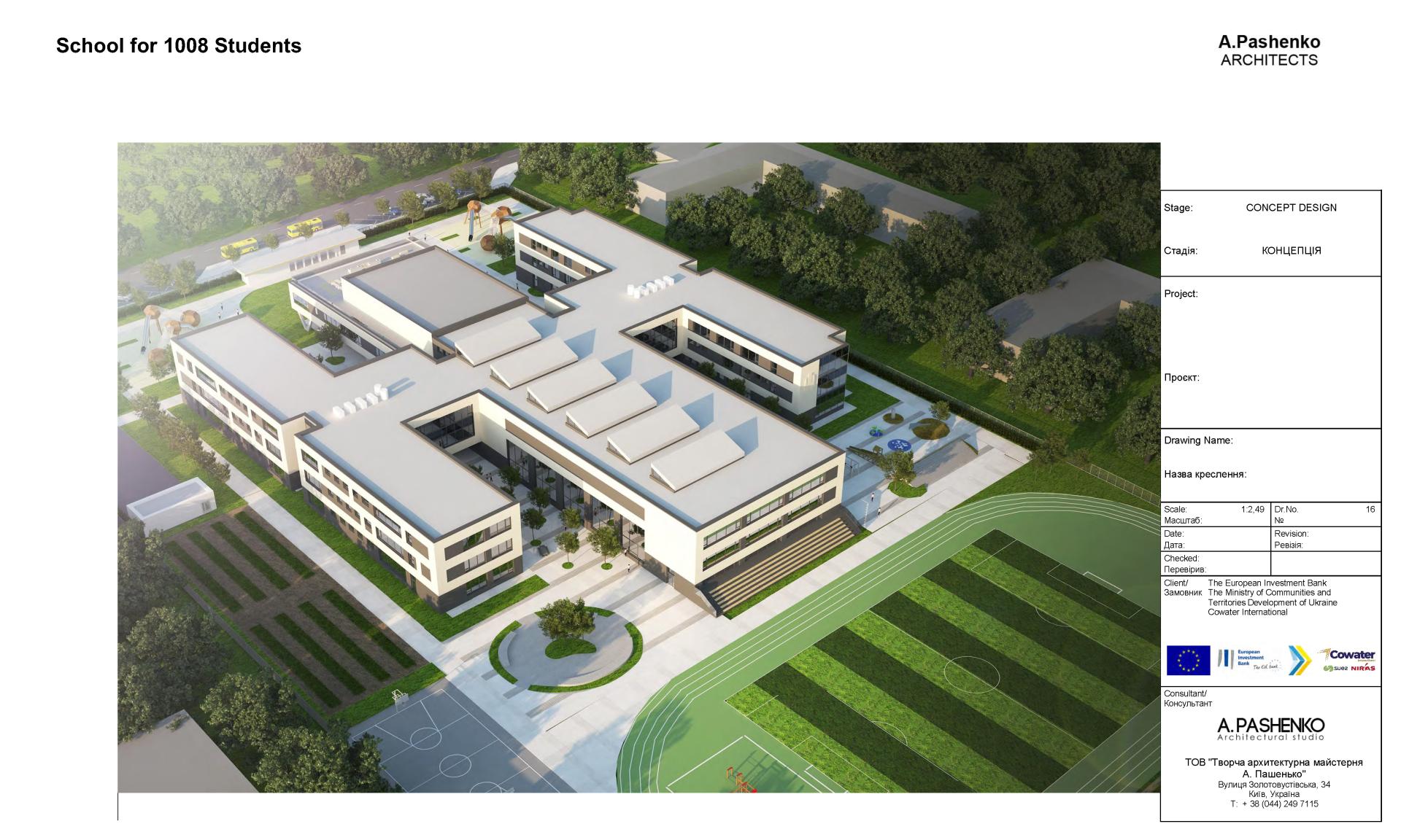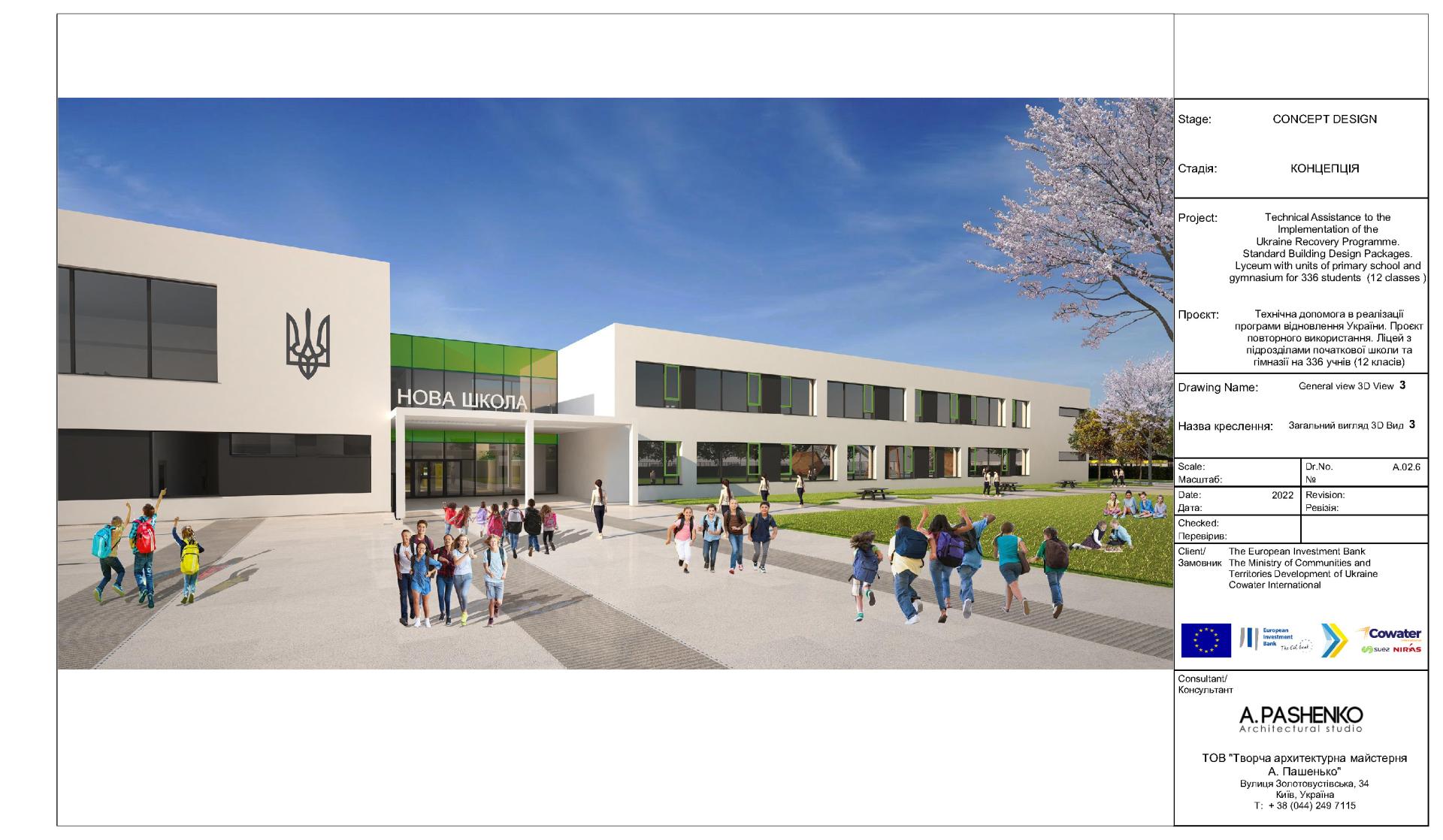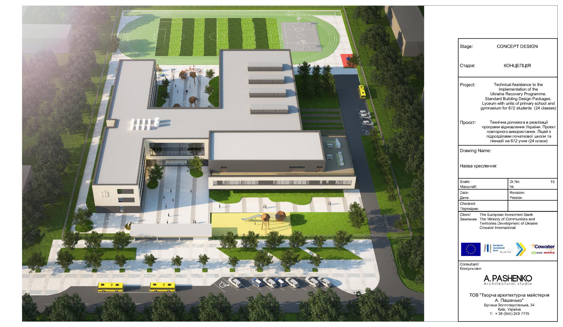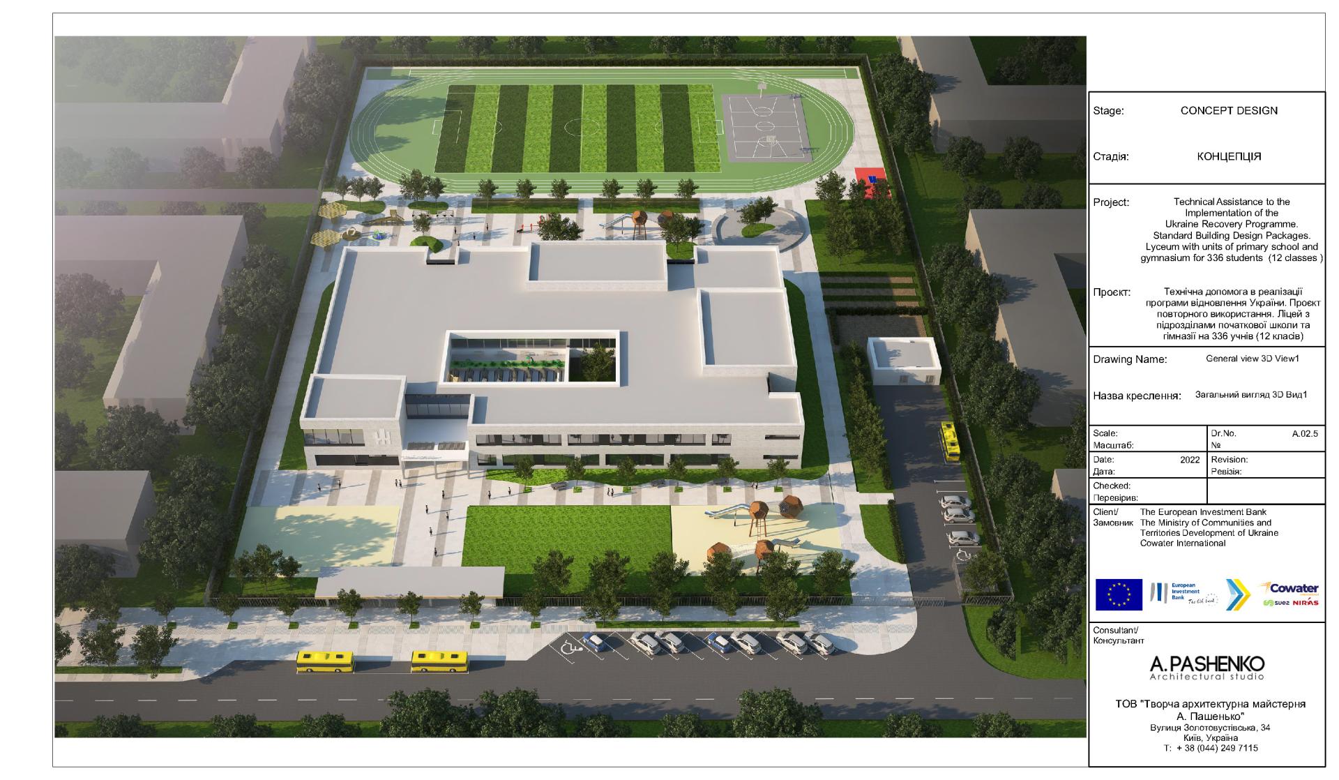 The Ukrainian Architectural Studio A.PASHENKO have developed seven typical projects of social infrastructure for the rebuilding of Ukraine. The project was implemented within the framework of the Ukraine Recovery Program (URP) — a framework loan from the European Investment Bank (EIB). The projects include three schools, three kindergartens and an administrative services centre, and can be used by local municipalities for free, saving considerably time and money in the reconstruction efforts.