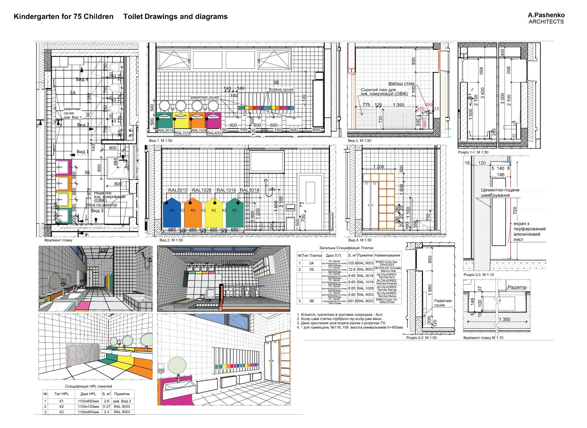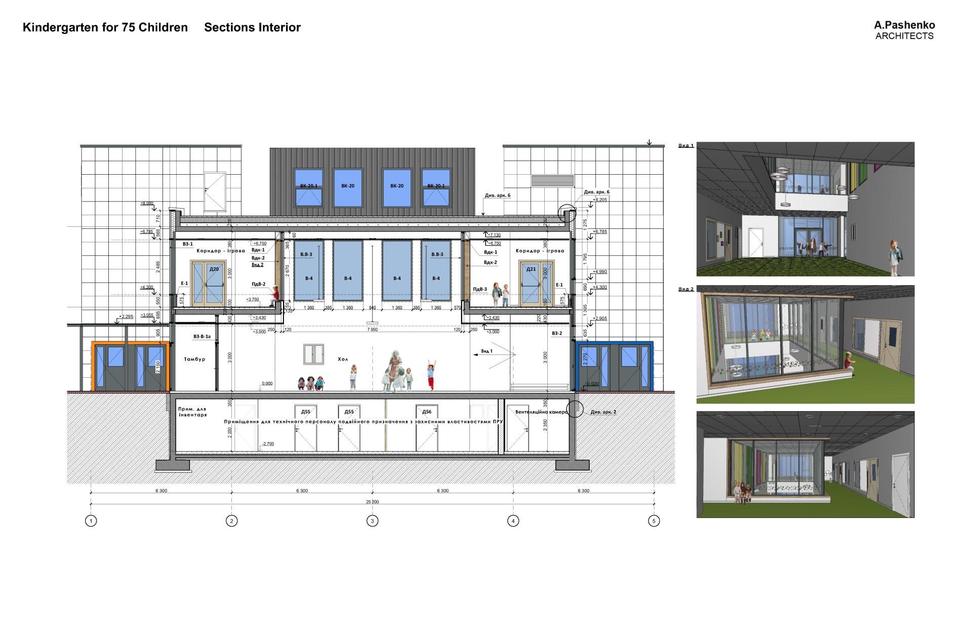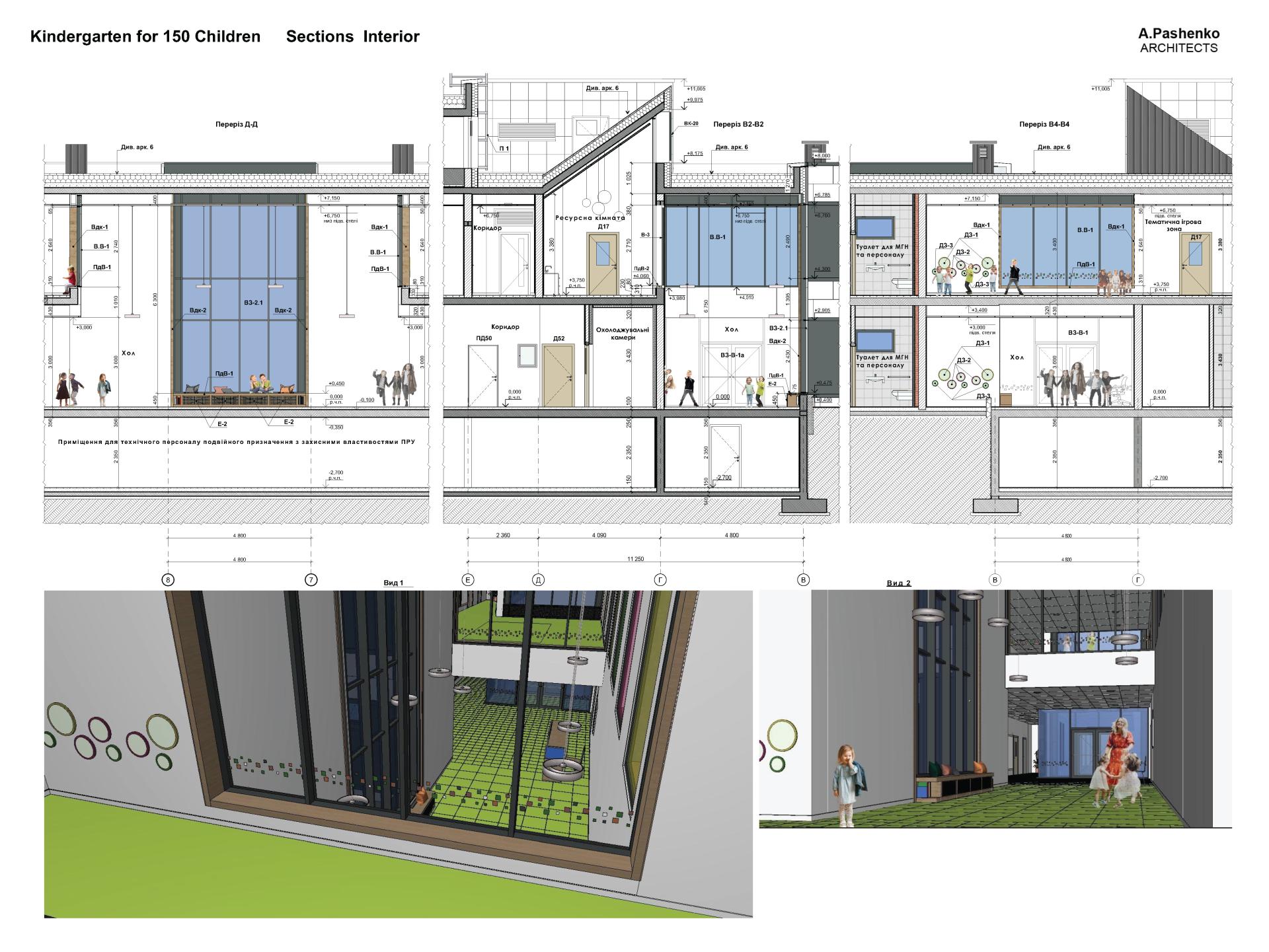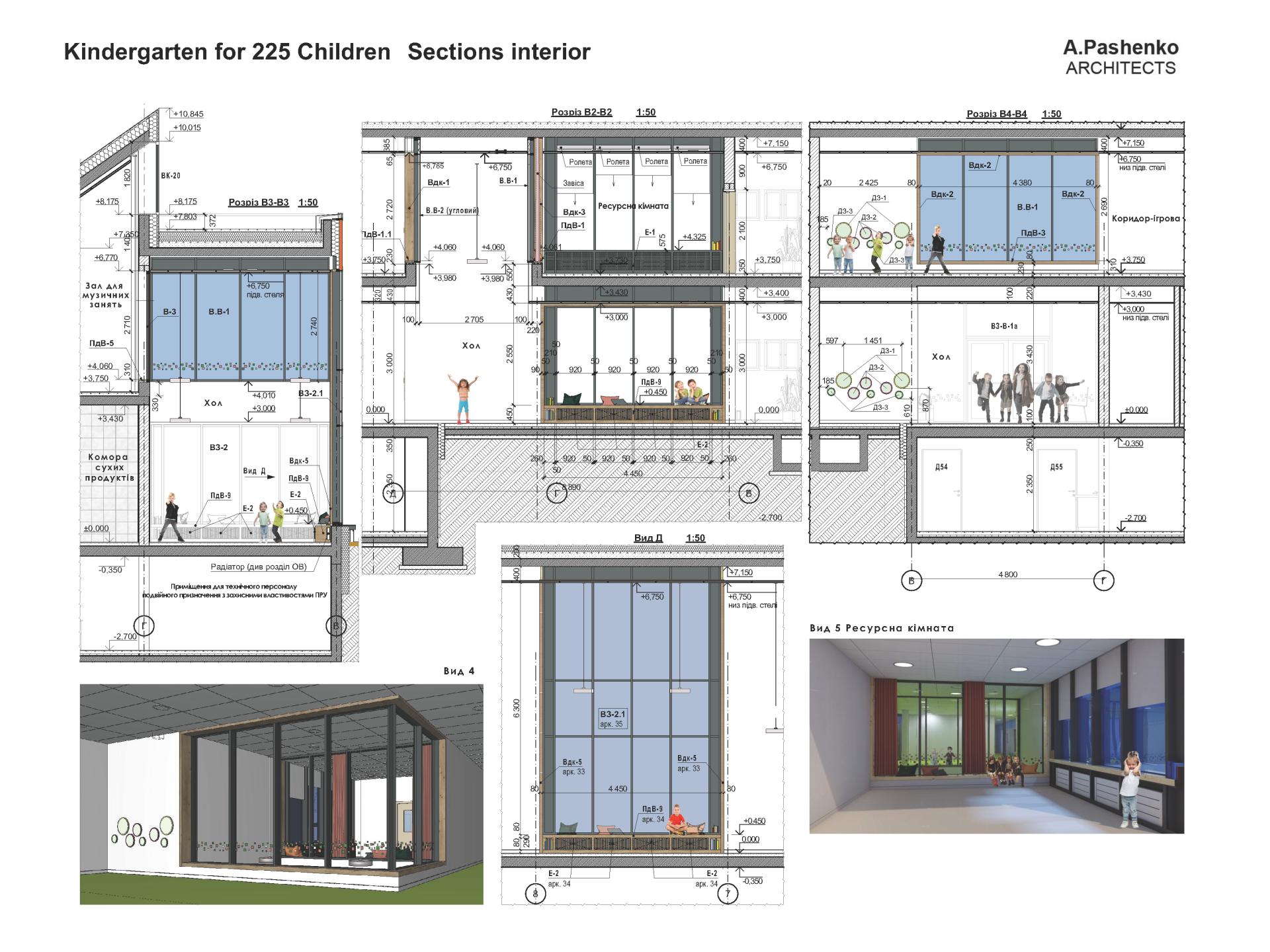 We started from jointly developing the project briefs, which aspired to the creation of safe, inclusive, functional and inspiring environments which meet the needs of Ukrainian communities. The briefs were accompanied by the capacities and the accommodation schedules. During the next concept design stage we explored different design options that aligned with the brief, and together chose the preferred options. The adopted methodology was to start with the collaborative design of the elemental unit. For example, in the case of the kindergartens, we started from the development of a children group unit, where children spent most their day. In similar way, in the school projects we started from the design of classrooms. Once these were agreed, the team proceeded to the designs of the supporting accommodation, the circulation, the external appearance, the outdoor spaces and so on. A set of documentation was prepared including plans, sections, elevations and visualizations to accompany the engagement processes. The following technical design stage involved a more detailed design development of the projects including specifications of materials, equipment and furniture, technical reports but also preparation of the planning application submission to the statutory authorities for review and approval. Throughout the design process we regularly reviewed and ensured that the projects comply with the latest building regulations and are on track in terms of budget. The final stage was the development of the tender documentation, which includes detailed architectural and engineering drawings, specifications, bills of quantities and cost plans, some examples of which we included in the submission.
