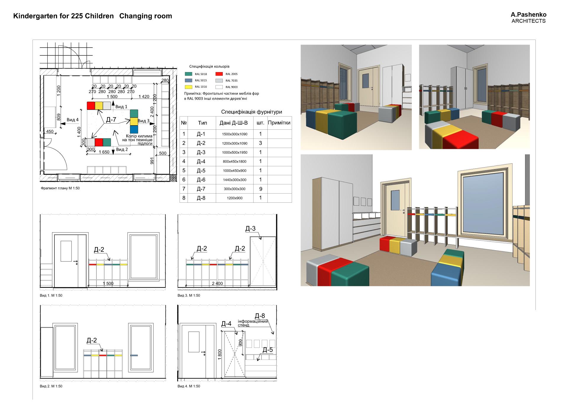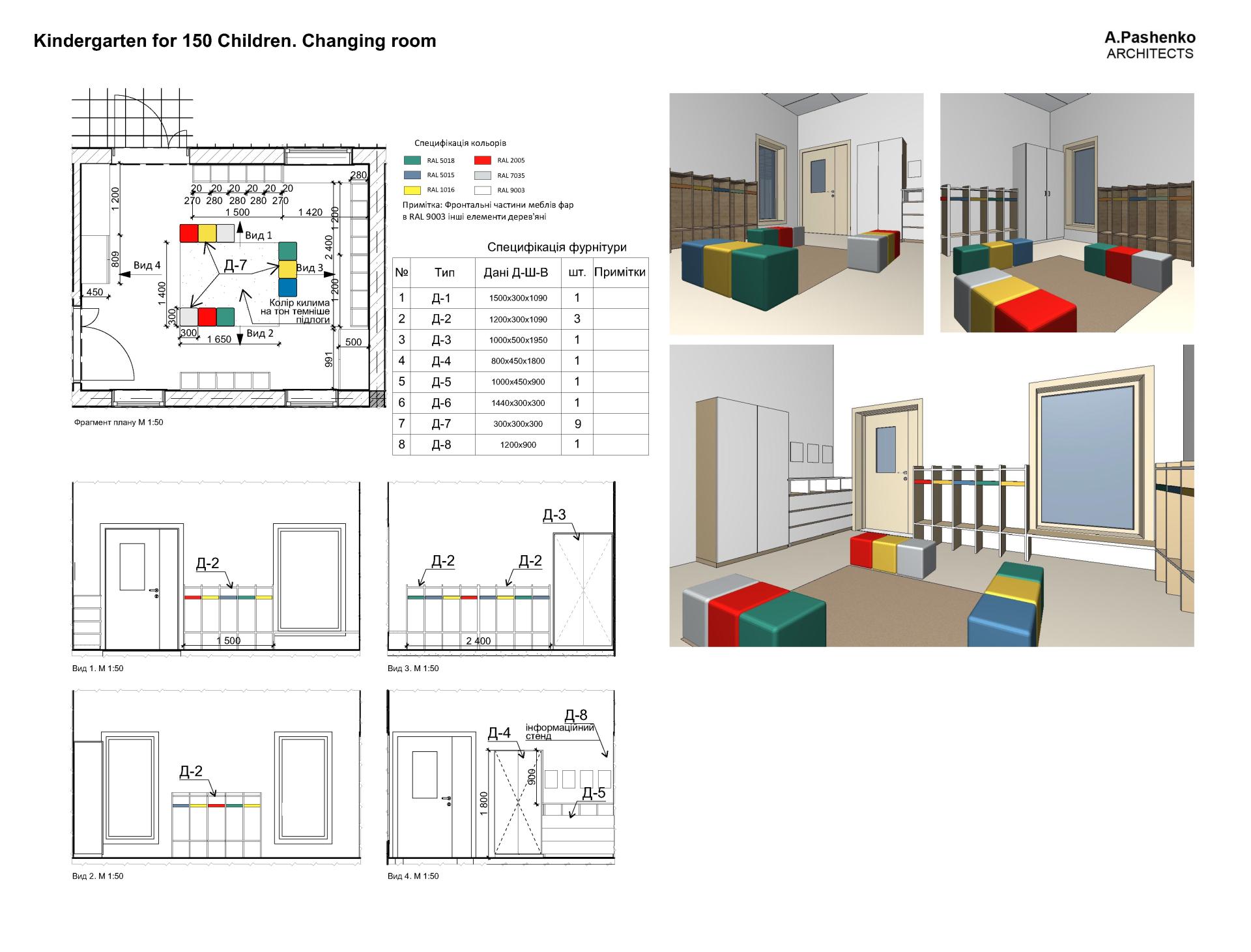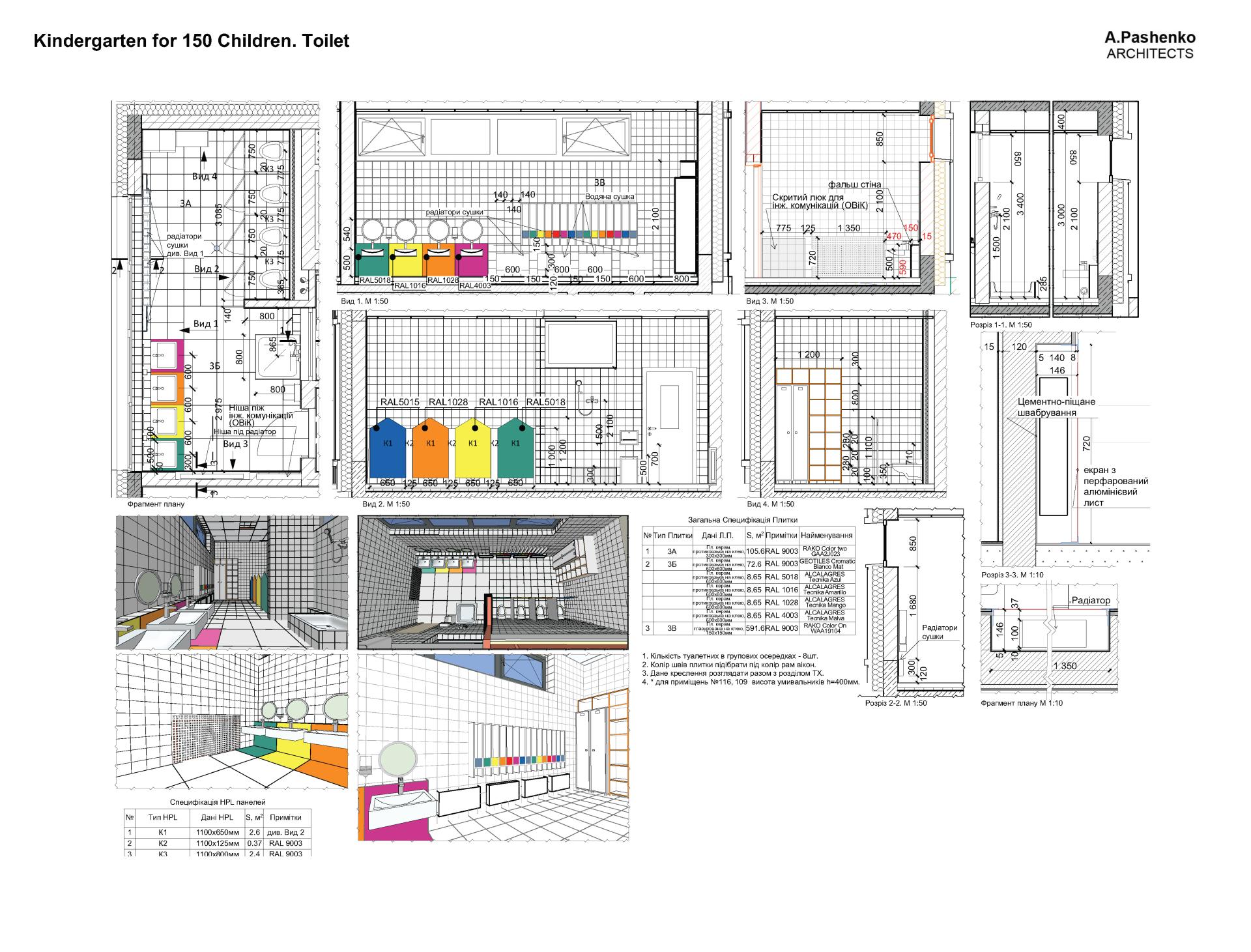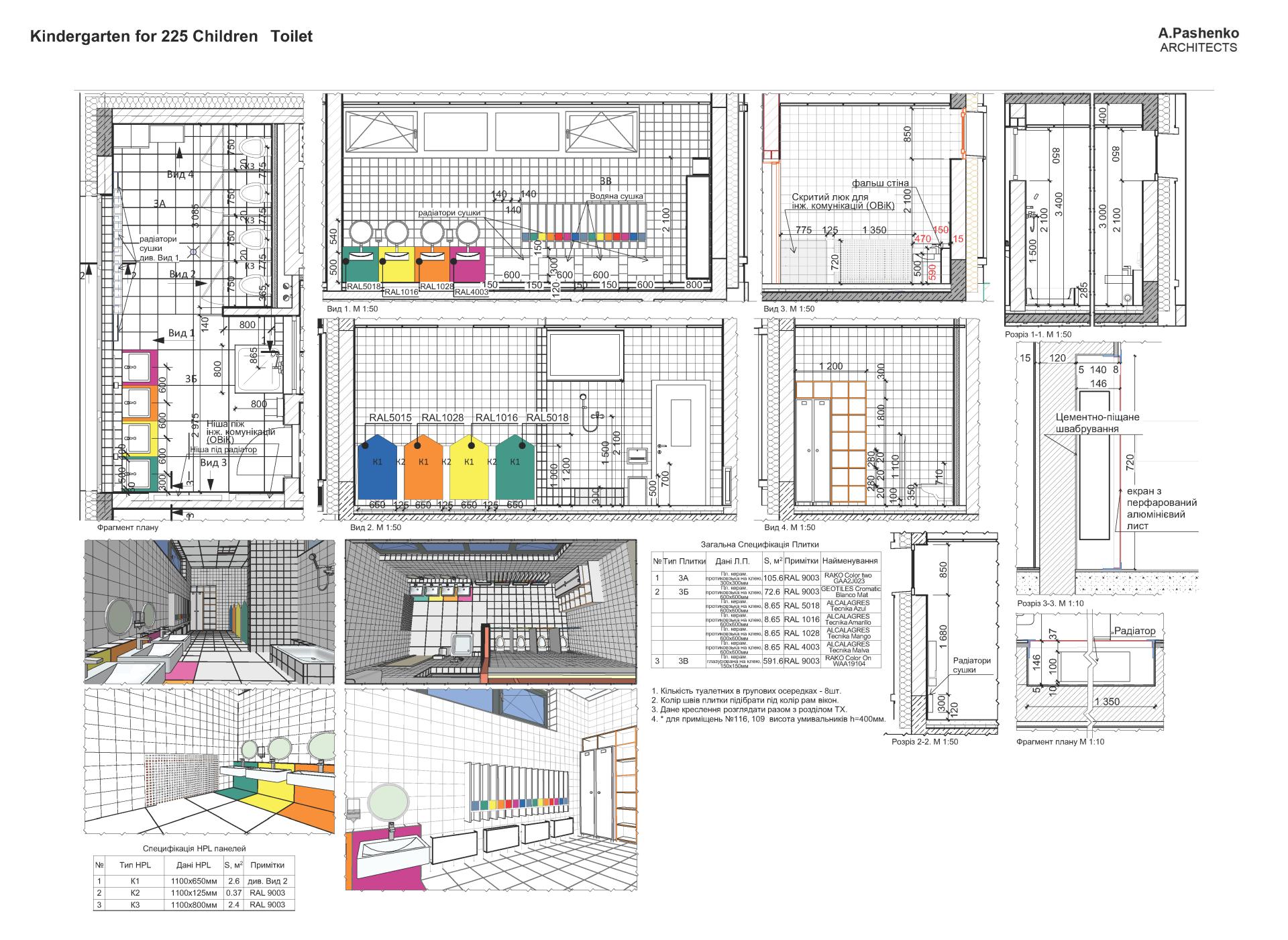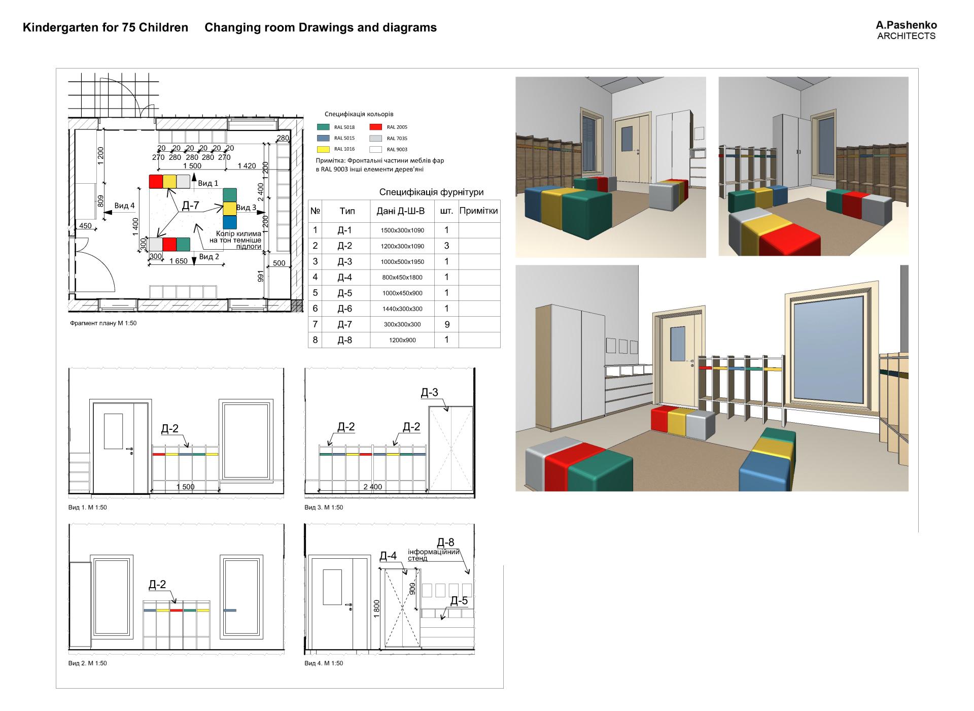 We started from jointly developing the project briefs, which aspired to the creation of safe, inclusive, functional and inspiring environments which meet the needs of Ukrainian communities. The briefs were accompanied by the capacities and the accommodation schedules. During the next concept design stage we explored different design options that aligned with the brief, and together chose the preferred options. The adopted methodology was to start with the collaborative design of the elemental unit. For example, in the case of the kindergartens, we started from the development of a children group unit, where children spent most their day. In similar way, in the school projects we started from the design of classrooms. Once these were agreed, the team proceeded to the designs of the supporting accommodation, the circulation, the external appearance, the outdoor spaces and so on. A set of documentation was prepared including plans, sections, elevations and visualizations to accompany the engagement processes. The following technical design stage involved a more detailed design development of the projects including specifications of materials, equipment and furniture, technical reports but also preparation of the planning application submission to the statutory authorities for review and approval. Throughout the design process we regularly reviewed and ensured that the projects comply with the latest building regulations and are on track in terms of budget. The final stage was the development of the tender documentation, which includes detailed architectural and engineering drawings, specifications, bills of quantities and cost plans, some examples of which we included in the submission.