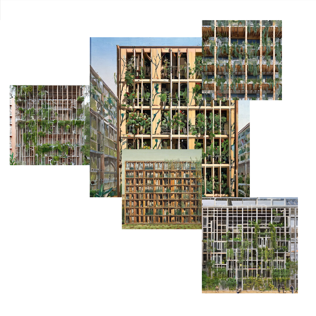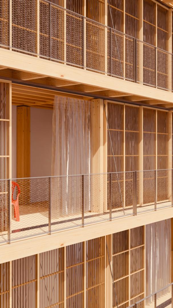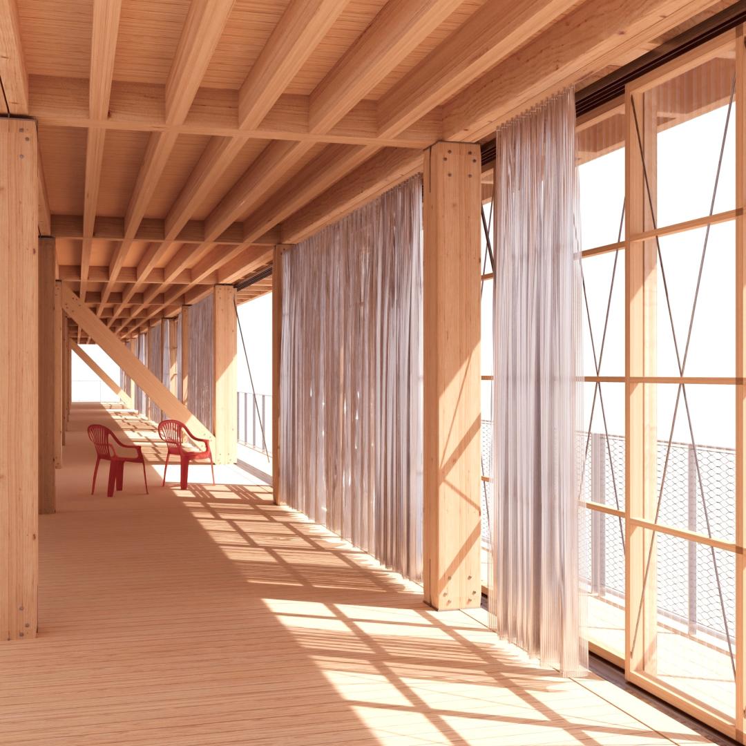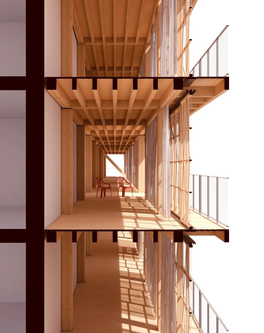Housing blocks possess often overlooked architectural qualities such as access to view, light, and open areas that are highlighted in the project. By enlarging the openings to the outside and creating an extra living space, the winter garden provides an additional room that can be used for a variety of purposes, such as a home office, a playroom, or a mere space for imagination. It allows natural light to enter the home, which can improve the overall well-being and creates a more fluid connection to the outdoors. It also helps to regulate the temperature inside, reducing heating and cooling costs. Furthermore it provides a peaceful and tranquil setting where one can relax and escape from the stresses of daily life. It can also be used to grow a variety of plants, including those that may not thrive in the local climate, which absorb carbon dioxide and release oxygen, making the space a natural air purifier. The add-on can be a great educational tool for children, teaching them about plant growth, biology, and the environment in general. By using raw wood as main building material for the simple low-tech construction, very open and aesthetic, light-flooded spaces are created, opening up opportunities for appropriation to the inhabitants. By using only robust materials such as wood, zinced steel and corrugated sheets, the whole structure is aimed for longevity and repairability. The right to repair is here extended to buildings as an aesthetic and emancipatory quality, taking part in the cultural transformation towards a circular society. The concept aims at preserving the old housing block through the enveloping layer and the wooden skeleton add-on is a timber storage for the future, therefore conserving and extending its longterm cultural value and identity.
