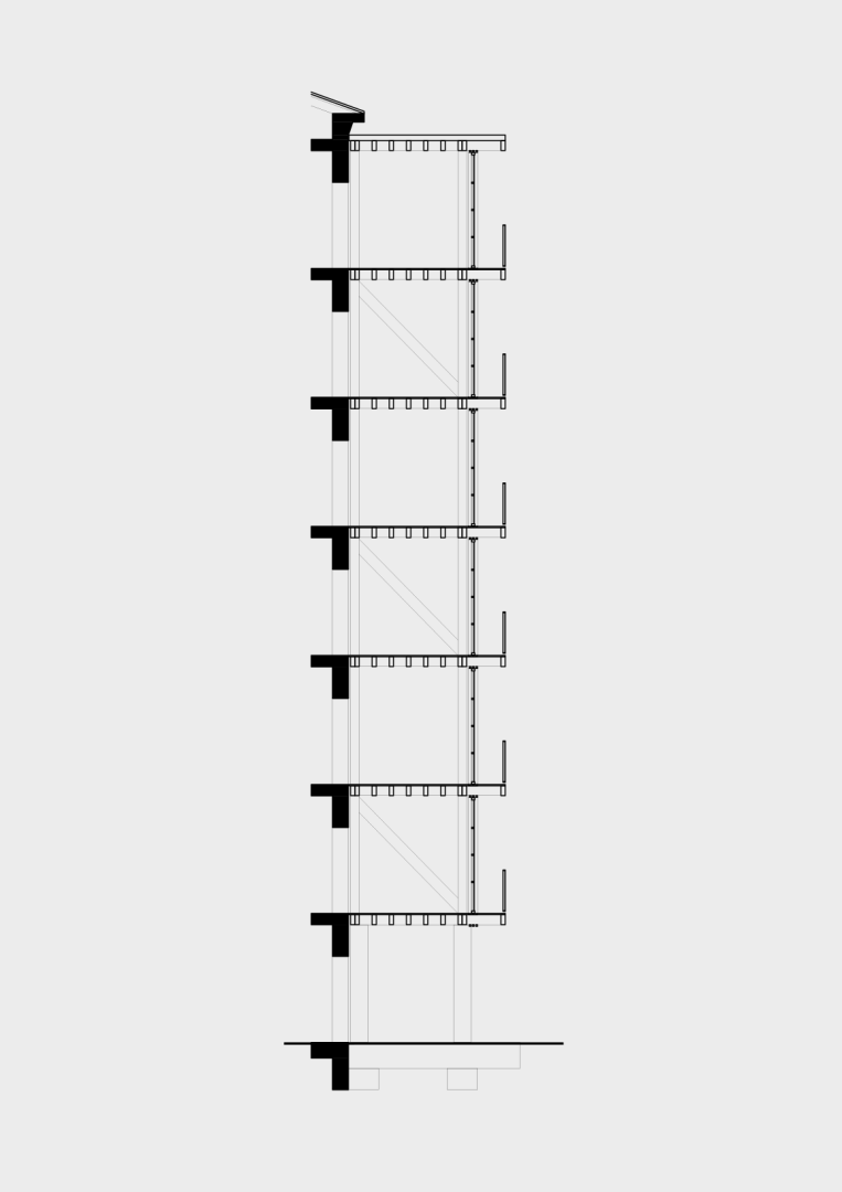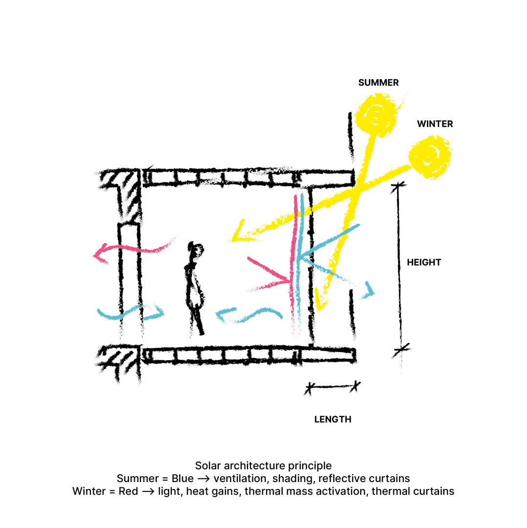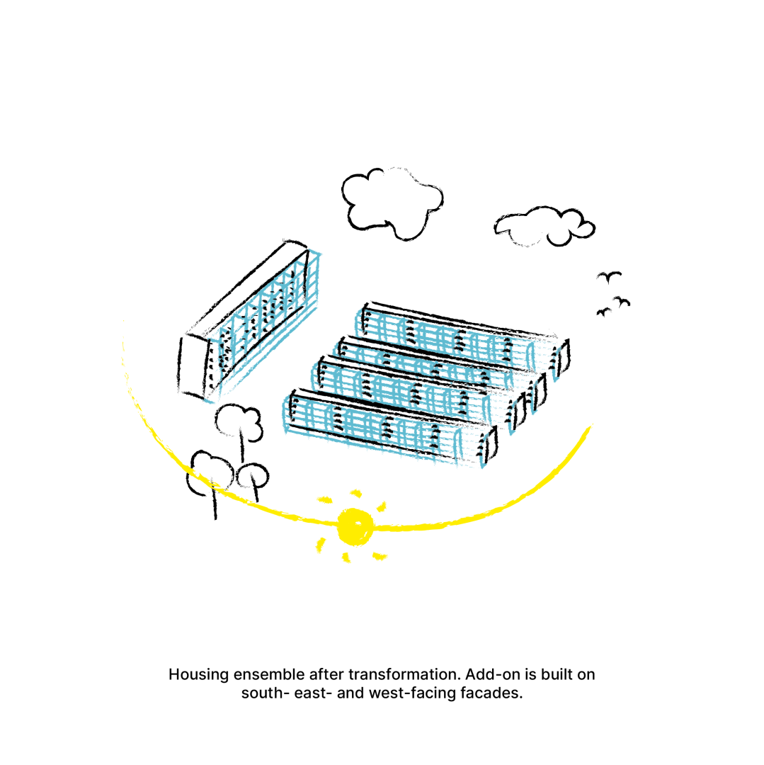 The concept of SOLARBLOCK is counter-acting the current principles of extractivism and capital gains by stopping demolition and developing new circular concepts of regeneration through improvement and extension of existing standardised free standing post-war social housing blocks. This is achieved on the one hand through meticulous analysis of existing structures, striving for minimal intervention, while on the other hand creating an efficient and sustainable low-tech system for extending existing structures. The Add-on is based on an innovative free standing wooden skeleton structure, creating a 3m extension of the current living area. These add-ons are not only providing more space and light, but also act as insulation buffers and solar collectors during winter, replacing toxic insulation materials and enabling better ventilation and shading during summer. It is a low-tech principle that appears through many cultures and climates (veranda, wintergarden, engawa, orangerie, etc.), but has been replaced in the post-war period by oil and gas-driven heating and cooling technologies that today prove to be part of the problem rather than the solution.