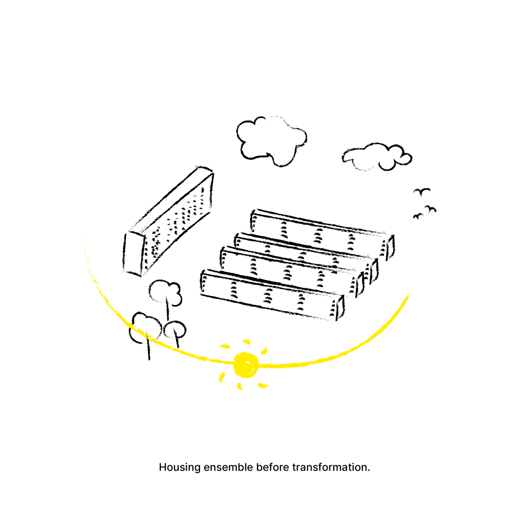 Across Europe, the reconstruction period after the second world war was characterized by the main aim to provide as many apartments as possible as quickly as possible. This resulted in a little loved typology - the ‘housing block', characterized by a prefabricated and uniformous structure. This project develops a future perspective for these ensembles focusing on their great potential for renewable extension, enabling imagination about generous living standards and improvements for inhabitants.