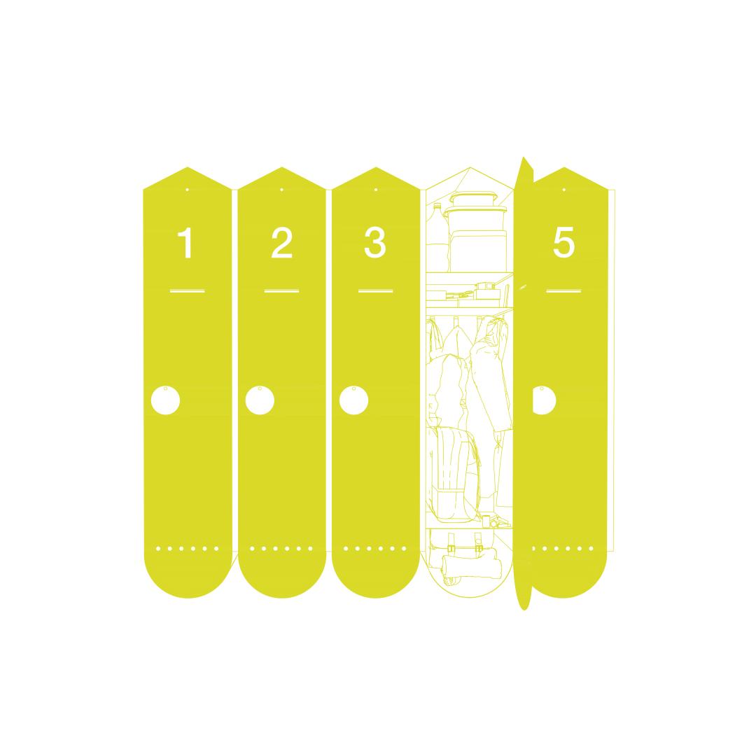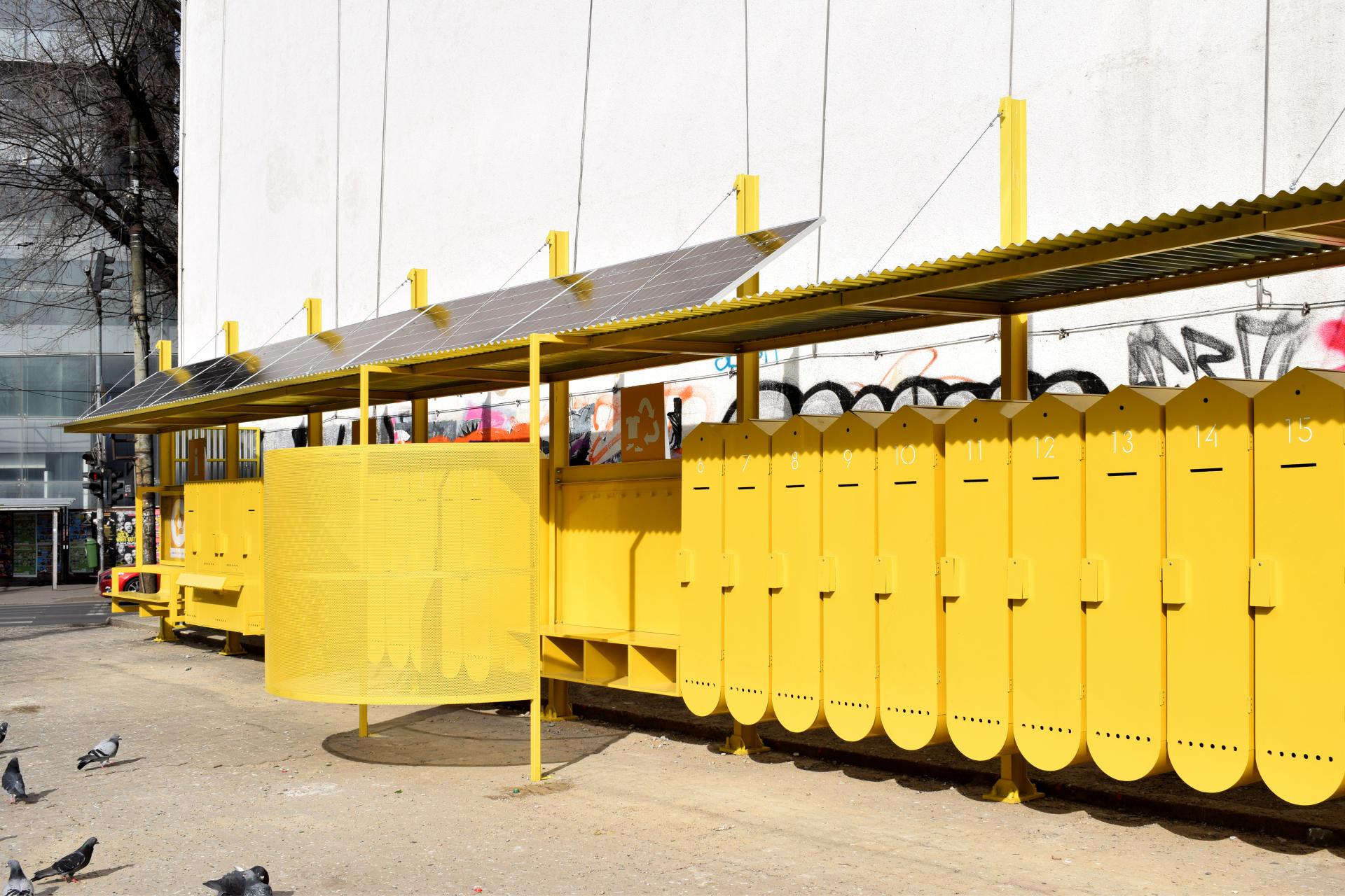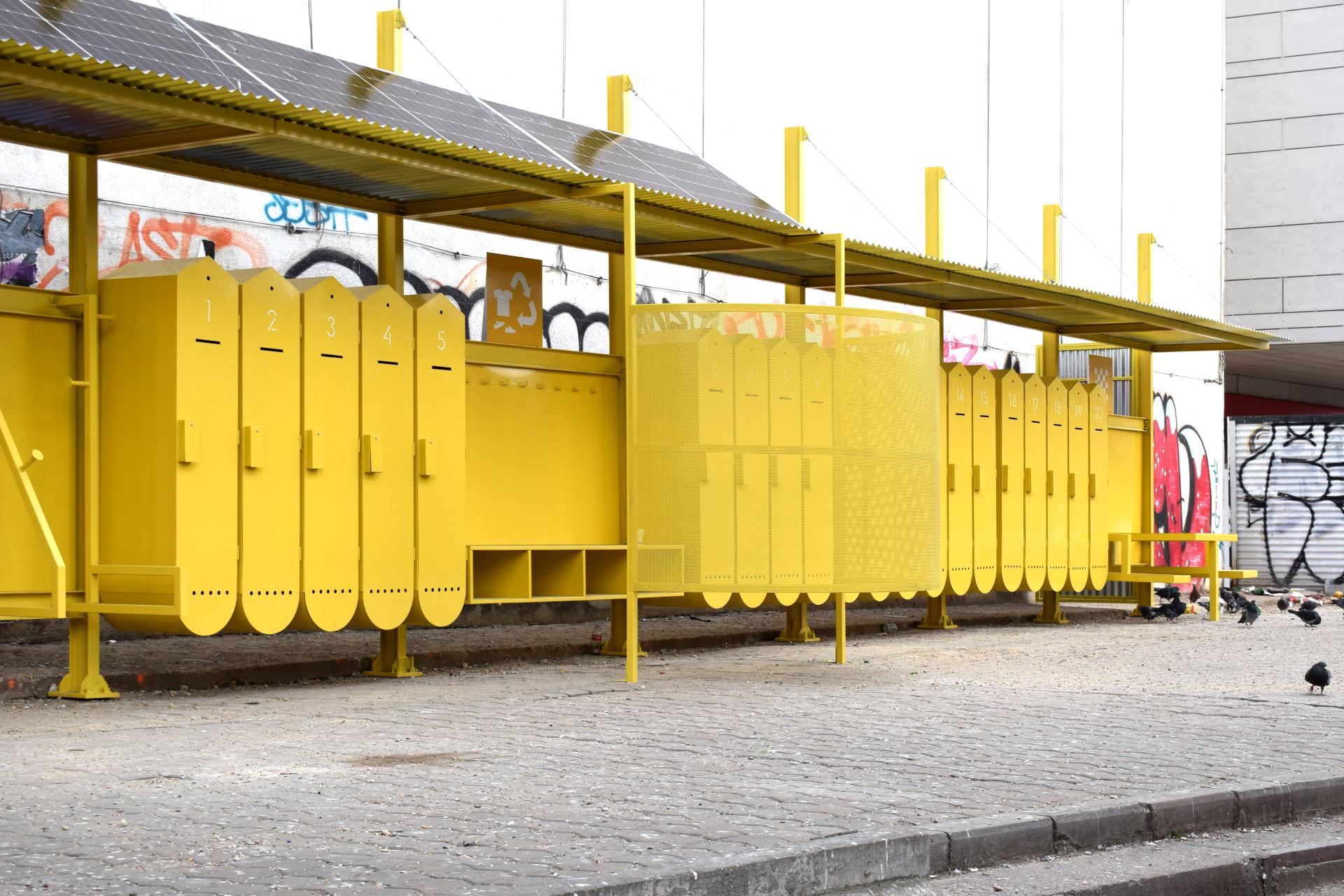 The physical infrastructure consists of a modular framework displaying a covered space that offers access to twenty individual units for storing personal belongings. The units have access to electricity using Off-Grid photovoltaic panels. A series of public furniture opens the space for new collective uses. It includes benches and tables at different heights, a changing space, a display point and an area for sports activities that simultaneously functions as a bicycle rack.