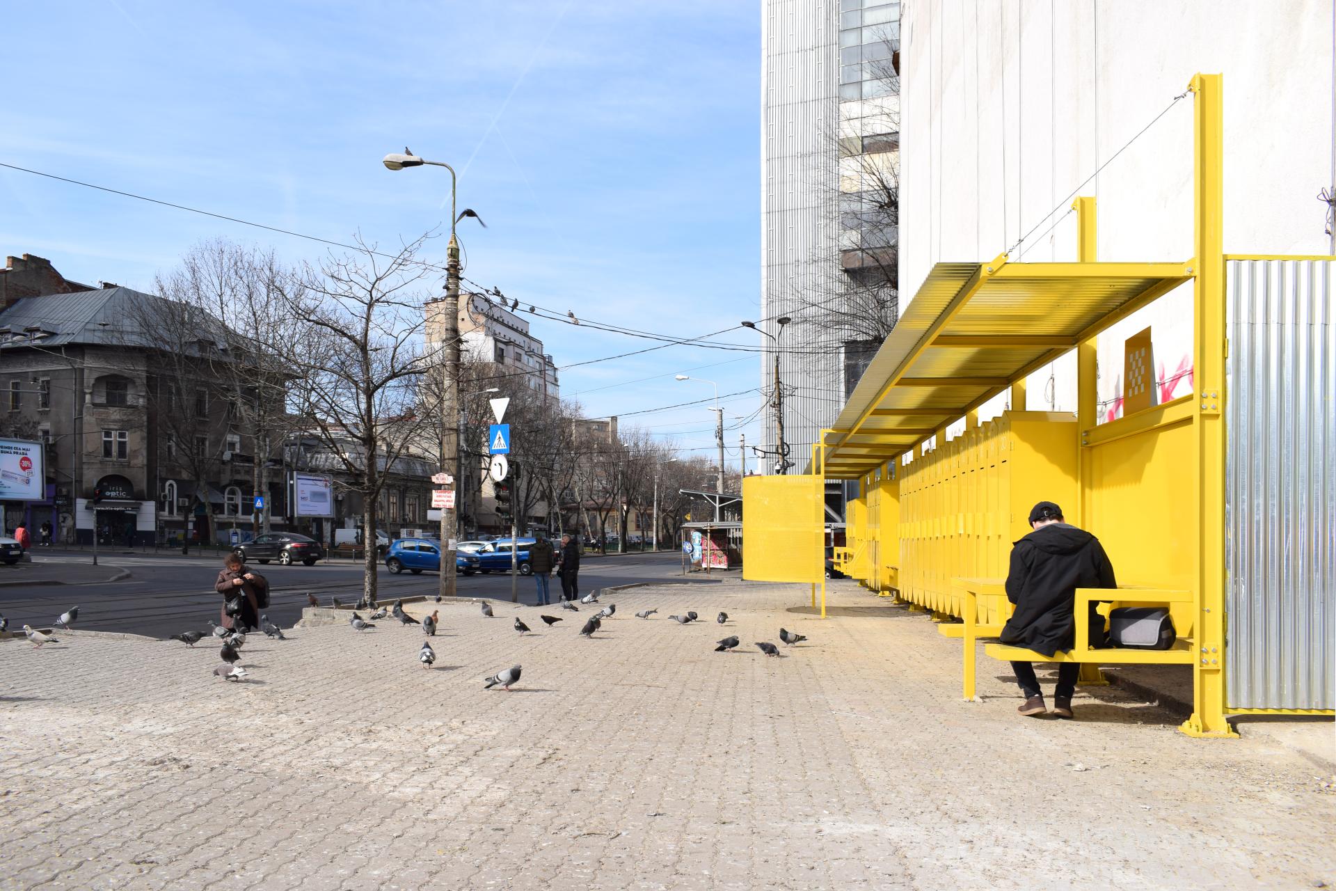 Also, being placed in front of a tram spot, the installation is also used by people in transit as a covered space in case of rain, as well as groups that meet and socialize in the space ( immigrants, elderly, teenagers ).