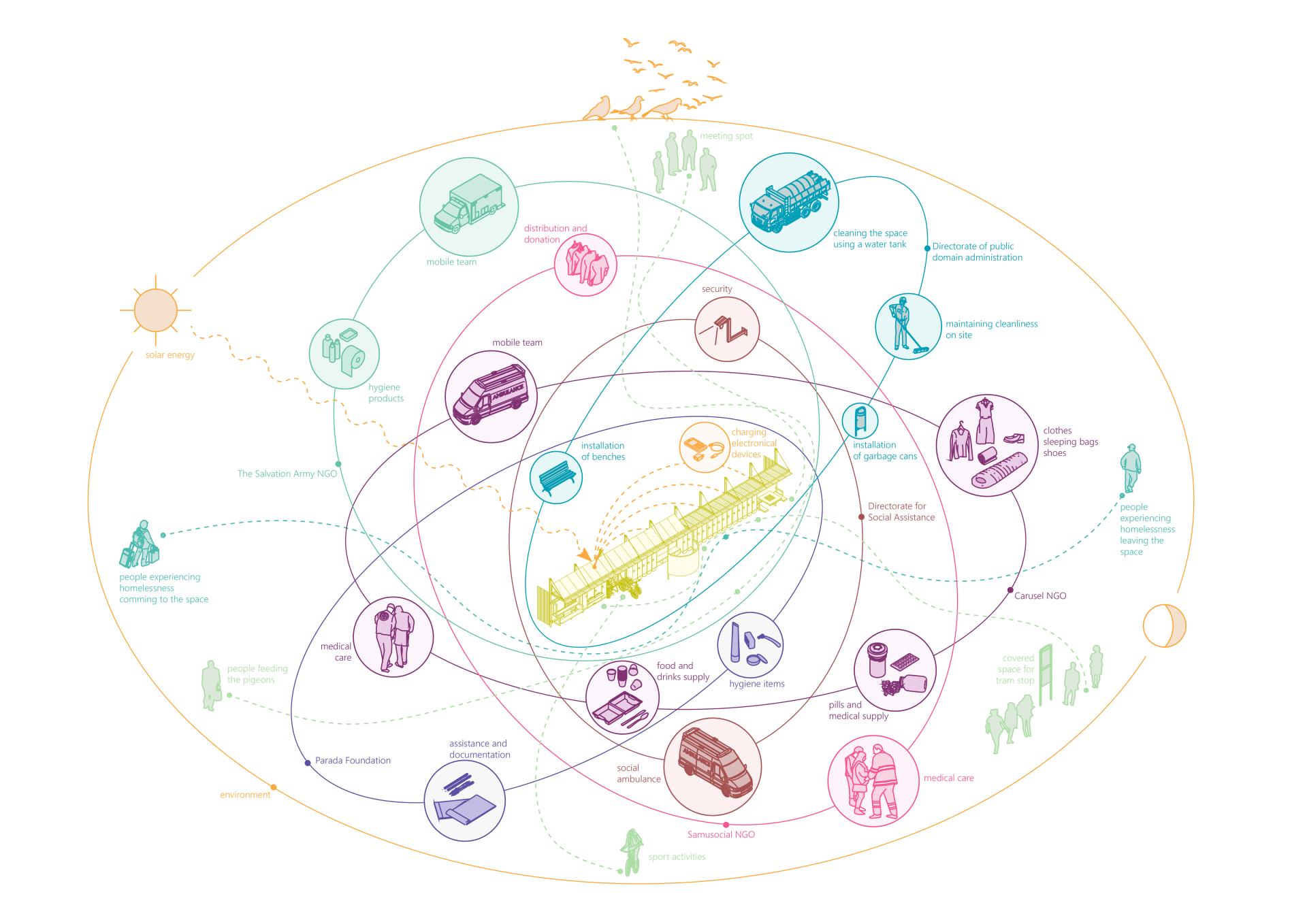 Space for Solidarity is a project that addresses the precarious living conditions associated with homelessness in Bucharest while reclaiming for collective use an abandoned yet extremely central and intensely transited public space. It creates visibility and space for action, for both public and non-governmental support networks, partnered in co-managing the space while becoming a fixed point for their mobile teams, offering social and medical services.