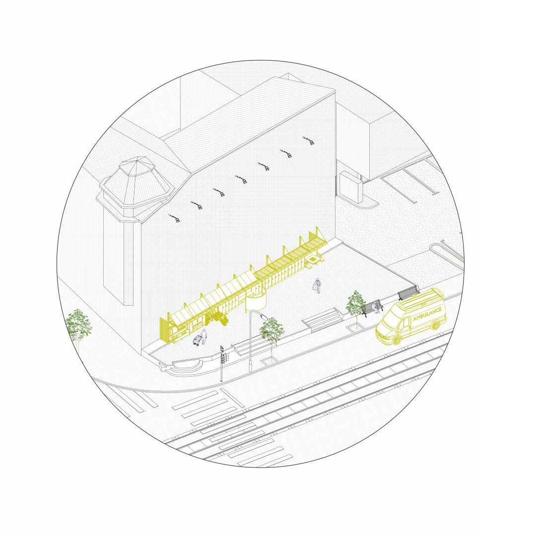 The use of colour reflects the character of the project as an urban street infrastructure that relates to instances of living crisis but also highlights the potential of derelict urban spaces to consolidate their position for collective and public use.