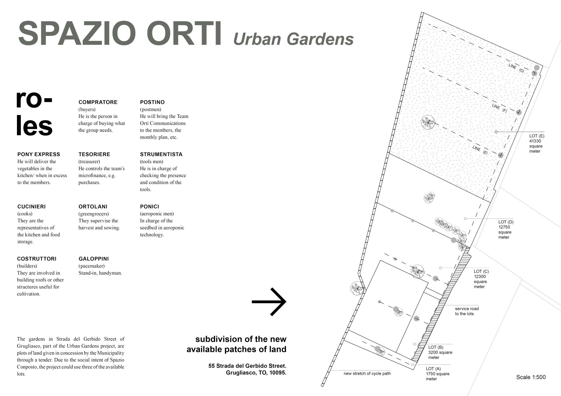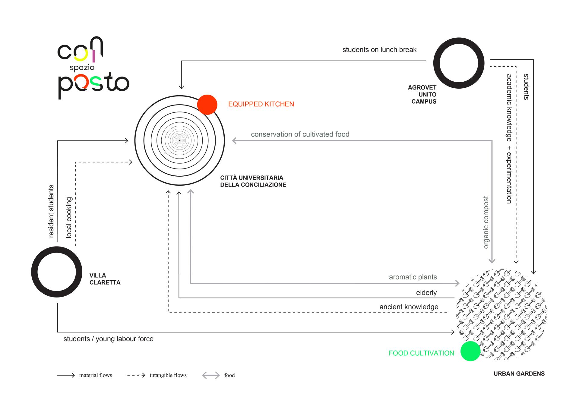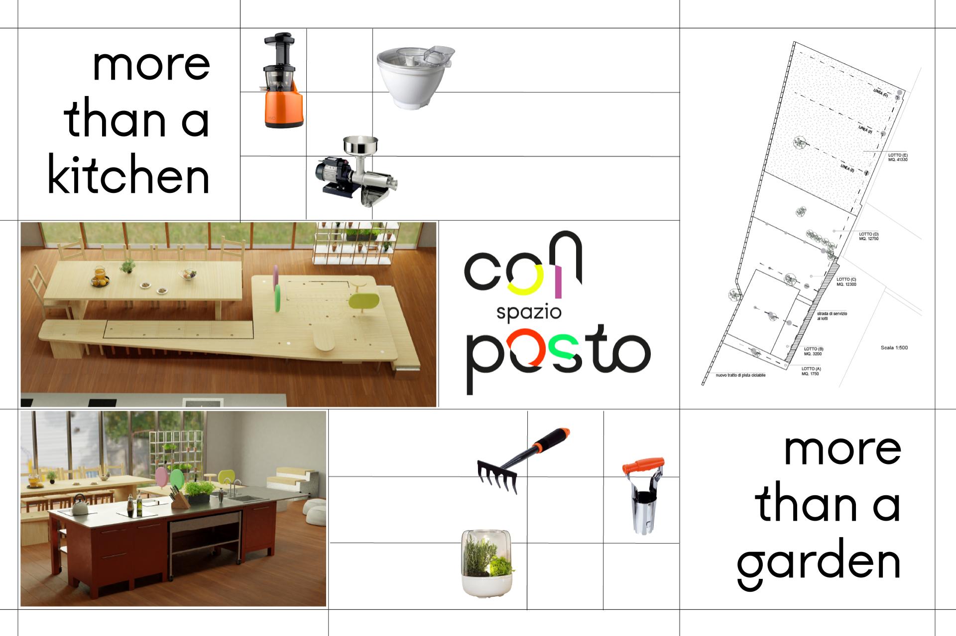 Spazio Conposto is designed for a small town in the province of Turin to bring together two currently distant generations, students of the University of Agricultural and Veterinary Sciences, and the elderly, enhancing intergenerational bonds. Through practical actions of rethinking and redesigning public spaces, the two generations can meet and collaborate, strengthening the sense of community and belonging to a marginal place in the suburb of Grugliasco (TO). The project consists of two spaces, the Urban Gardens ("Spazio Orti") and the Kitchen Space ("Spazio Cucina") in Città Universitaria della Conciliazione, where food becomes an opportunity for encounters. So, food is the link between the two spaces where elderly and young people exchange knowledge and work together to manage the two places. Spazio Orti, consisting of small lots of land, is dedicated to practical work, cultivating the land, experimenting, and bringing together agricultural and university knowledge. Spazio Cucina is a room equipped with furniture and professional tools, which allows the community to cook and consume food. Thus, food is addressed in many aspects: from on-site production to the preparation of dishes; to the final management of organic waste. Spazio Conposto could become a meeting point where involved people can freely spend time and experience new methods of doing individual things with others, like co-cooking and co-creating. There are no limits to culture, abilities, or time to allow people to move into the spaces with freedom so that energy and diversity could mark out the entire local area, for now much more listless. The project is a physical landmark for the suburb of Grugliasco and a dynamic reality where material, immaterial, and food flows animate the space and welcome new relationships.