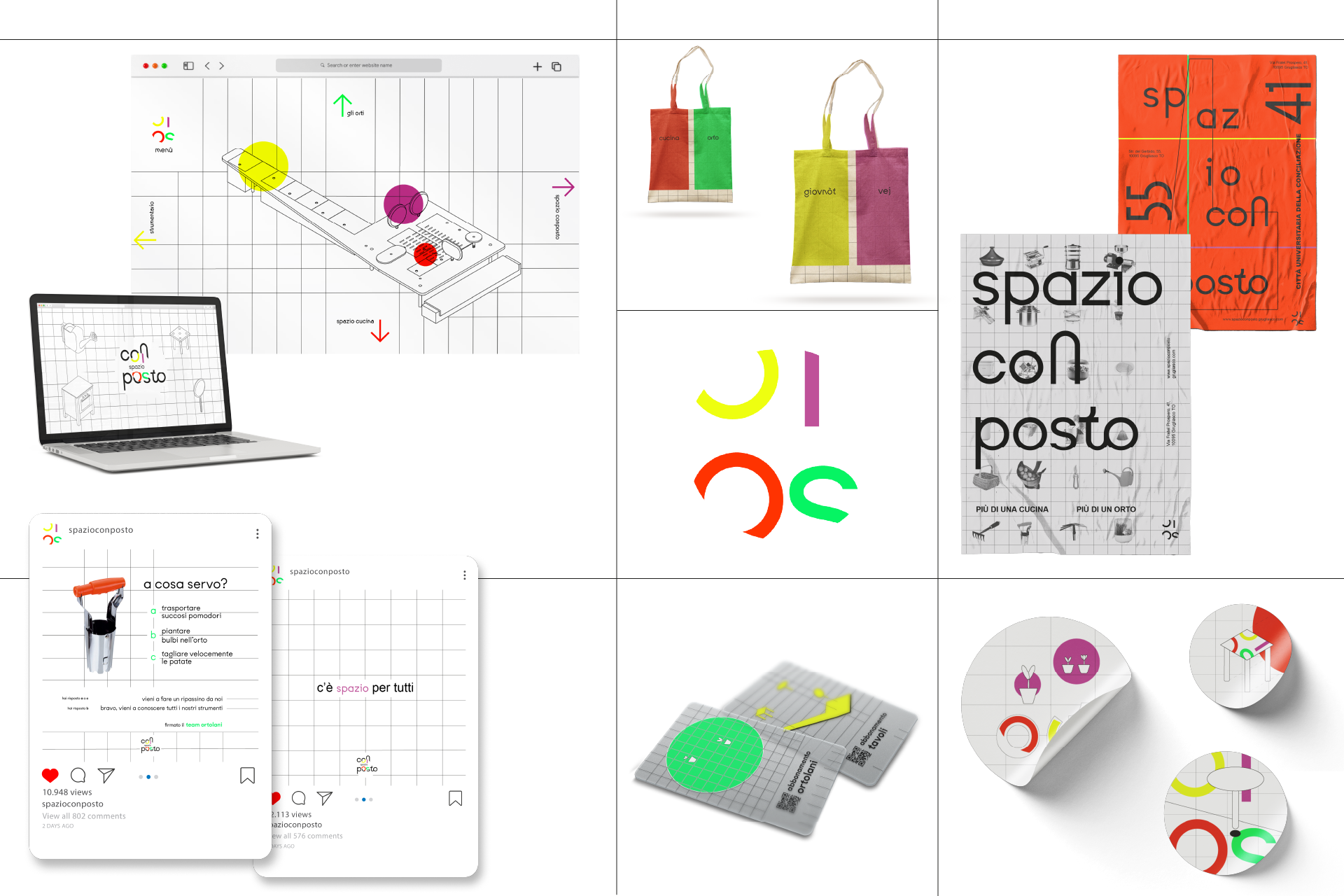 Four colours describe the vital place: orange-red for Spazio Cucina, green for Spazio Orti, yellow for the young, and purple for the elderly. People can declare to be part of the community by wearing bags and pins.