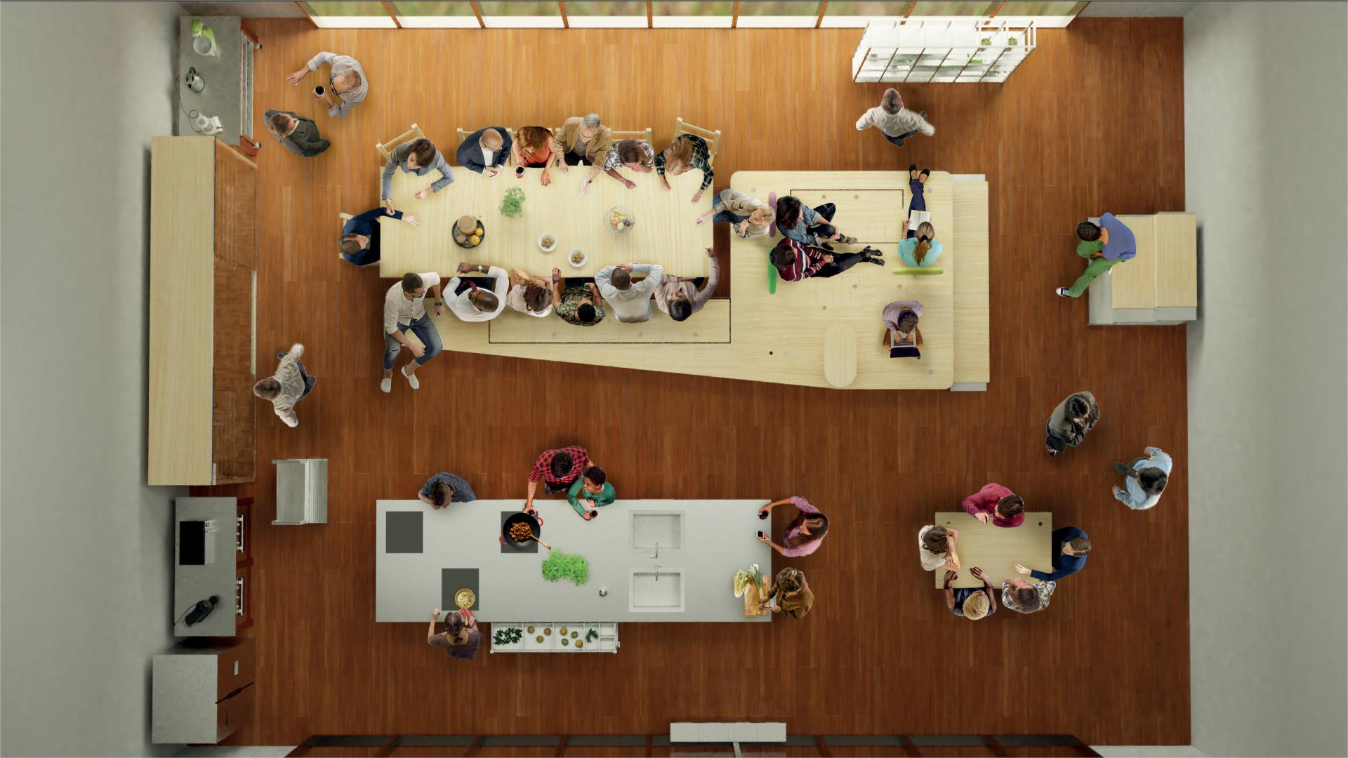 Even in the physical dimension, the kitchen design follows the rules of accessibility: the open space and the spatial arrangement of the furniture facilitate aggregation and dialogue, as well as the freedom of movement of people. The draw of the furnishings is ad hoc to meet multiple needs. Among these, the bench is the main element: centrally arranged, it has large dimensions that facilitate free and flexible uses and encourage people to live moments in the community.