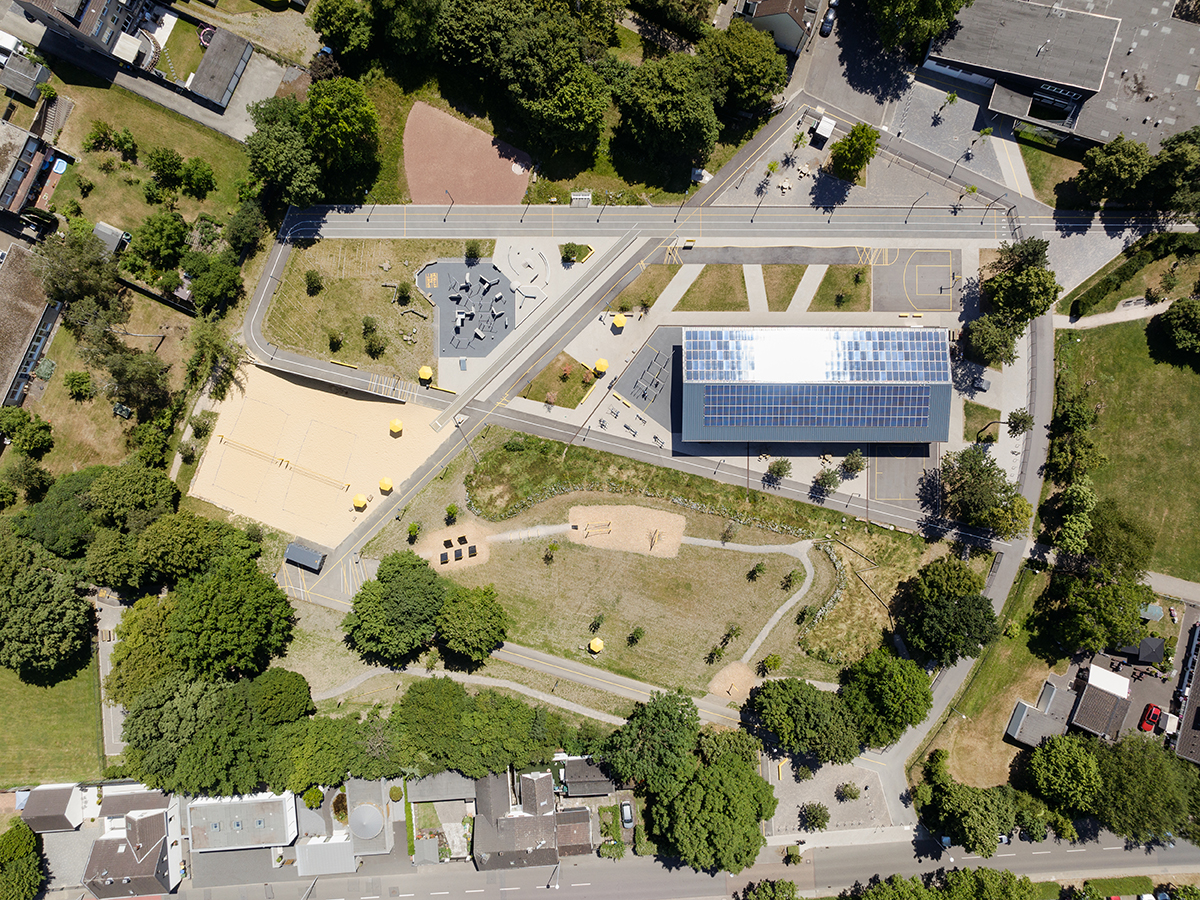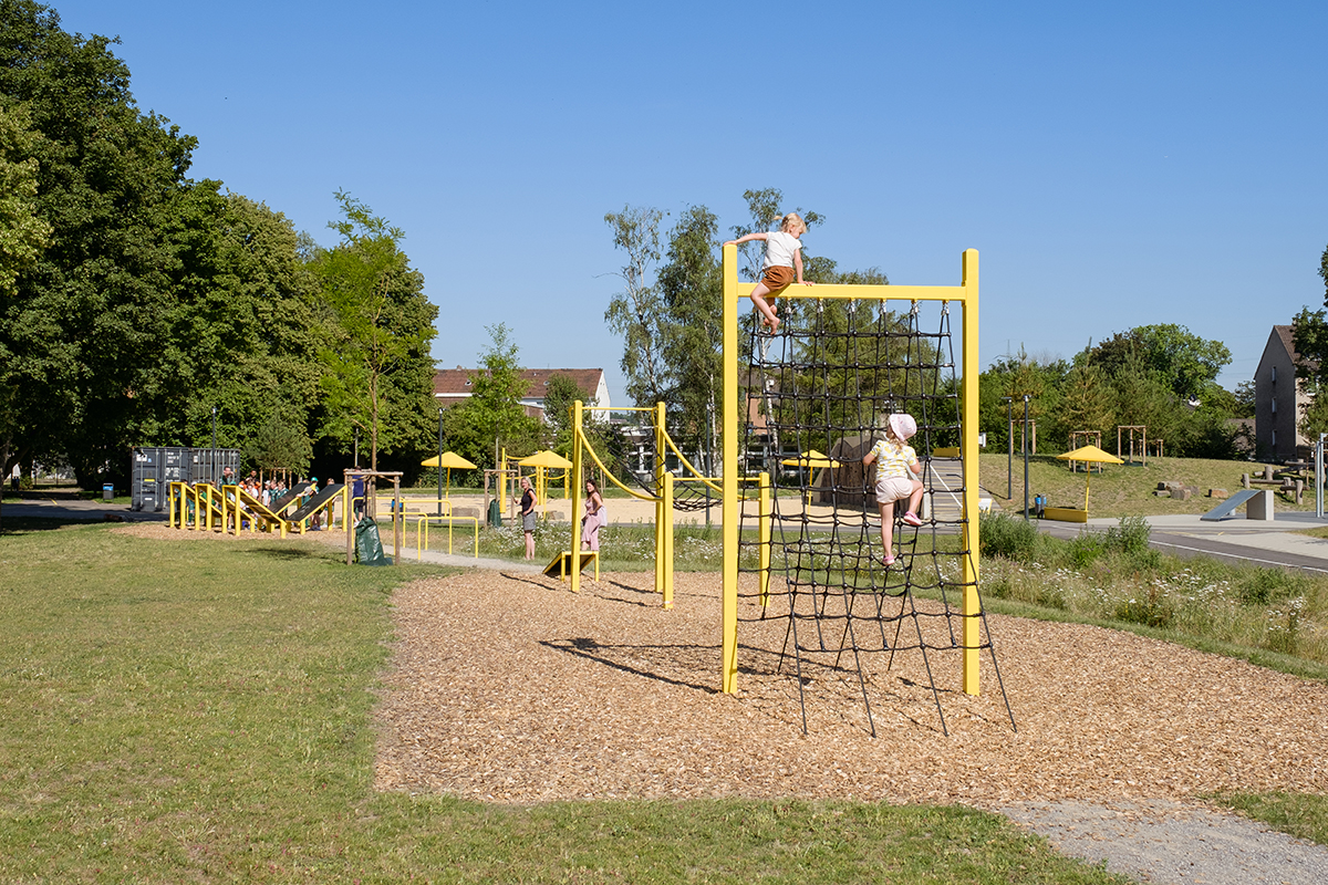 The extensive grassland areas provide a calm contrast to the high-intensity sports activities. They offer opportunities to linger, picnic or use sports equipment integrated into the landscape while also being designed for ecological purposes such as rainwater retention or for serving as a grassy pasture for insects. To offer active breaks, the small playground of the adjacent school was modernised and a new, physical activity playground for older kindergarten and younger school school children was developed.