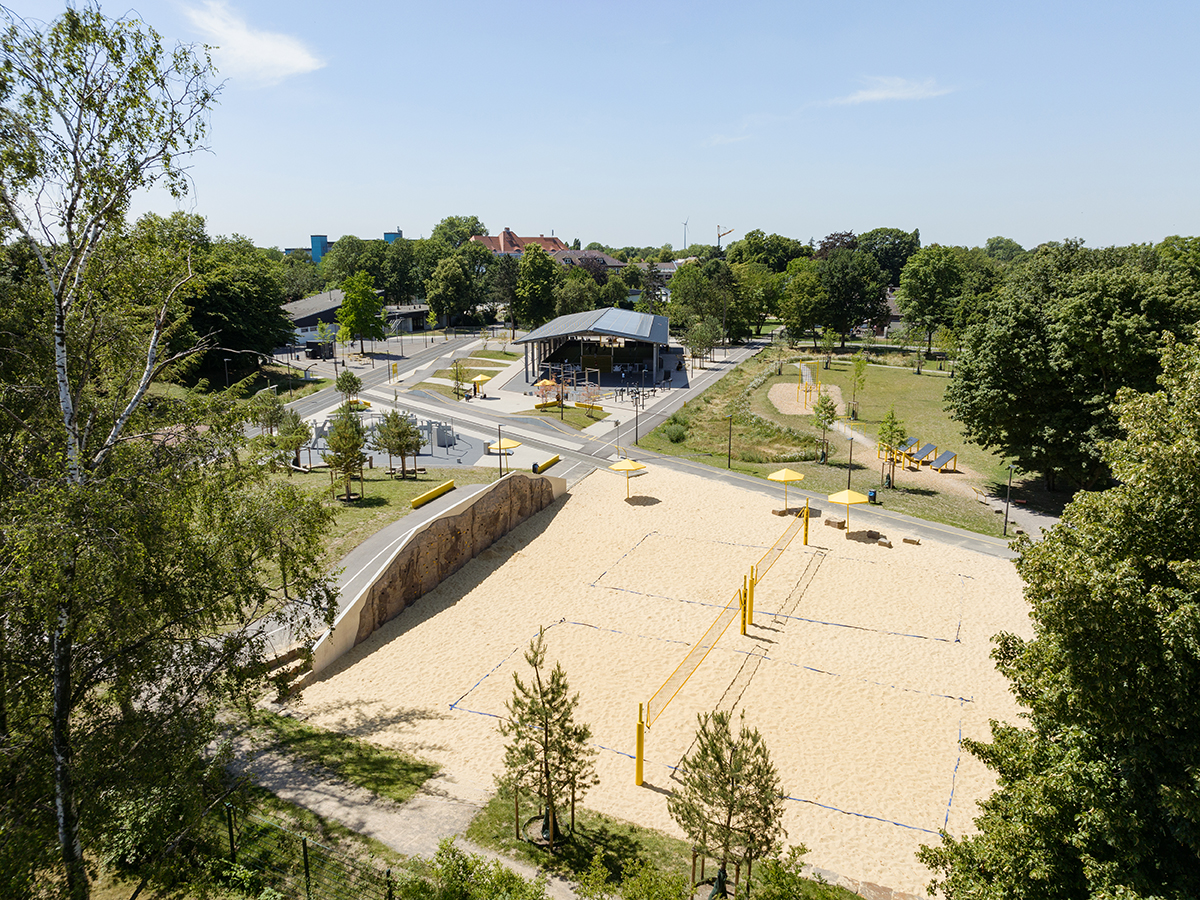 The new sports park, located on the site of a former cinder pitch, was created with the support of local clubs, residents, athletes and children from local schools and kindergartens. The diverse offerings including the Ninja Run, the beach volleyball courts, the interactive goal wall and the variety of outdoor fitness equipment are integrated into a flowing and connecting landscape designed for diverse activities and encounters.