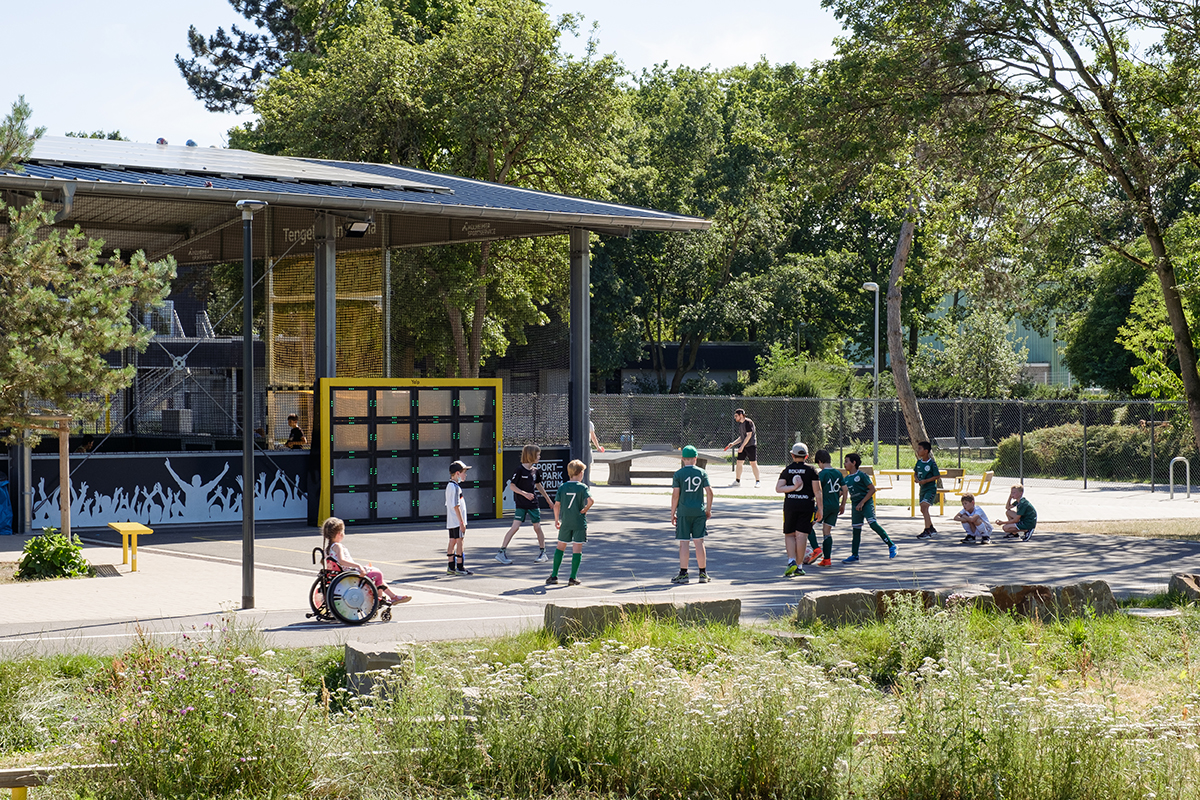 The accessible Styrum Sports Park appeals to people of all ages, social classes and cultures. It is a park for encounters, shared experiences, sport and exercise. All activities in this public space are free of charge. During opening hours, there is a programme of courses and events, and local street workers regularly come and use the sports park as a contact point. It is an important social space in the neighbourhood.