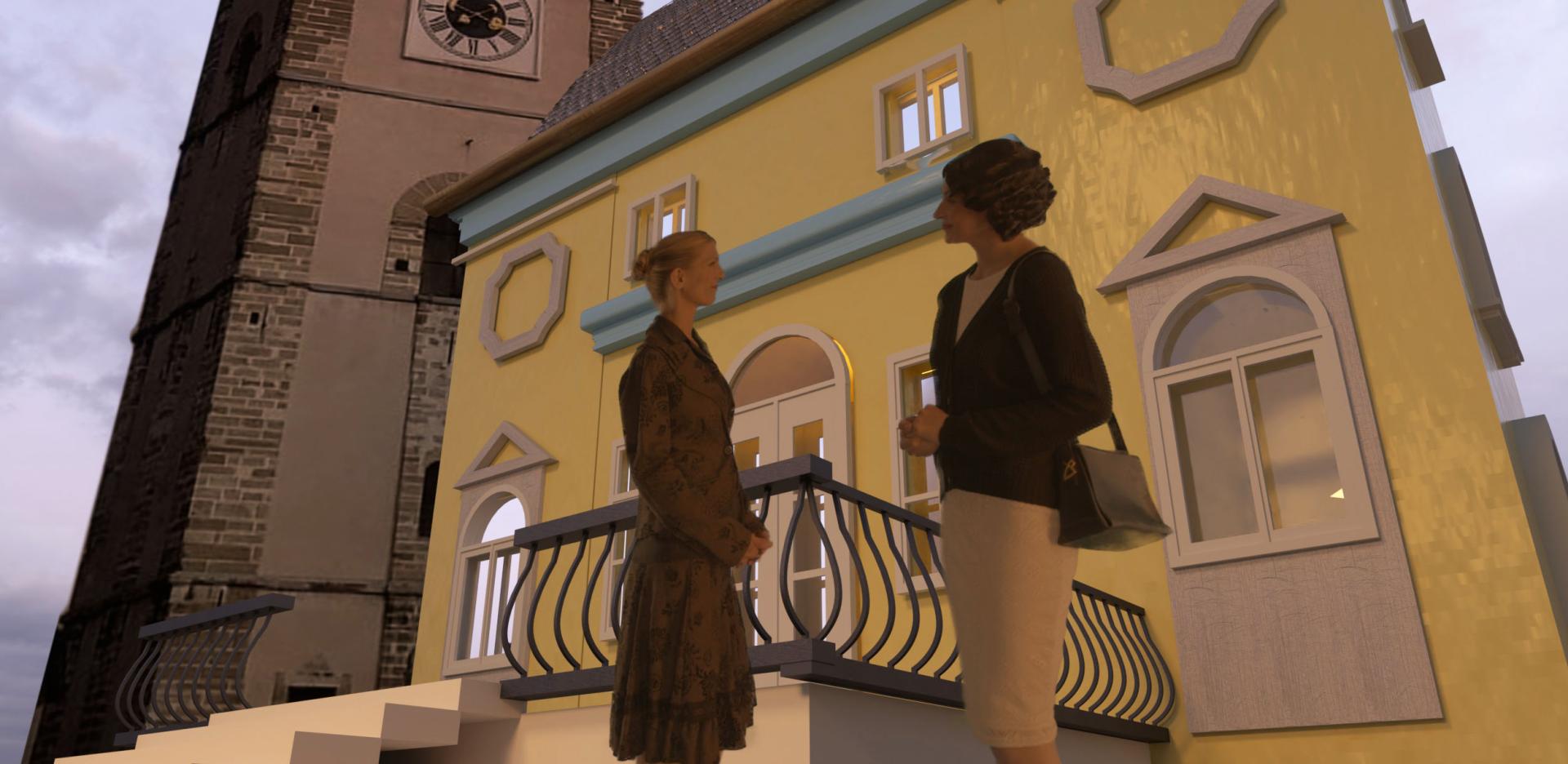 The visual component of the project presents the city of Ptuj in the 1960s. Due to the digital aesthetics, the virtual reality appears as a "washed" reality. Colours and textures are strictly chosen to positively influence the users' perception. Architecture and urban design are reminiscent of the 1960s, but with a softer feel. The sound is built up by supposed dialogues in the street (made up of newspapers, history books and stories of the elderly), sounds of nature (animals, trees), traffic and work. Folk and at the time popular songs performed in the streets add the icing on the cake.