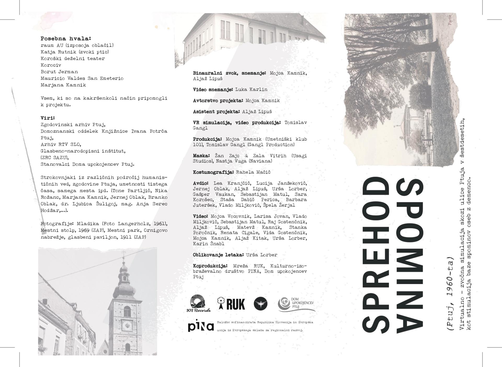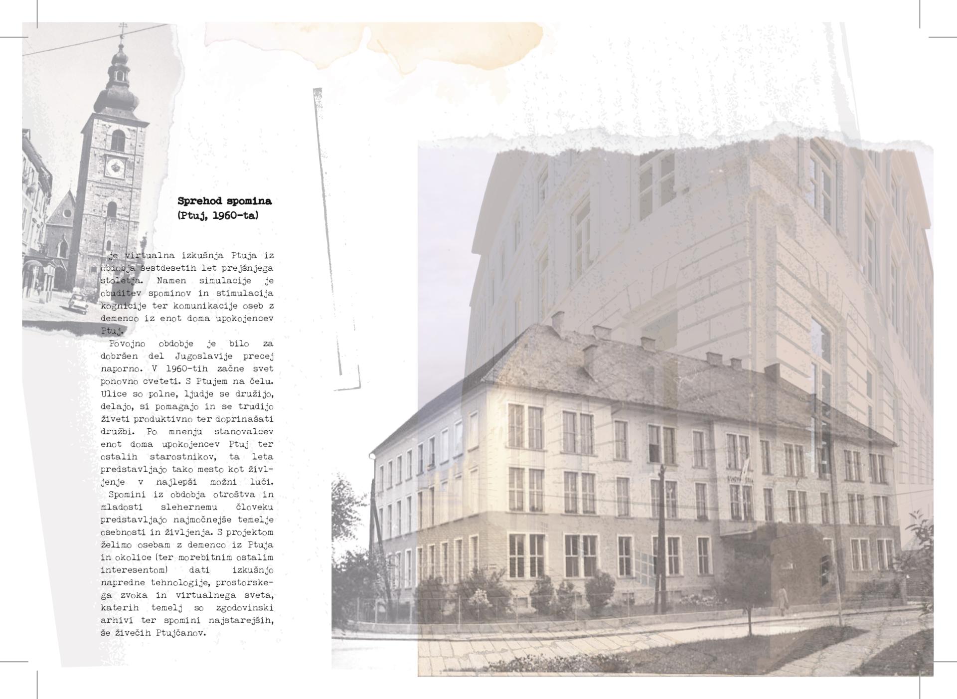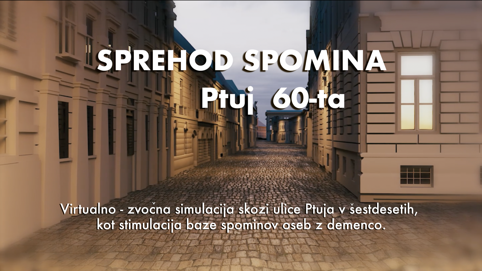 Walk of memory is a virtual simulation of a walk through the most populated streets of Ptuj from the 1960s. The walk includes the urban planning features of the period, as well as the appearance and rituals of the people on the street with a binaural sound. The aim of the project is to bring people with dementia from Ptuj closer to the time of their youth in terms of relaxation and cognitive stimulation.