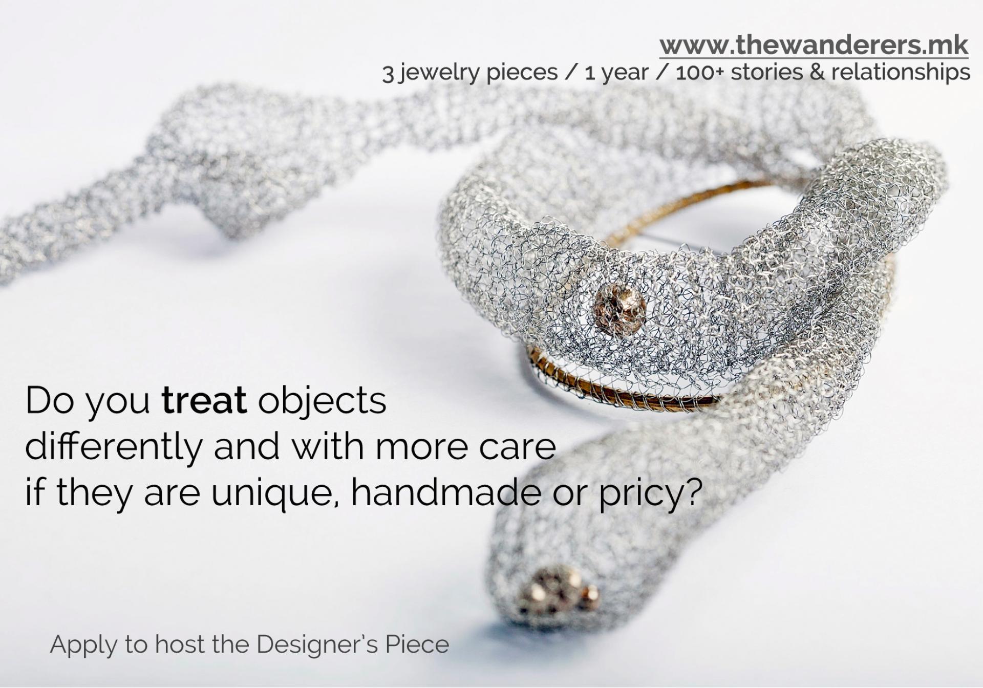 'The Stories of the Three Wanderers' was a social art participatory project meant to unveil various perspectives of relationships we build with each-other, through or with objects that surround us. It was constructed as a travel log of three jewelry pieces, that wandered the world for 1 year, from host to host, and collected experiences, stories and adventures. Regardless of our awareness, all things we interact with come with a previously embedded emotion or story, that affects our relationship with it. This log explored all of these connections: maker – wearer, past wearer – present wearer, object – person. The work itself was the journey of the pieces, changing context and environments, reflecting on host's personality, behaviors, routines. All of the experiences (documented with writings, photographs or videos that hosts shared) from each 'visit' were collected and regularly published online as a digital diary, presenting how each host adds value and meaning to these little works of art.