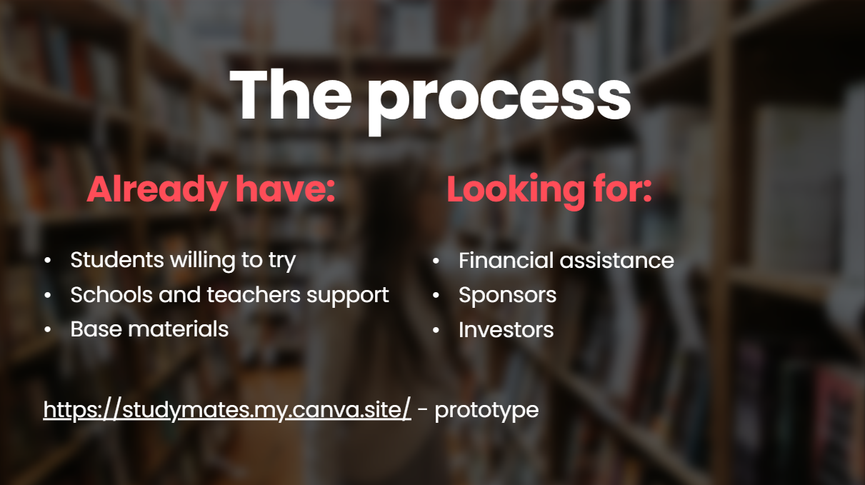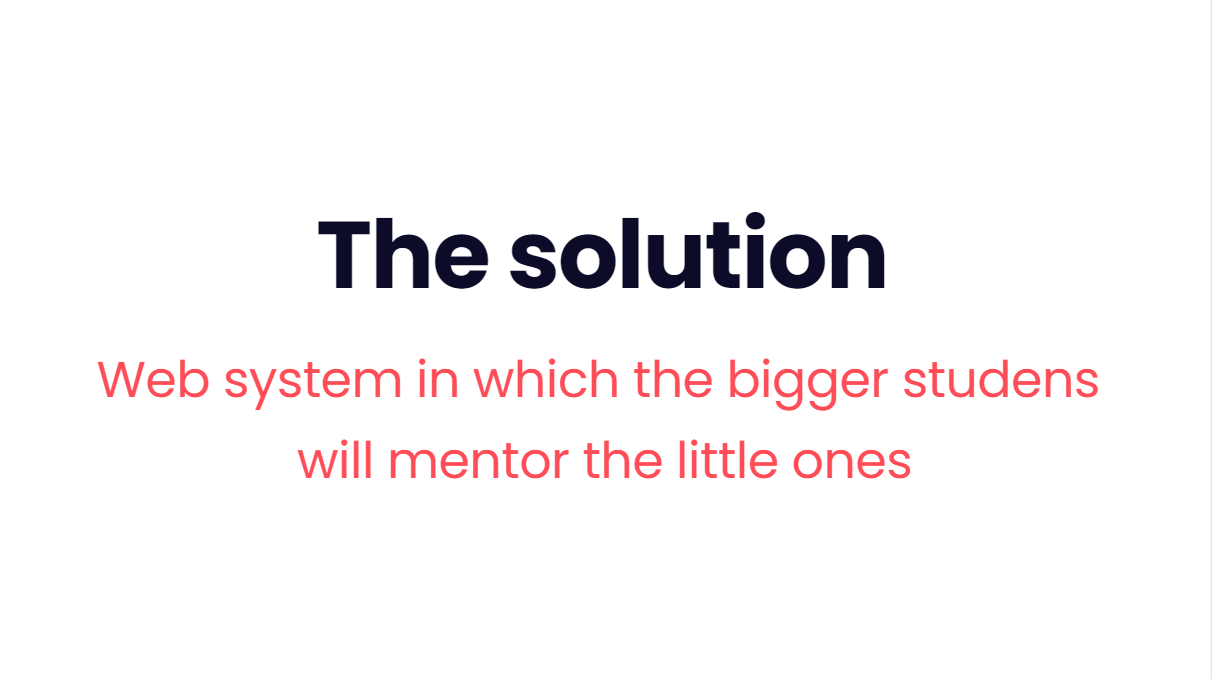Therefore, I decided to create a web system called StudyMates in which the new students will be finding their own mentors from a bigger class to help them with getting used to the school. For the first version of the project I am going to start with my school, but then there will be a subscription for the web system and I will add the other schools. Each one of them will have its own platform so that the kids can choose from a list their own school and sign up for a mentor. I will match the little student with the bigger one based on surveys with the aim that their characters can match and to create the perfect team. In the next version the matching is going to happen with machine learning. The little students will be able to rate their mentors which will be getting a scholarship based on that rating - the higher the rating, the higher the scholarship will be.