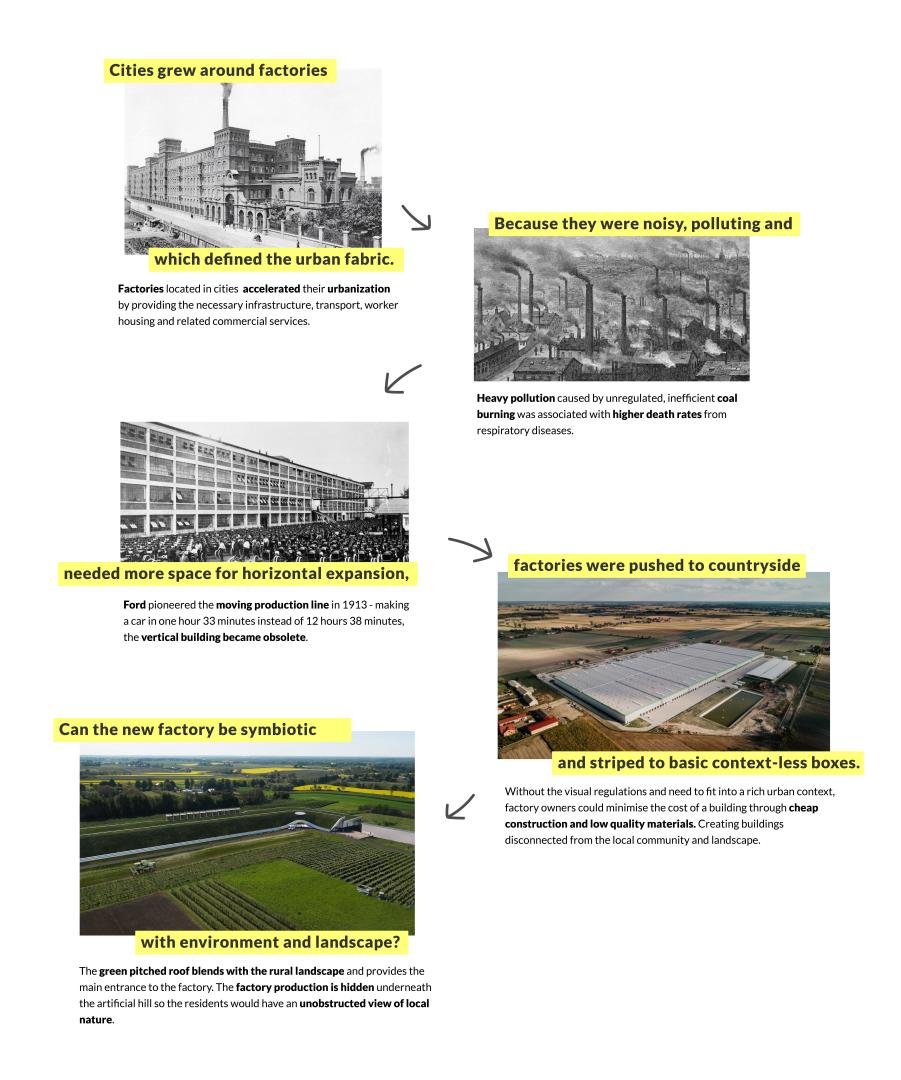 Cities used to grow around factories which in a result defined the urban fabric. At the beginning were vital for rapid development. From the other hand cities provided necessary infrastructure, transport, workers etc. Soon it became clear that factories located in cities were associated with growing death rates from respiratory diseases. During second industrialization phase (automation) the new factories needed more space for horizontal expansion. As a result were pushed to countryside. Due to lack of the visual regulations entrepreneurs could minimize the cost of the building itself through cheap construction and use of low quality material. That way we ended up creating huge amount of large context-less buildings disconnected form the local community and landscape. Here comes the elephant in the room: Can new factories can symbiotic with environment and landscape? And how to combine that dream with fully functional and economic design that would serve as a real alternative not only for its core functionality but also as a important object that interacts with local community (mixed usage).