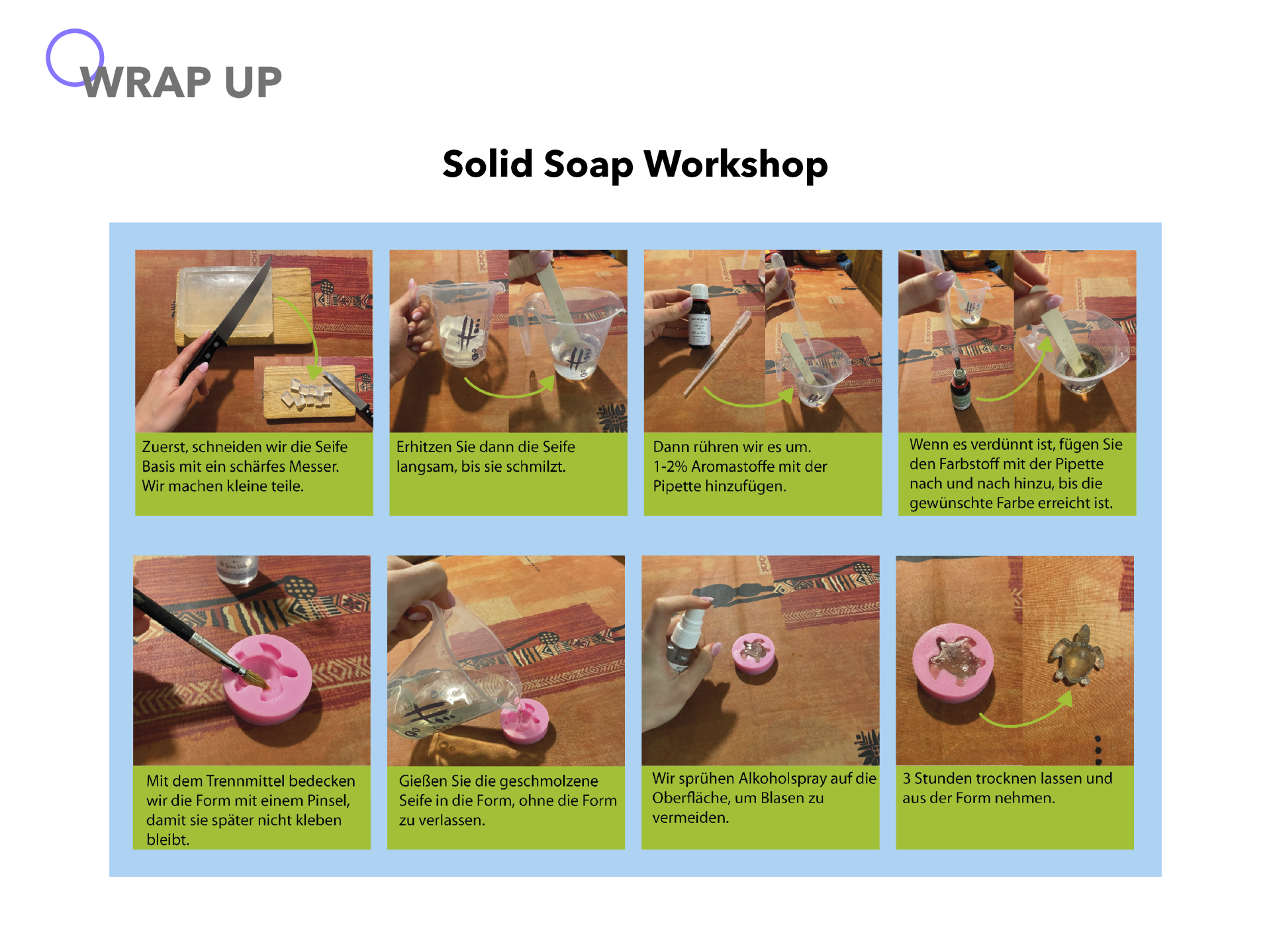 To meet such objectives kids will be taught during this workshop the importance of plastic pollution and its consequences (showing in a cartoon video how the main character, a sea turtle, loses part of his shell after ingesting plastics at sea). The education on bathing habits is also covered by this video, following the recommendations of skin-care experts and dermathologists. Finally, the kids will be taught in a solid-soap workshop how to make their own soap, giving them the opportunity to get used to solid alternatives and avoid plastics.