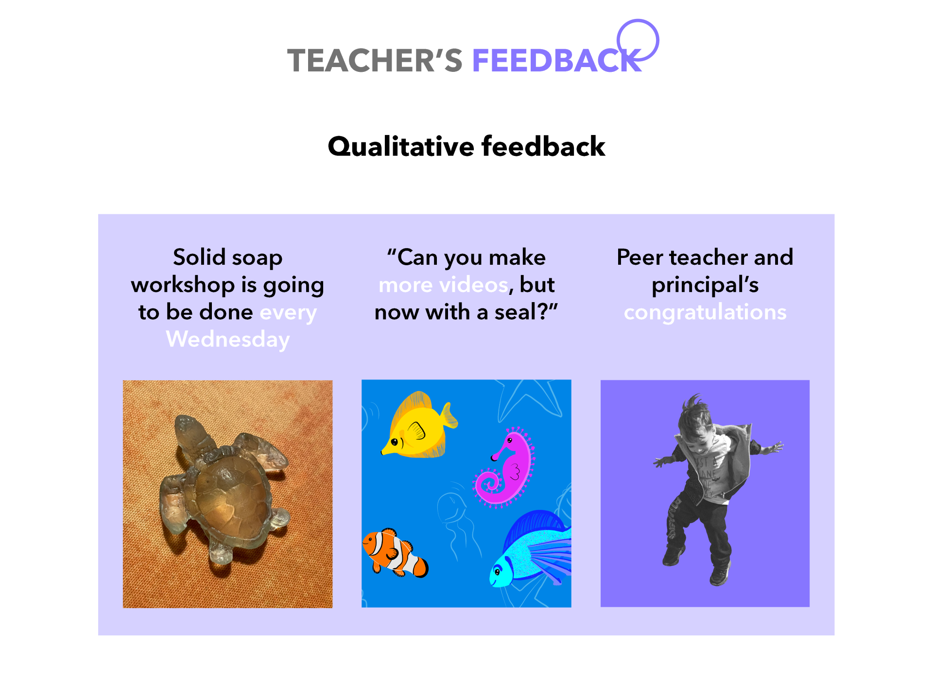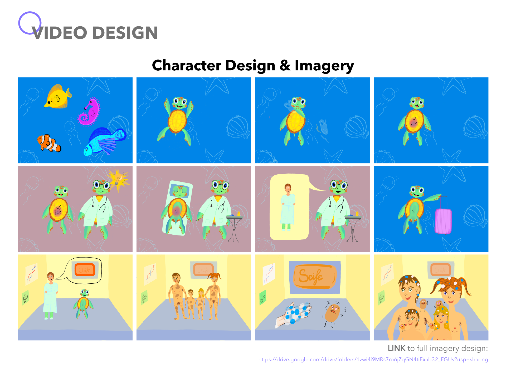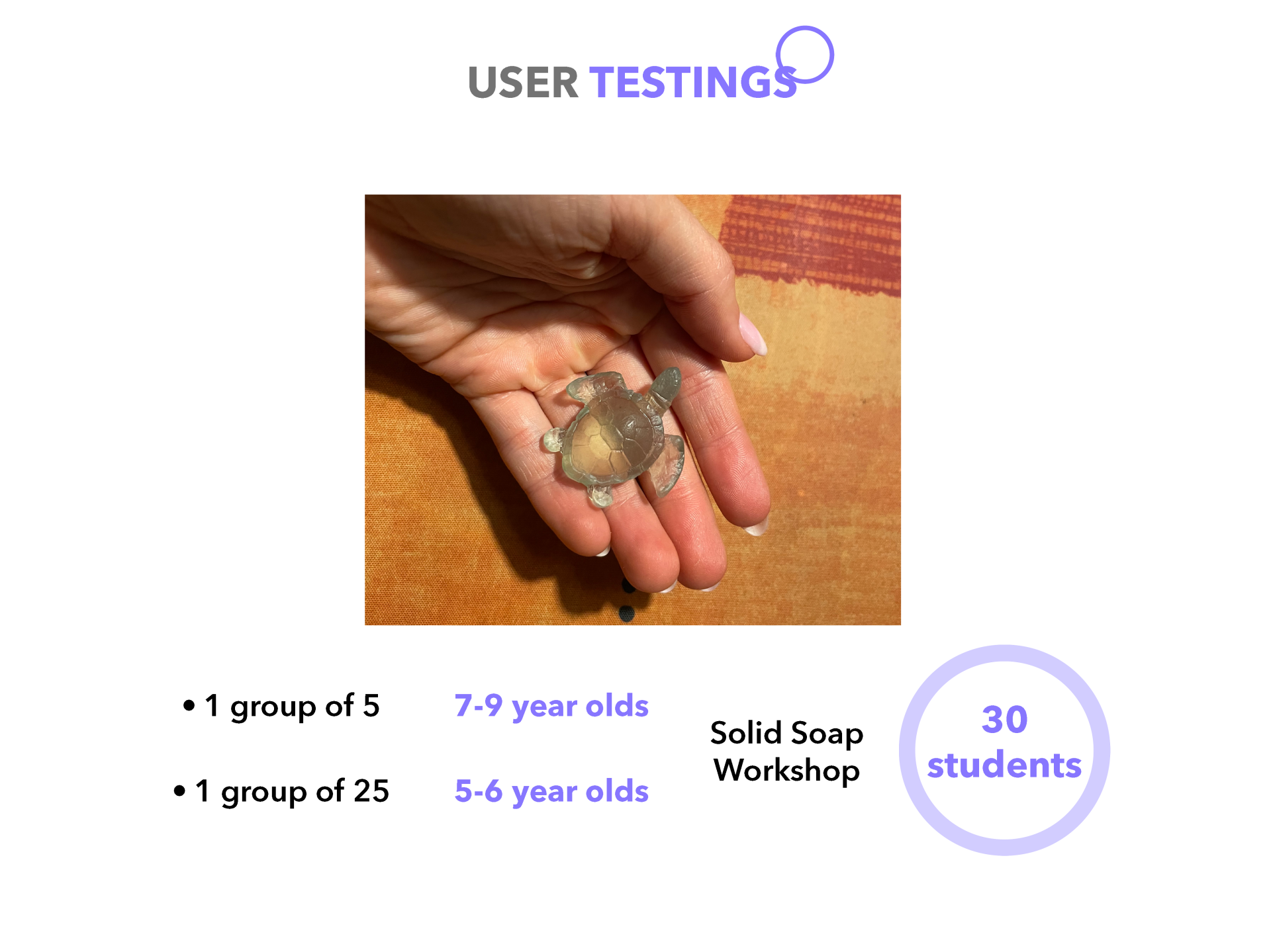 To fill in this gap, a set of prototypes were created. Focusing on the main learnings, a video narrates the story of Sam, a sea turtle which, by accident, ingests plastics that were lingering around at sea. Sam must get a surgical intervention tu survive, and during the process part of his shell is lost. When Sam wakes up, he is explained that that part of his skin is no longer protected and he must now travel to the human world to learn from dermathologists and skin-care experts how to take proper care of it. This video is followed by a set of dynamic activities to help retain the content, and it is all then wrapped up in a solid-soap workshop to allow the students to "see" what a soap must contain and to give them something to take home, where they can continue to apply the learnings.