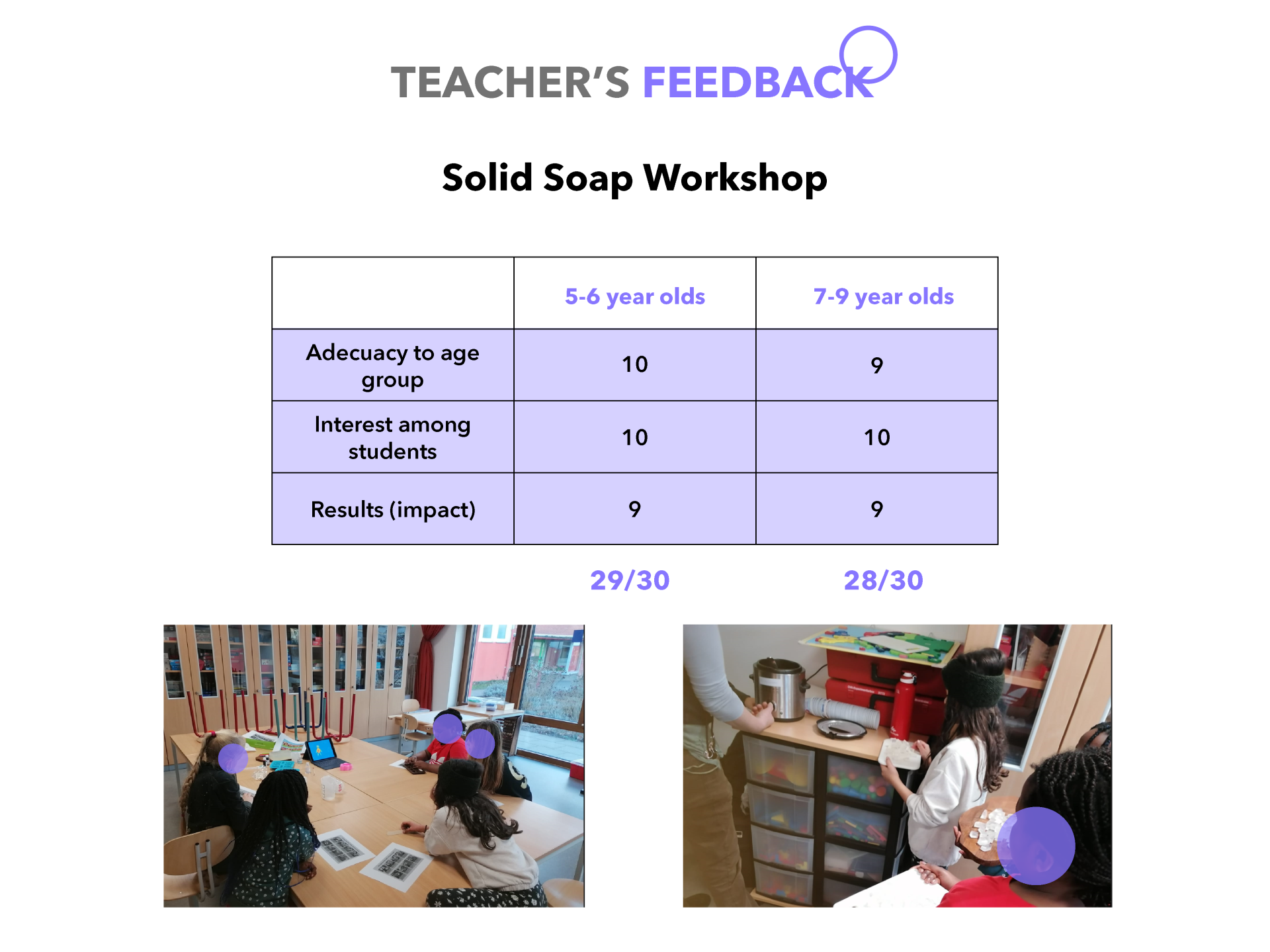 The methodology used for the "learning by doing" activities is also something that could be replicated to any teaching activity, and the solid soap workshop could also be taken and copied as a "hands-on" activity to complete a teaching and learning process.