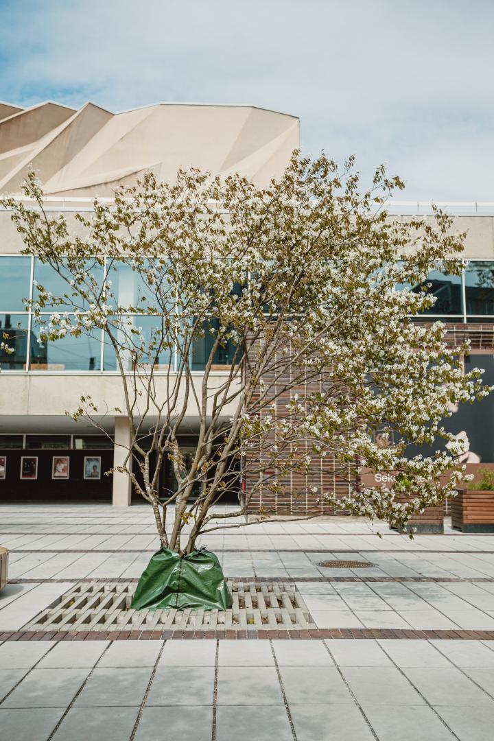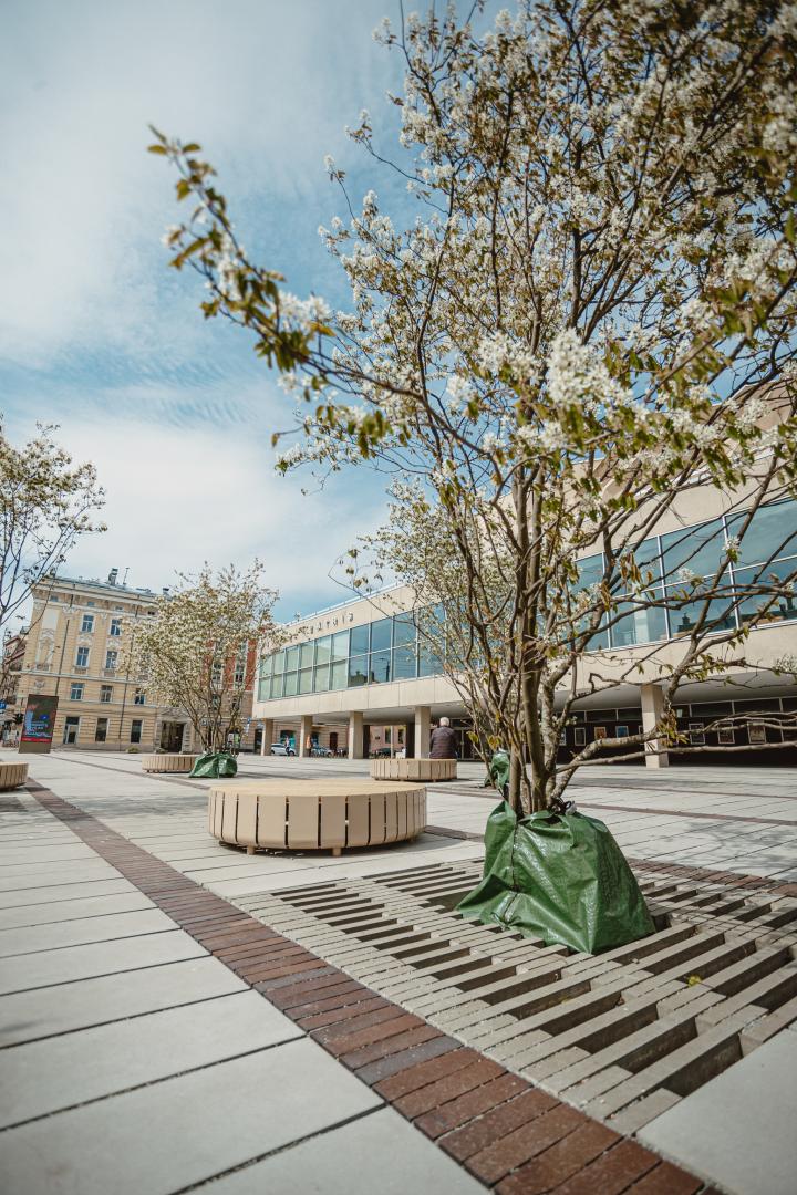 Taking advantage of the site's configuration and topography, a green rainwater infiltration area has been created at the lowest point of the site. Rainwater running off the site passes through layers of soil, effectively filtering the soil. This innovative solution serves a dual purpose by relieving the rainwater drainage system and enhancing the microclimate in the Square's recreation area. The project incorporated an existing rainwater filtration system in the Dailes Theatre Square, with two external gutters allowing rainwater from the roof of the vestibule to fall into boxes of stone rubble. This landscaping solution has been preserved and complemented with appropriate moisture-loving plants. Additionally, a drinking water tap has been installed in the square, providing visitors with a convenient way to quench their thirst. In terms of environmental considerations, lighting on Bruņinieku Street and Šarlotes Street adheres to Green Public Procurement requirements, ensuring environmental sustainability. The project also focused on preserving the principles and materials of theatre architecture to maintain the historic and cultural significance. Historical glazed bricks dismantled from the Square were repurposed as roofing for the former cash house. Existing supporting walls, especially those in critical tree root protection zones, were retained, repaired, and incorporated into the newly built improvements. Original concrete flower boxes were restored and reinstalled in the Square. As part of the landscaping, historic brick paving was dismantled and embedded in a single strip along the entire length of the Square. Granite paving was reused along Brīvības Street, where the volume was sufficient to implement the project's design solutions. Granite slabs and steps were dismantled, stored, and reused for landscaping purposes. A ramp and three stairs were constructed to provide easy access to the hill, utilizing reclaimed granite steps and slabs for the stair treads.