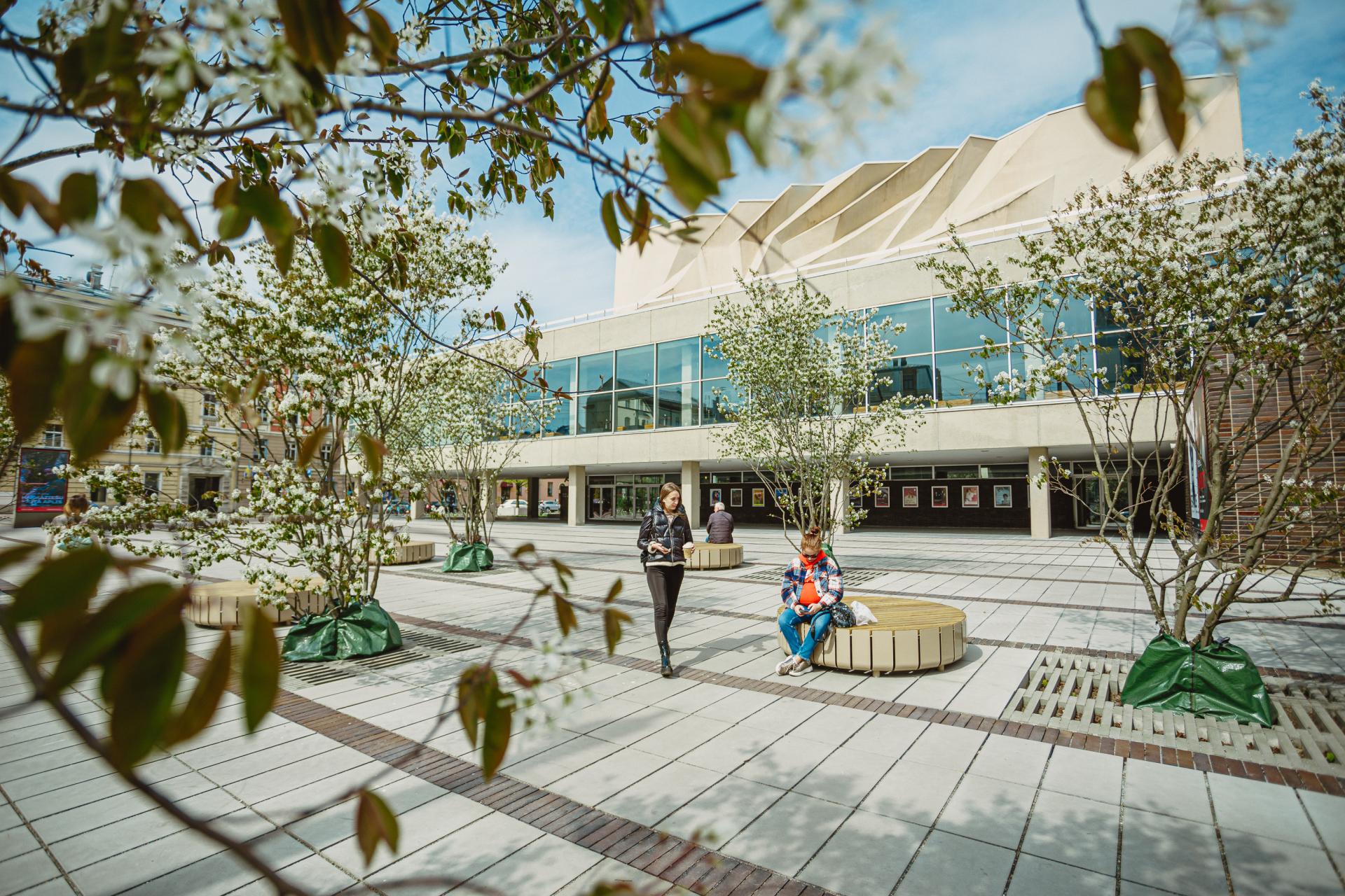 The aim of the project was to preserve, protect, and develop significant cultural heritage based on local government development programs. It also sought to enhance existing functions and offer newly created services at cultural heritage sites. The bold lines of modernism did not necessarily contribute to a safe and inclusive urban environment, as was the case with the Square of the Theatre of Beauty as an architectural masterpiece. The composition of the surrounding environment was challenging to reach and uncomfortable to use. The passage of time had been ruthless, and certain elements of well-being were not just depreciating but also hazardous. The Dailes Theatre Square, conceived as an urban gathering spot within the Theatre Square, respects the original pavement divisions and materials characteristic of the Square. The outdated terraces and steps were leveled and adapted for easy use and free movement. The recreation area bordering Šarlotes Street saw the development of a pleasant microclimate with sufficient greenery. New trees were planted to complement and eventually replace the existing ones. Platforms scattered throughout the square serve as tree beds and comfortable platforms for sitting, lounging, and playing. The gallery under the vestibule activated pedestrian movement on the north-eastern end, reviving the area for routine commuting and transforming it into a striking black carpet before performances, where audience members arrive, meet, and pose for photos. The cost-benefit analysis projected a substantial increase in visitors, reaching 14,338 in 2023. Aligned with the Riga Development Programme 2014-2020, the reconstructed square contributes to the UNESCO World Heritage Site "Historic Centre of Riga."