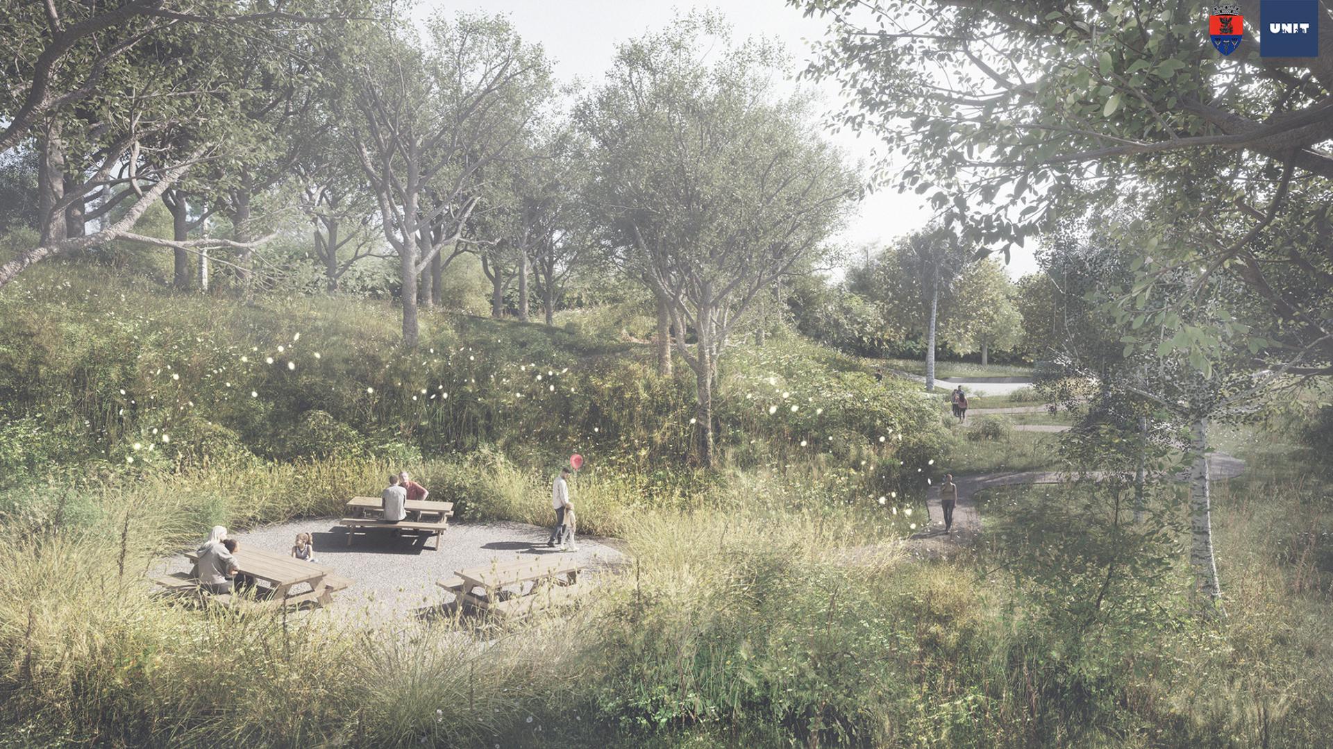 The space is designed with nature-based solutions and materials in mind. Alleys are built from compacted gravel and forest walkways are created out of stabilized soil.