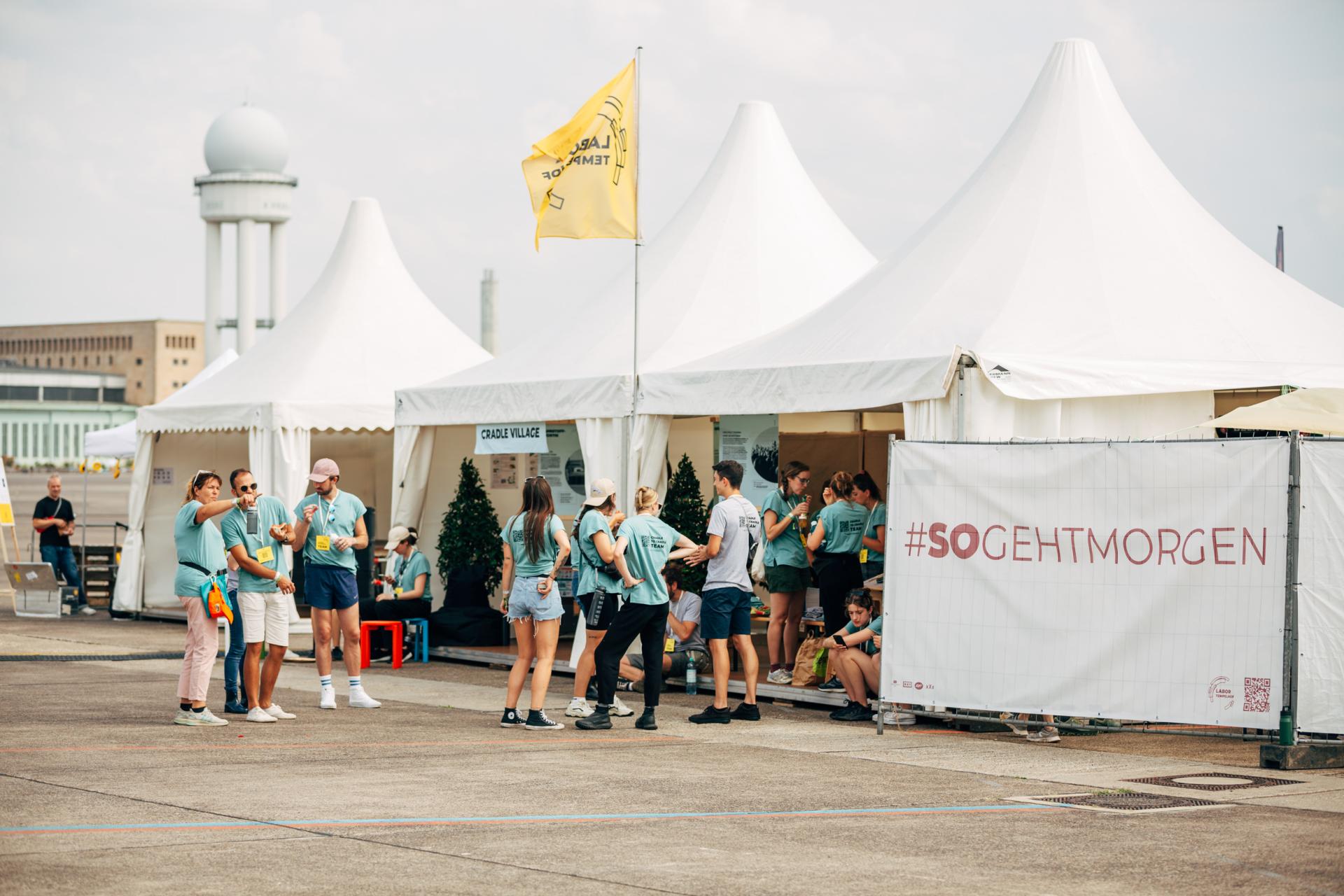 Against the backdrop of Tempelhof airfield and its brutalist architecture this project transformed the concerts into a colorful and inviting space for all and shows how existing and historically significant sites, including those protected as cultural landmarks, can be adapted for future needs. An information concept based in a “Cradle Village” spread across the venue to educate visitors and service providers on how the measures contribute to a concert experience without the need for a bad conscience and foster discussions before, in between and after the concerts. Multicolored informational banners illustrated the on-site measures, where the banners themselves from the fabric, supporting structures down to the utilized ink were composed of healthy and circular materials.
