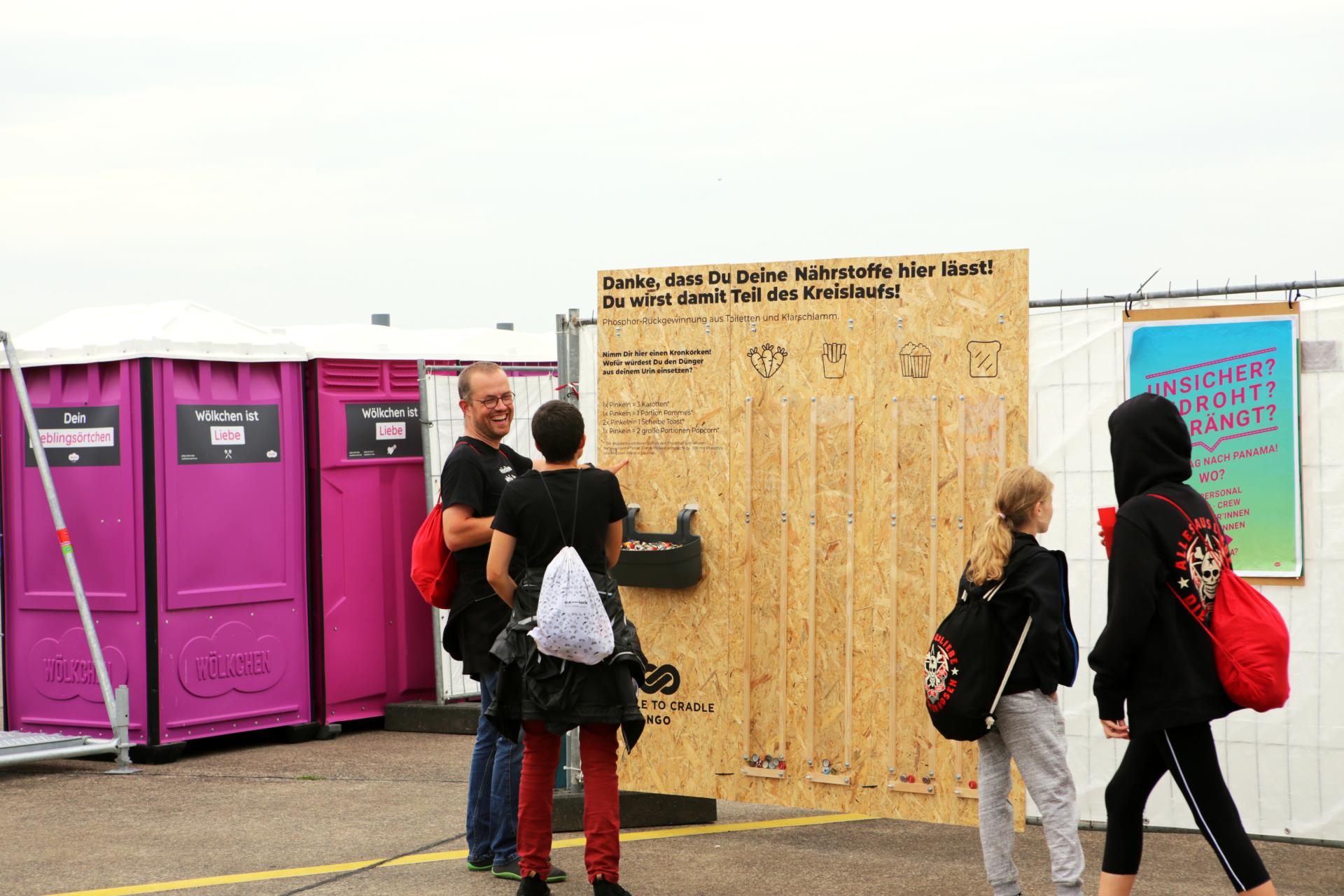 A multitude of the innovative solutions were made aesthetically pleasing for visitors. Out of the box approaches such as phosphorus recovery from the concerts’ toilets was illustrated using a gamified approach. Individuals could vote for the food item that should be grown using the converted fertilizer. Moreover, one hundred ambassadors acted as points of contact for the visitors during the concerts, wearing T-Shirts with an imprinted QR Code leading to further in-depth information on the project.