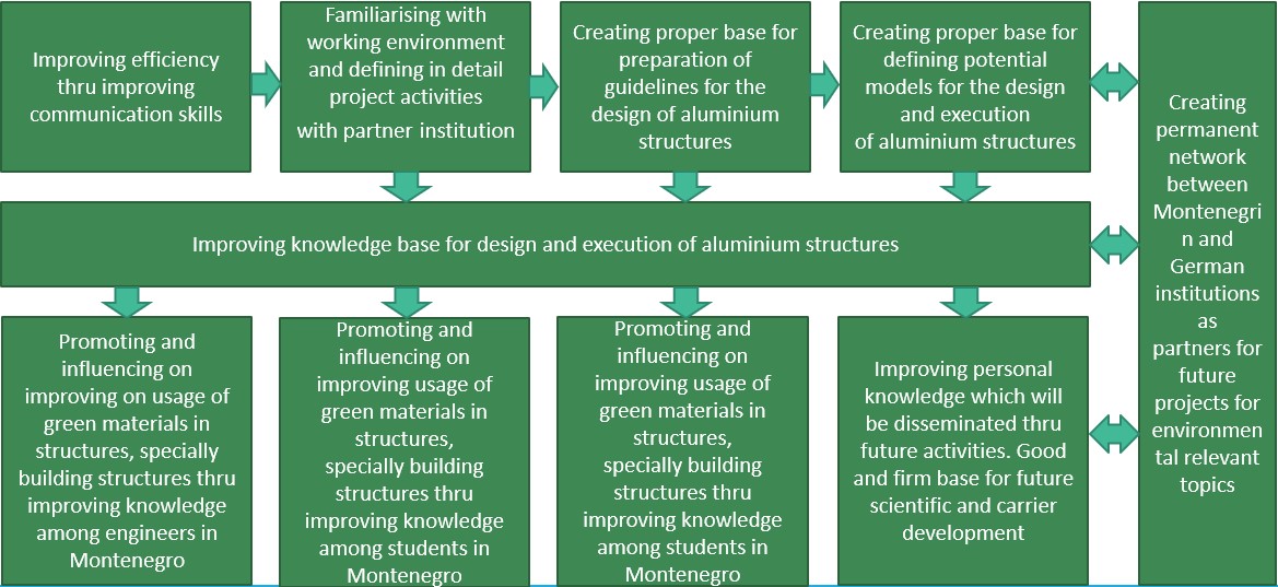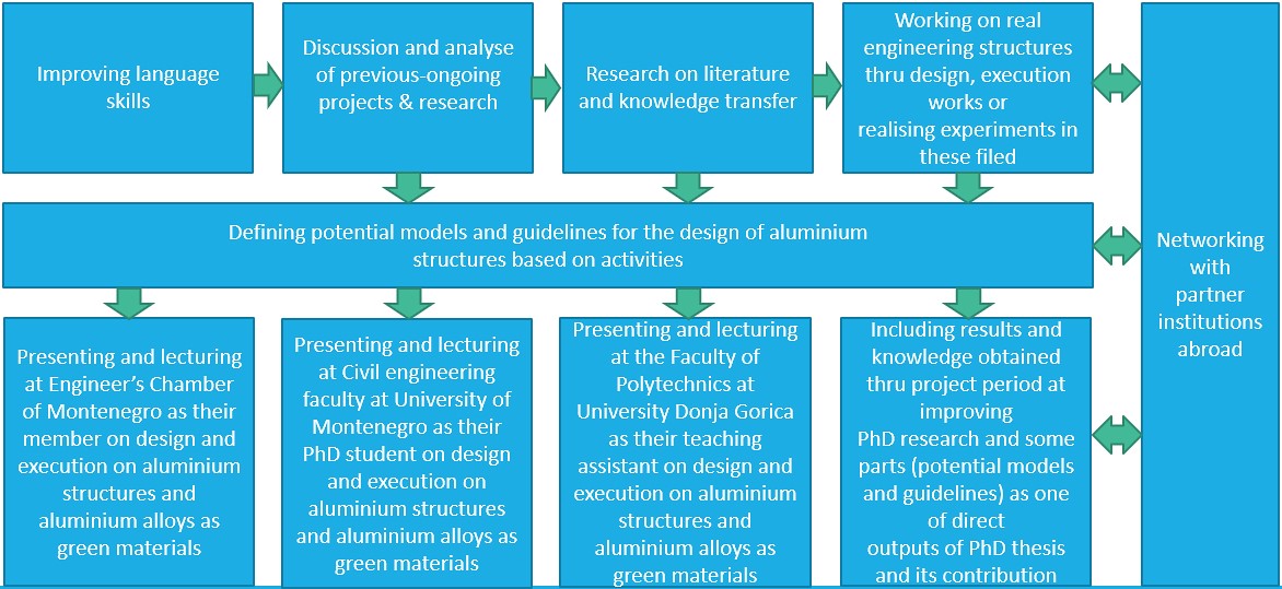 The way to achieve this aim is thru getting good practice in the application of aluminium structures, exchanging experiences and knowledge transfer as well as acquiring practical skills in the design of aluminium structures as there is a lack of experience in their application in Montenegro and Worldwide. This is achieved thru a research fellowship grant from the German Federal Foundation for sustainability for researcher and PhD student Semso Kalac. He is already half a year at the Technical University of Munich where is actively researching the application, design and execution of aluminium structures under the mentorship of prof. PhD Martin Menssinger and PhD Radlbeck. The knowledge transfer is organized thru direct communication and the exchange of ideas with supervisors, experimental testing of real models of aluminium structures and preparing guidelines for the design and execution of aluminium structures. The plan is to transfer knowledge in Montenegro to all interested parties in the process of designing and executing aluminium structures. The national stakeholders in this project are the Montenegrin Chamber of Engineers, the University of Montenegro and the University of Donja Gorica.
