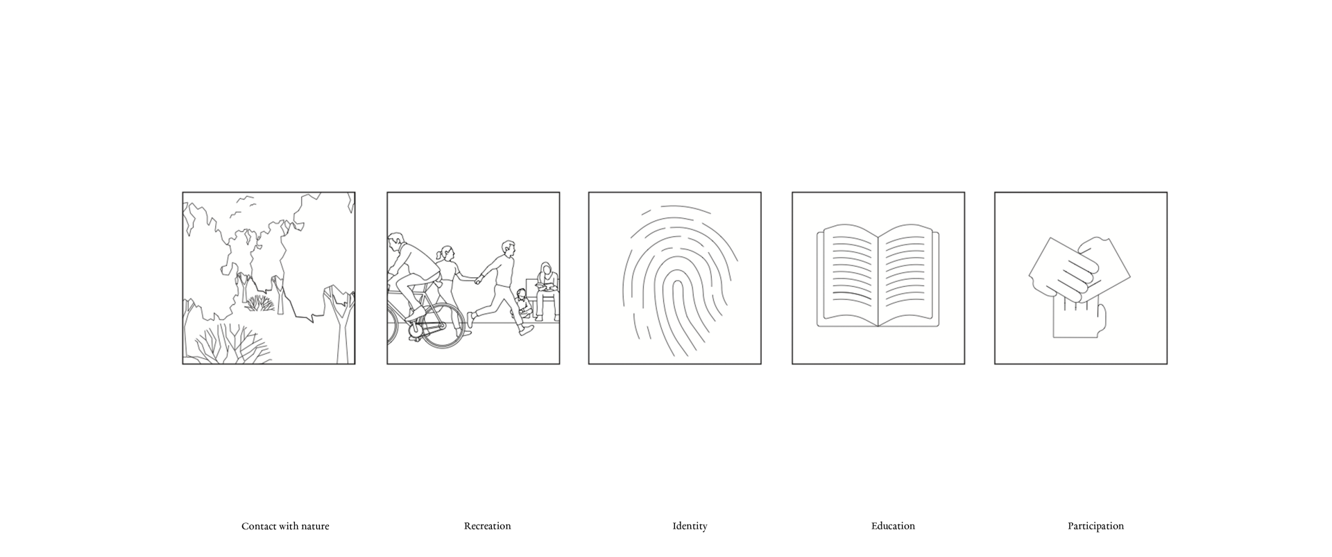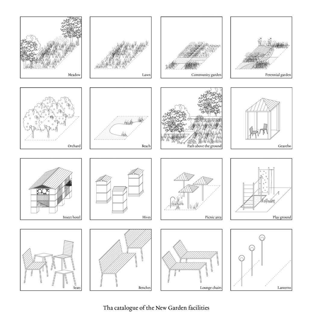 Another aspect of aesthetics was to create a catalogue of small architecture elements to achieve one visual language of added elements. The catalogue continues the general thought that was implemented in the strategy for the whole park, each zone has its own set of elements that highlights and complement the character of the space.