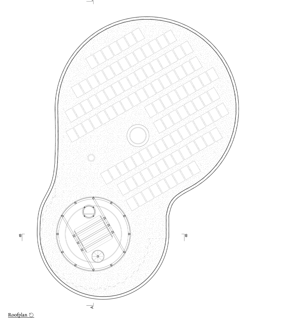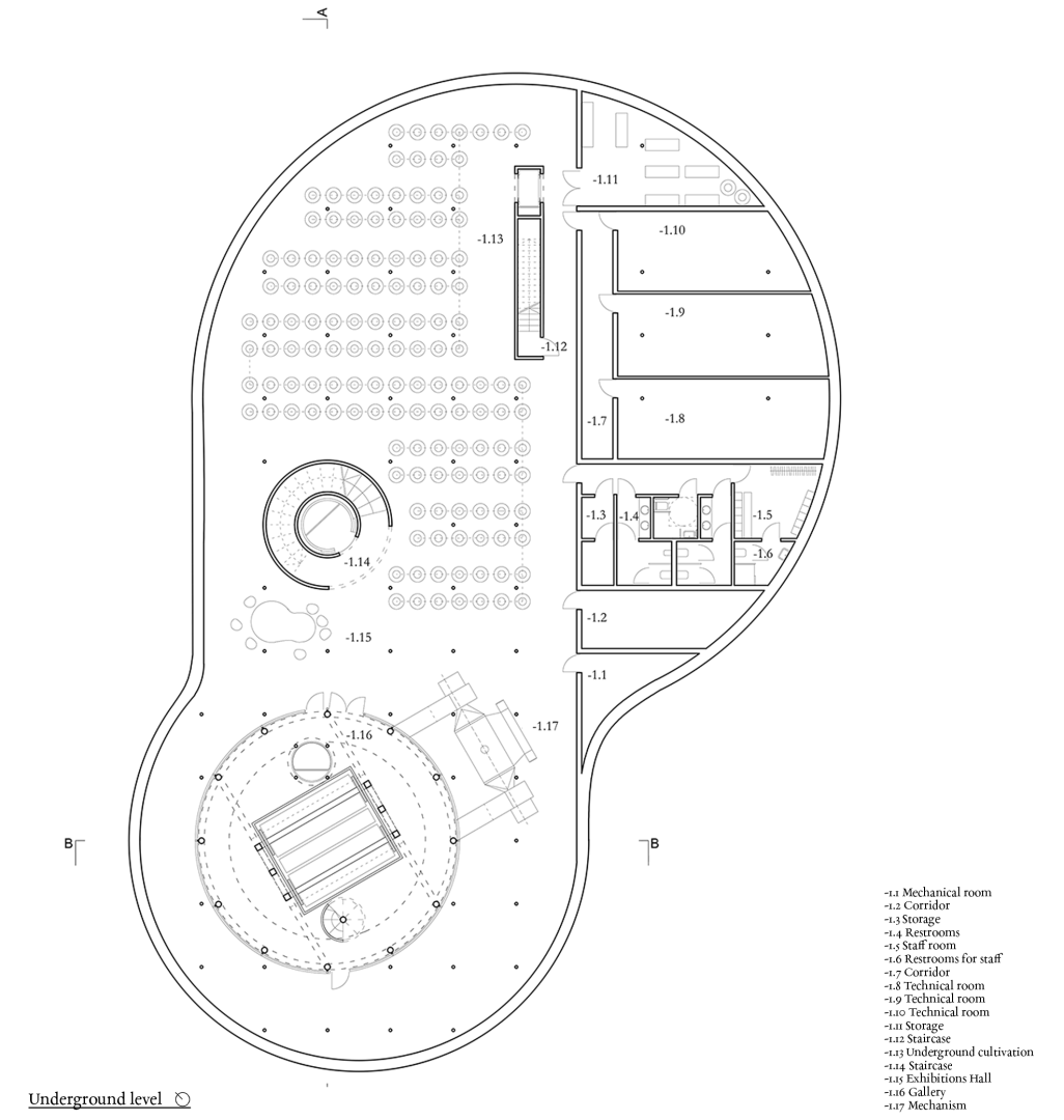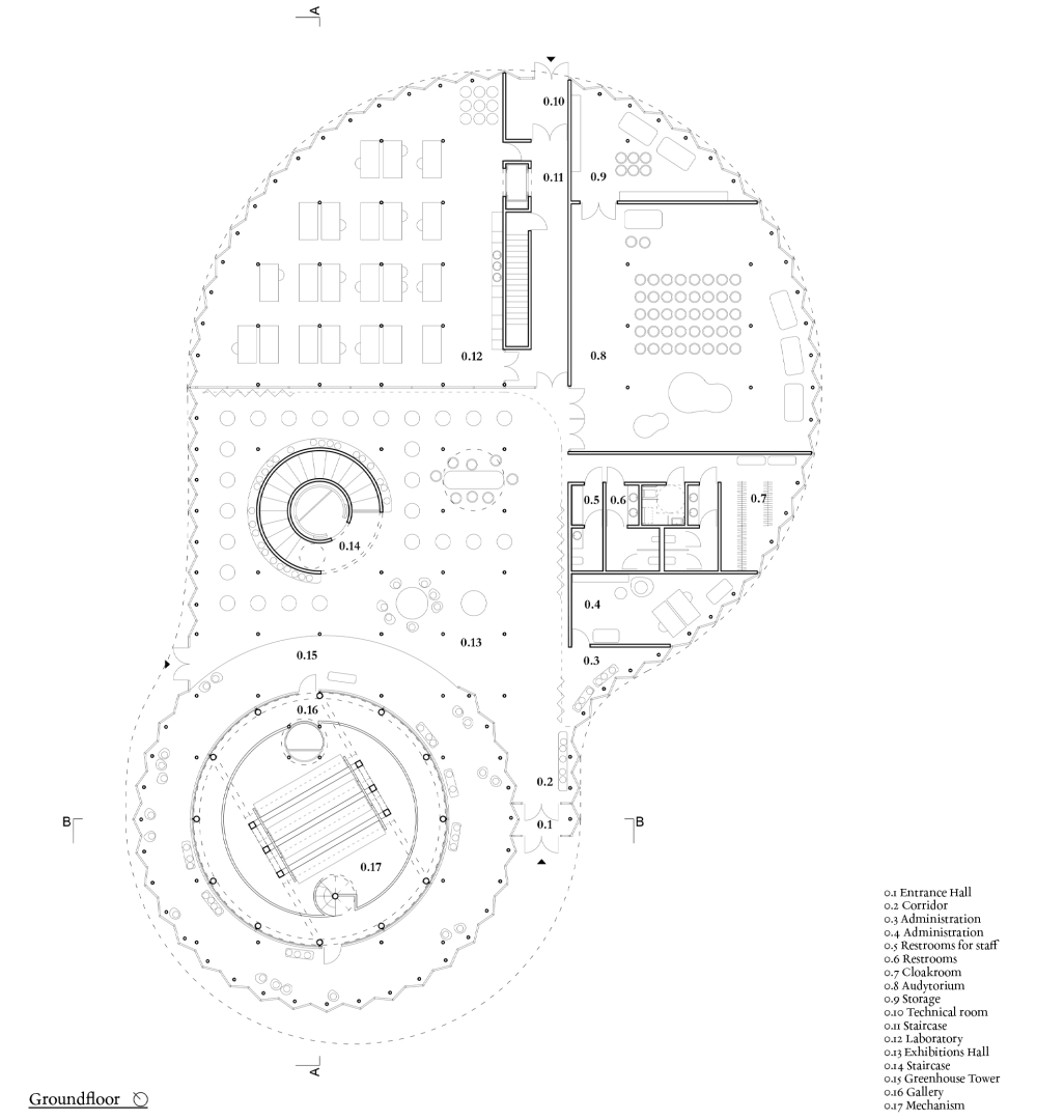 The building was divided into two parts. First unit is a glass pavilion that contains the social functions like the exhibition hall, auditorium and the laboratory, all paired with the accompanying facilities like restrooms etc. This part was designed as a glass, completely open structure based on steel pillars. The cylindrical Tower contains the hydroponics cultivation, an extremely effective in water and energy demand method - the crops are laid on the soil-free shelves that are in the constant movement going circulatory through the building, being soaked in the tank with water mixed with dedicated fertiliser, all the chain is moved by the elevator mechanism. The building is also based on the steel and glass structure. The glazing creates a greenhouse effect that is desirable for the plants. However, the walls are also equipped with the shader to provide protection against overheating and burning the plants with too intense sun exposition.
