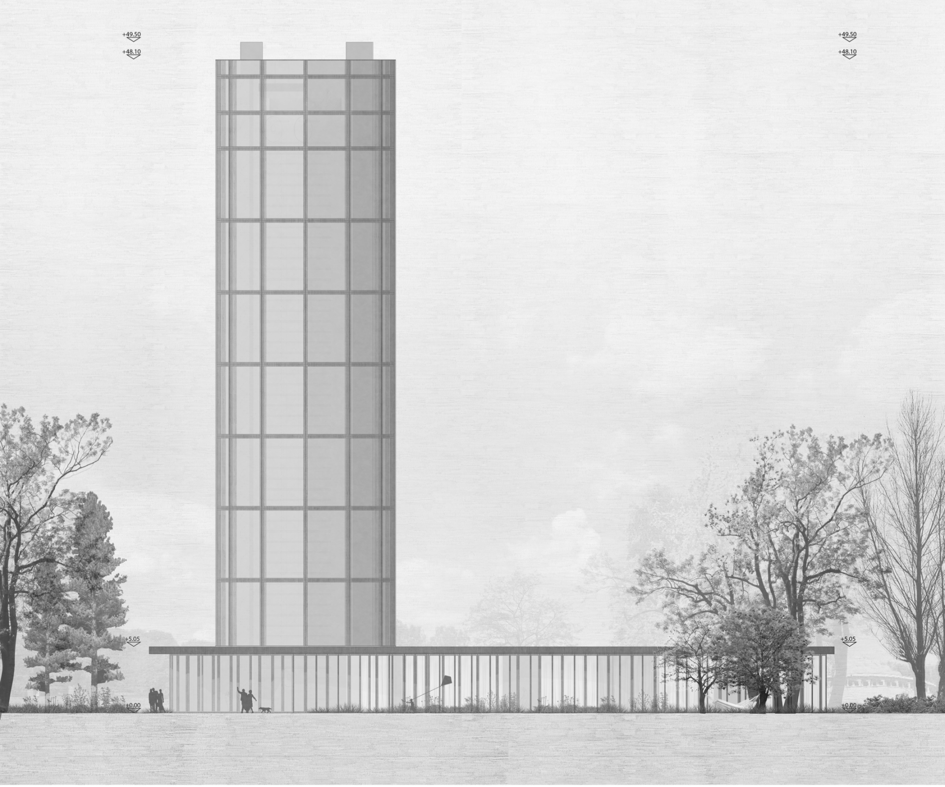The architectural design aims to restore the former Tower facility and to transform the area into a new garden. In addition, its technological aspect could be a continuation of the innovative heritage of this place and a direction for further development of vertical farming in the region. The architectural expression has been preserved, the new building has taken the form of a transparent cylinder, growing from a rectangular, glazed foundation, which in the new building has enlarged significantly to accommodate the new functions. First of all, the pavilion has been made available to visitors together with the tower part, which, in addition to the sightseeing itself, offers an observation deck. The building also houses an exhibition hall and a lecture hall. The facility is a light pavilion based on thin pillars with a fully glazed façade opening to the outside and blending with the landscape, offering a view of the beautiful surroundings.
