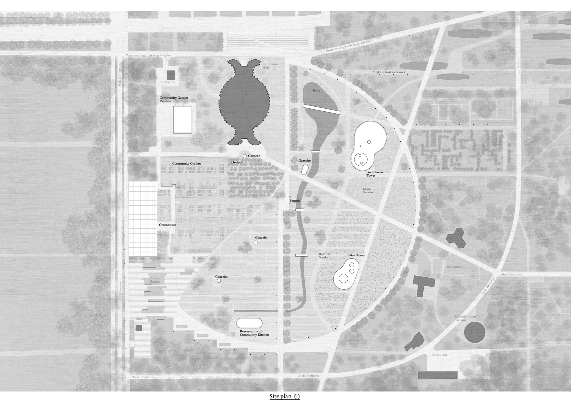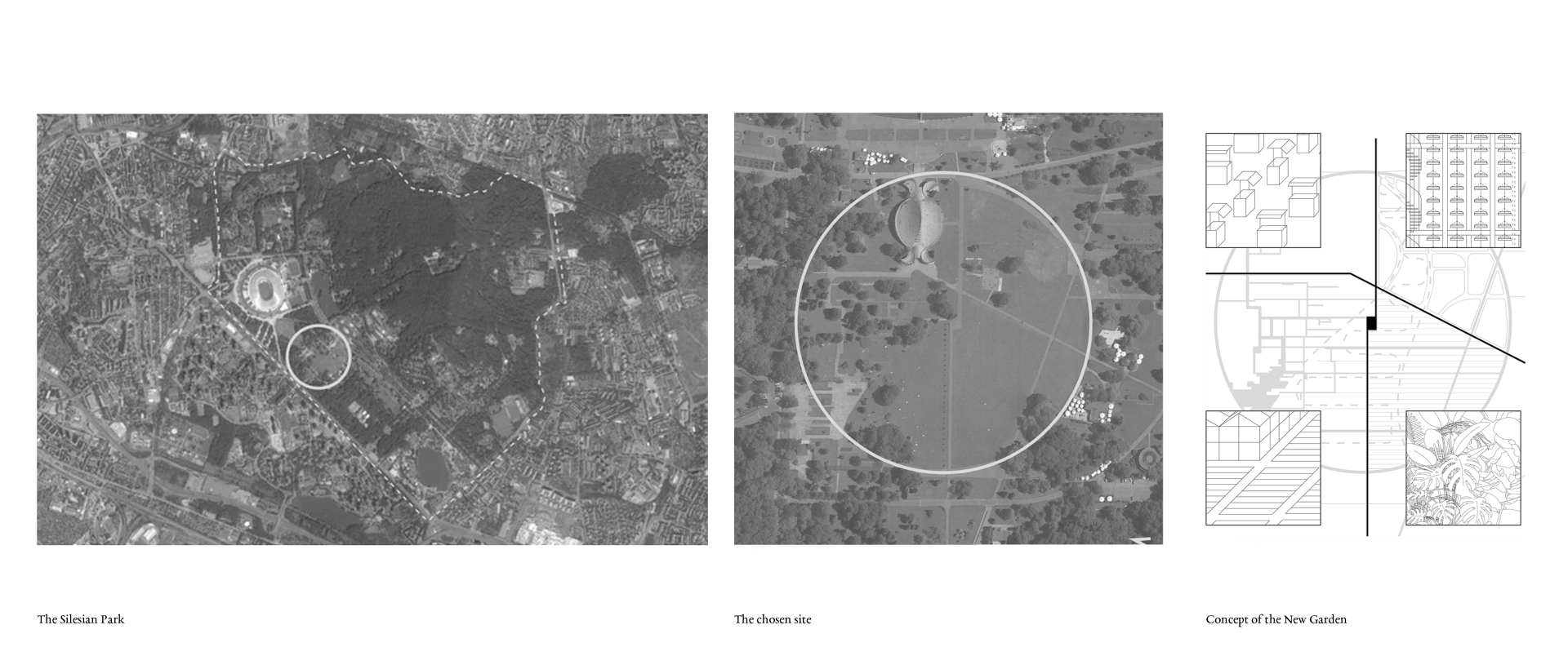 Today the Silesian Park of Culture has fallen into neglect and needs the strategy to bring back its genius loci. The aim of the project was to return to the roots and restore the tradition of this area as an innovative and education-oriented place for the profit of the whole region as well as the everyday users. The park is surrounded by many housing settlements that could benefit from the new facility. The neighbouring area is highly urbanised therefore the huge green space is a kind of oasis inside the dense city. However, the green space is not enough to provide the social values. The creation of the new garden is a prospect to bring more diversity (also biodiversity) into this space, create a place for cultivation - a community garden where people can grow their own vegetables or buy some on the market, and also learn how vertical farming works and how to benefit from it. Moreover, it is not a given place, it is more like a framework that will change and adapt in time. People can come and work, but also transform it within the soft boundaries that were created.