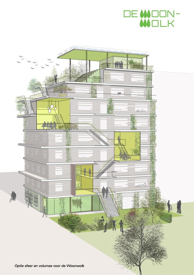 Among the most pressing global concerns are climate change, the social crises, loneliness, and lack of adequate housing. The need for rapid and meaningful action to mitigate climate change is evident, and starting on a local scale with sustainable production and construction is one of the ways forward. De Woonwolk addressed this issue by realizing a building with a low environmental impact by using bio-based, circular materials and by being energy-positive. Next to this, we foster a sharing economy within our future building by designing spaces to re-use and share materials and tools.