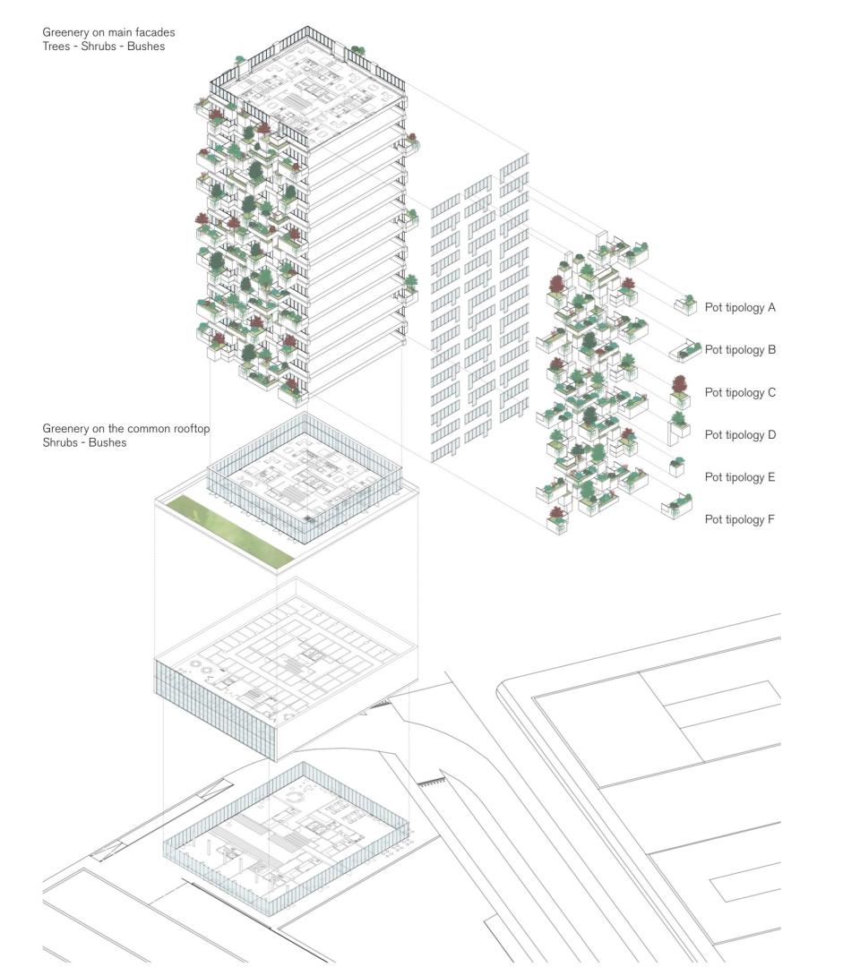 The design choices introduced in the Trudo Vertical Forest are mainly aimed at lowering construction and maintenance costs, meeting the needs of the social housing typology, thanks to the use of prefabrication construction technologies and more generally the optimisation of resources related to the design and construction of the building. In particular, the main structure is made up of prefabricated concrete modules and in-situ machined elements, while the design of the green façade exploits the combination of six types of pots, different in size and shape, specifically designed to house different plants, which allow for a great variety in design, as well as a significant reduction in costs and construction time.