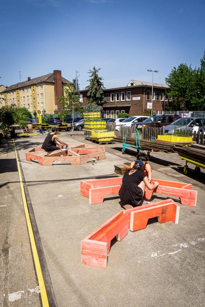 One of the core principles of tunstadtmachen, as a community place-making project, is to rely only on recycled materials for building the temporary (ecological) architectural structures. All of the wood and metal, even the screws, are resourced locally through neighborhood networks, second hand websites and finished furniture fairs. Our strategy to turn an unused parking lot into a green and activated public space involved building raised beds on tarmac from old water tanks, planting a variety of resilient vegetation donated by a local inclusive plant nursery and neighbors.