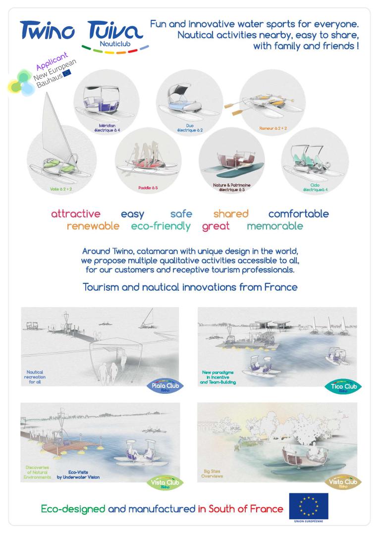 Tuiva éco design, manufacture and rent easy, secure, shared and fun browsing for everyone! Tuiva NautiClub is the first step for 90% of the population, who don't dare to go for all nautical leisure activities and/or discover environment ! The world as changed: We don't sell to the public the products (Twino) that we manufacture. We produce just in time the new ones wich we will need to rent during next saison in our Tuiva NautiClubs ! Each coponent is mono matérial fully and easily recycable !