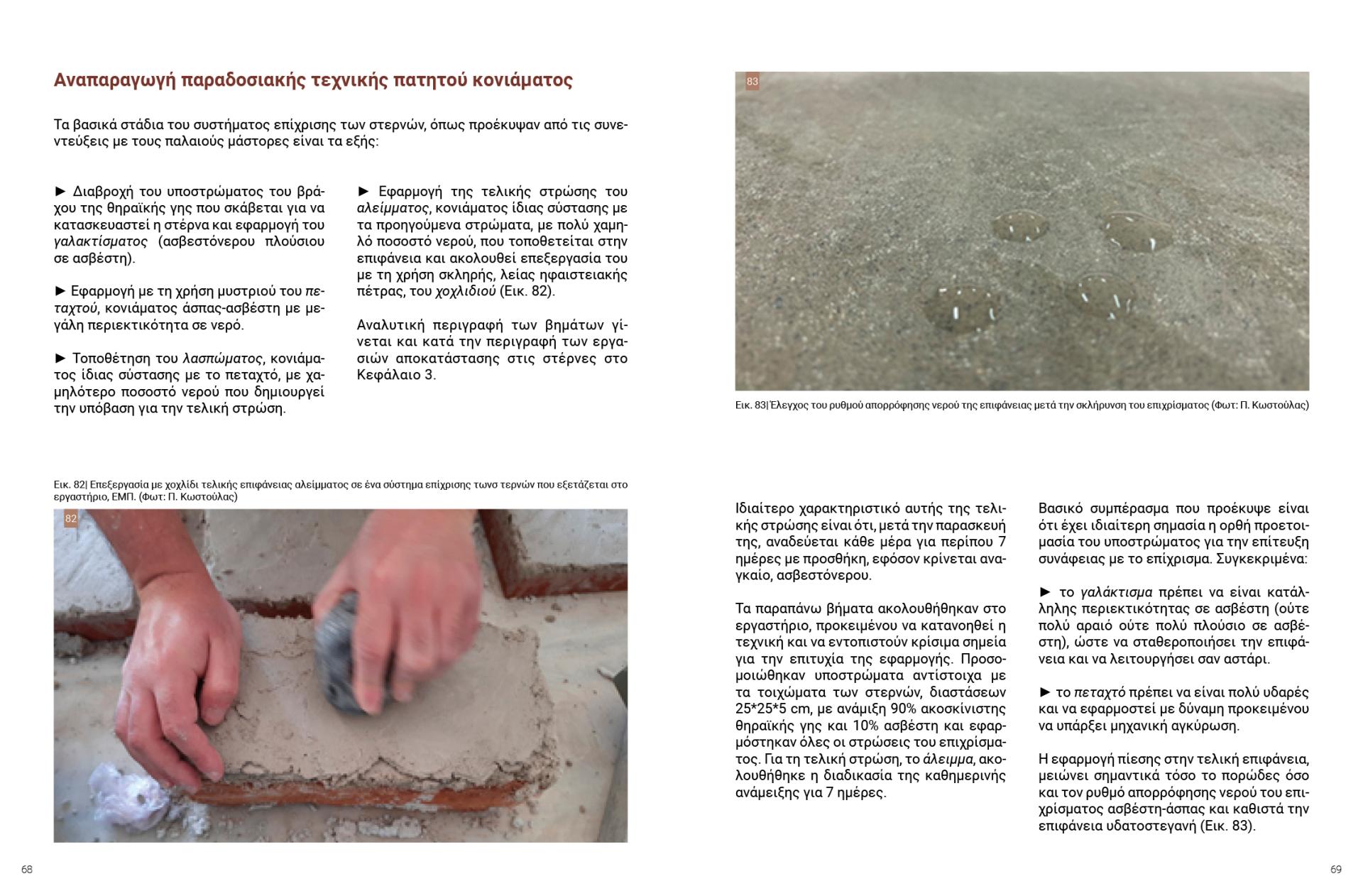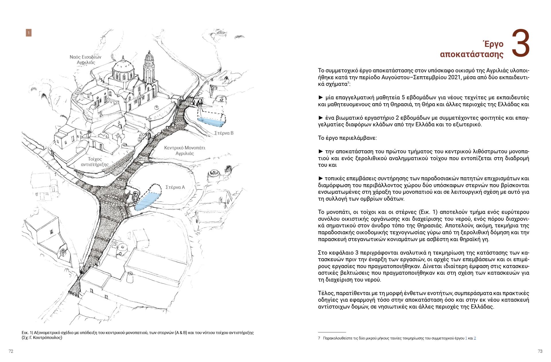 The unique geological history has substantially shaped the area's architecture; the use of volcanic stones and building materials based on lime and theran earth (a type of volcanic tephra with hydraulic properties) are documented since antiquity. The initiative aimed to unveil this interconnection of vernacular architecture with local materials and effectuate it through the restoration interventions in the settlement of Agrilia. This approach, apart from safeguarding local craftsmanship, highlights the use of locally sourced materials for reducing the environmental footprint of a building project. By the same token, mortars based on aerial lime and theran earth were designed according to the historical practice and applied for restoring the two cisterns, taking into account the former’s ecological features.