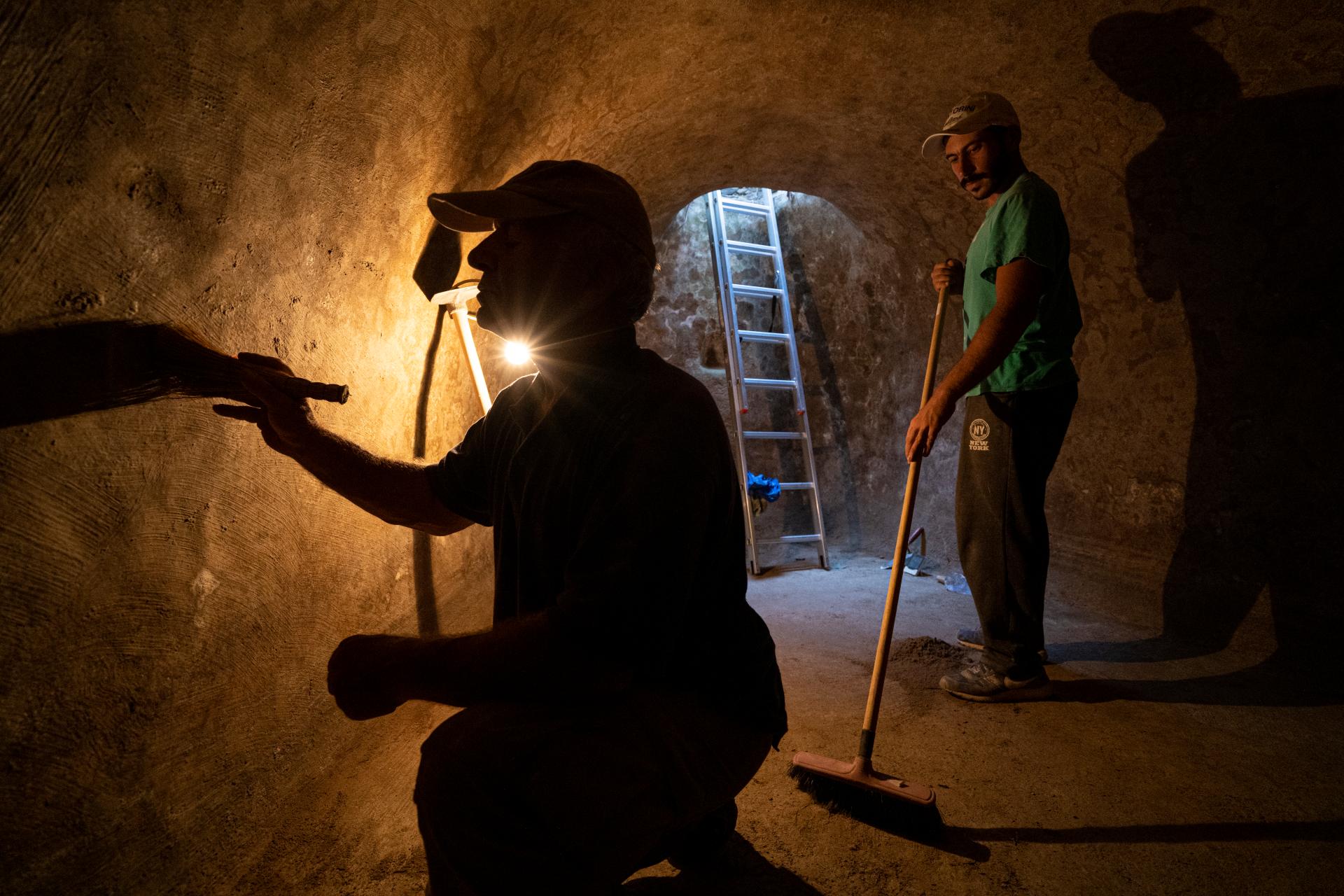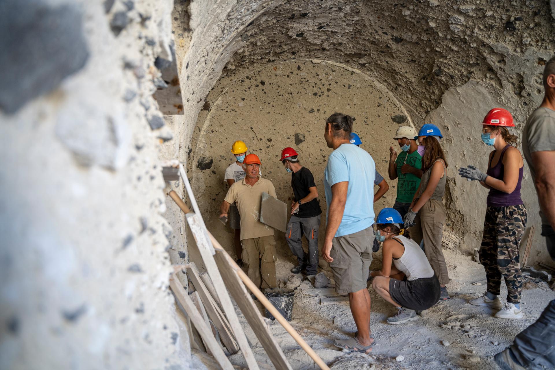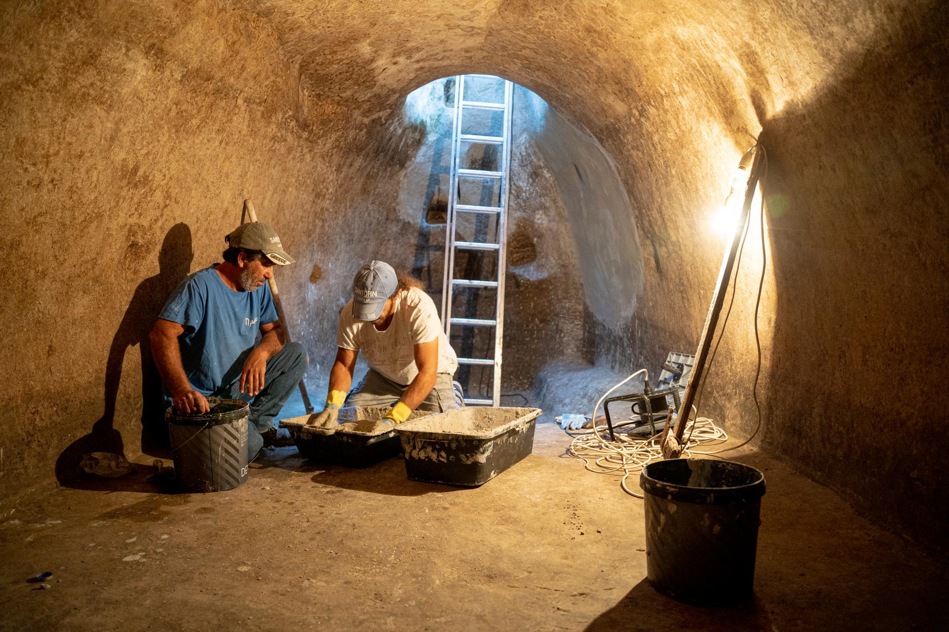 To begin with, the design of the restoration work necessitated the combination of architectural studies with conservation and materials science. Boulouki, along, with specialised collaborators, delved into cave architecture and some of the most representative techniques of Therasia: the use of volcanic stones and natural pozzolans, such as theran earth is inscribed within a wider line of knowledge on hydraulic building materials throughout history, among which the famous Roman concrete technology. The team developed synergies with various laboratories and scholars, in order to fully address the complexity of the issue and contribute to scientific research.