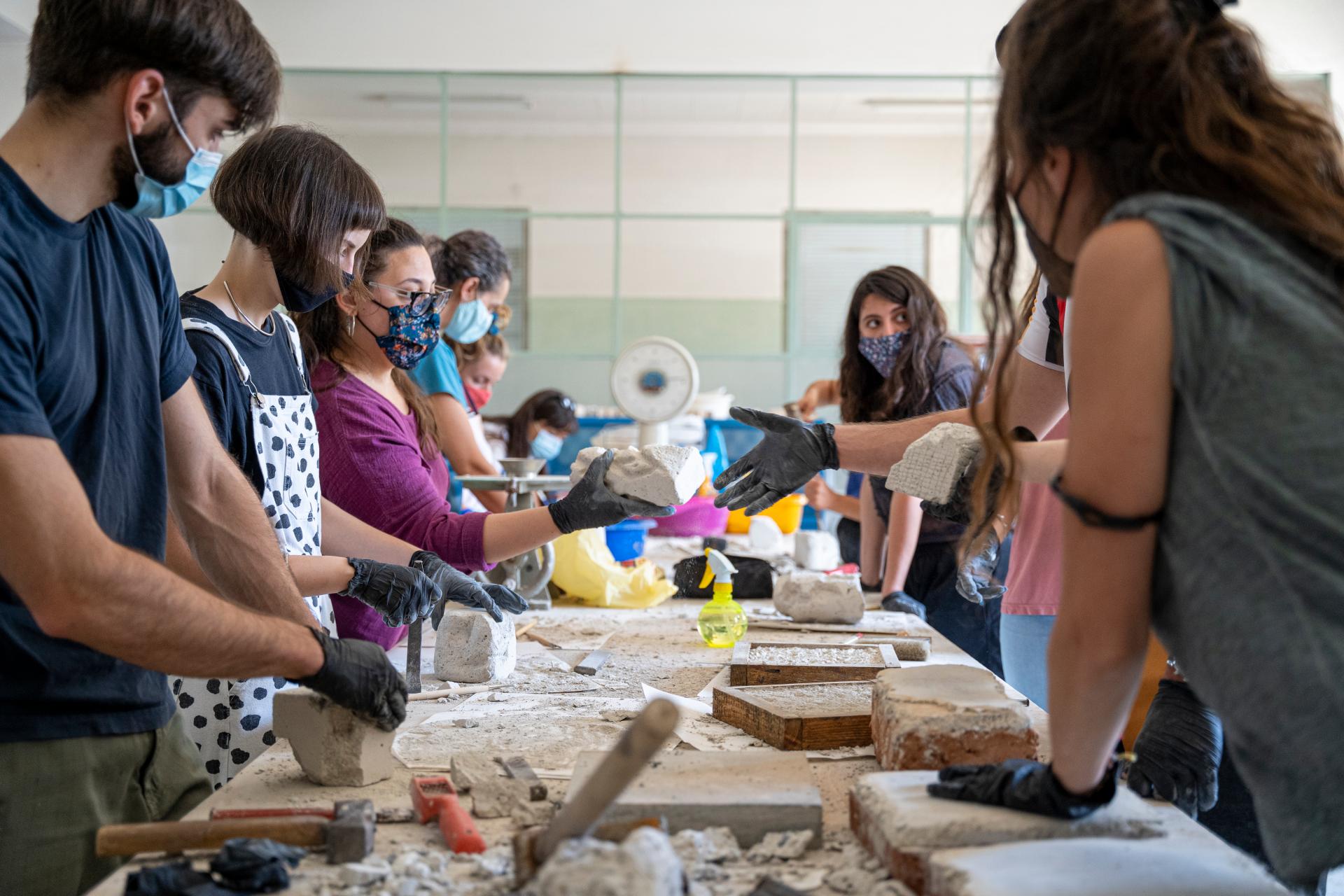 A two-week hands-on workshop for students and professionals of various disciplines from Greece and abroad, on two directions: a)‘Traditional building techniques’: 20 participants were trained on drystone and traditional mortars, assisting the restoration works, and b) ‘Contemporary Sculpture’: 9 students of the Athens School of Fine Arts (ASFA), experimented with the use of traditional mortars for creating sculptural artworks.