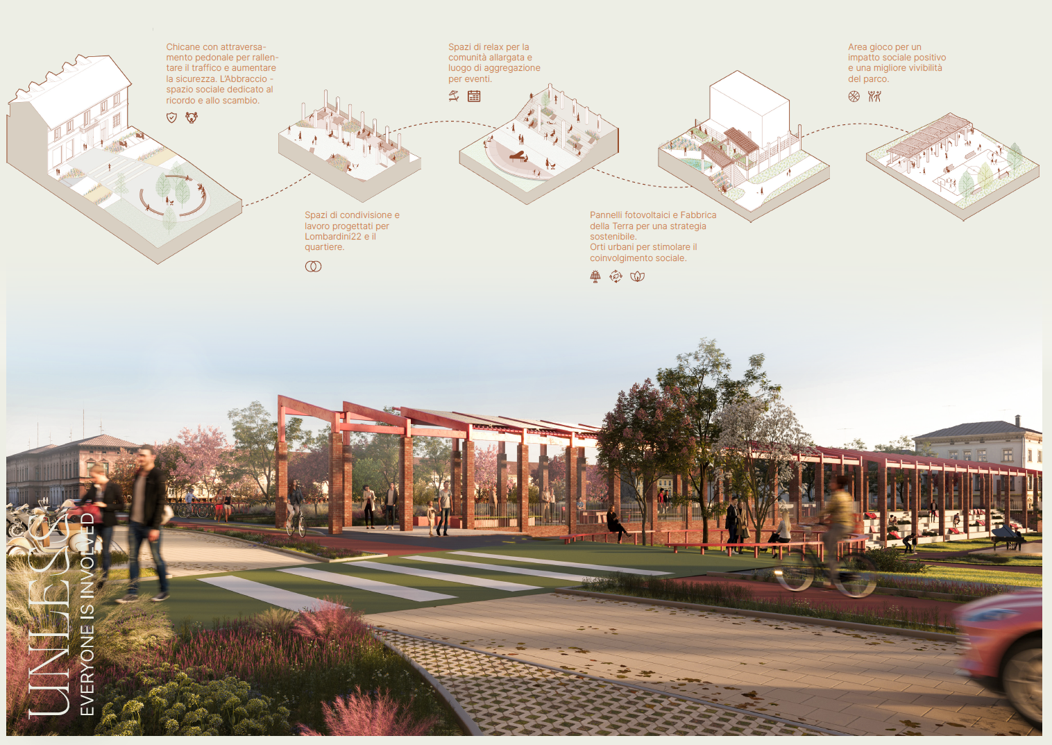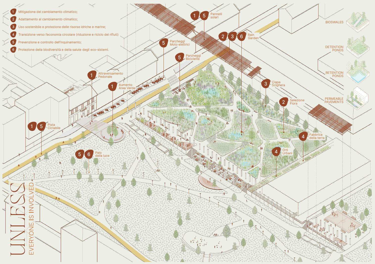 ‘Unless’ as an idea was born out of this need to create an approach to re-use and transform a public space set in the city of Milan (Italy). The project is concerned with the improvement of the aesthetics and the connection between two adjacent public parks and an adjoining road. Currently, the two parks are separated by an open air gallery, perceived as a visual and architectural barrier and an unsafe place, while the adjoining road has a lack of safe crossing and bicycle paths.