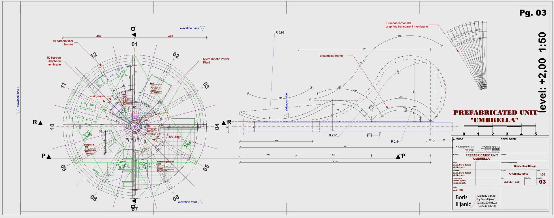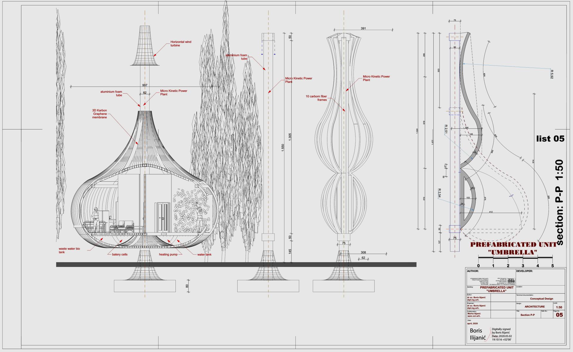 Using recycling materials, there is a respect for natural sustainable environment. However, structure materials are graphite products, carbon materials and other. Umbrella Prefabricated Unit - UPU is energy independent structure, with production of electricity by wind turbine, and also by micro kinetic power plant. Drinking water tanks are below the using floor, designed as free collected water from atmosphere. Also the most products of this unit age going to be recycled.Another idea, which is complementary to this one, is the sociological approach of using UPU, when it comes to housing and a creative workplace, as a unique whole. The analysis of the use of space for living and work in the management system in the previous, 21th century, establishes the dispersion of housing and work from the "house", which defines the uncertainty of the location for the activity. The decisive factor for the existence of such a place is energy independence and internet connection, as well as transport communication, for the delivery of goods for a supply of such locations through online shopping, and recently drones delivery. Thus, the creative workplace is tied to the place of living, and the capacity of the housing unit is reduced, primarily due to the advanced way of equipping such spaces with smaller devices for basic functions; maintaining personal hygiene, night rest, food consumption and creative work, as well as reducing number of family members.