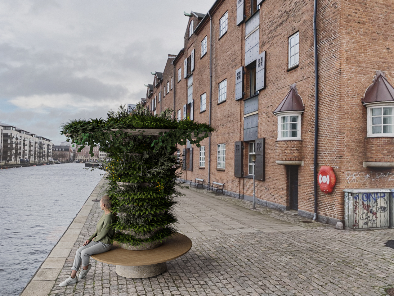 URBAN TREE has a dimension of inclusiveness as there can be placed a bench around the URBAN TREE, so it can function as a social gathering point or resting place. And there is also an inclusion aspect as people can be a part of taking care of the plants covering URBAN TREE, which is an option we would like for our products to provide