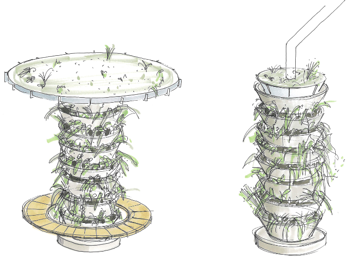 The URBAN TREE modules are made from an “zero cement” concrete that recycles industrial waste products such as slags from steel production, ashes from incineration plants, mineral wool, aggregates, and sand from demolition projects, etc. which would otherwise have ended up in landfill. The concrete has a CO2 footprint of between 50%-70% lower than conventional concrete. The modules can be stacked on top of each other and formed into a column with a reservoir for rainwater storage. The modules are designed to allow plants to grow in a growing medium with access to the stored rainwater. The URBAN TREE comes in two versions: one that collects water through drainpipes from roofs, the other as a free-standing structure with a ‘crown’ that functions as a collection funnel.