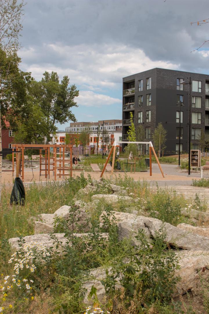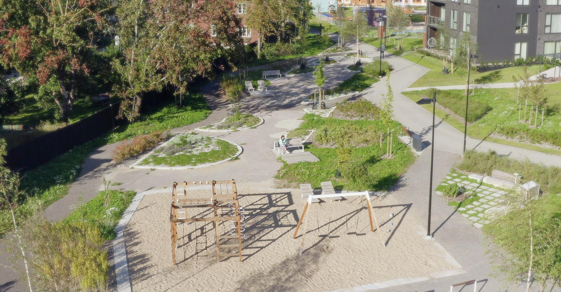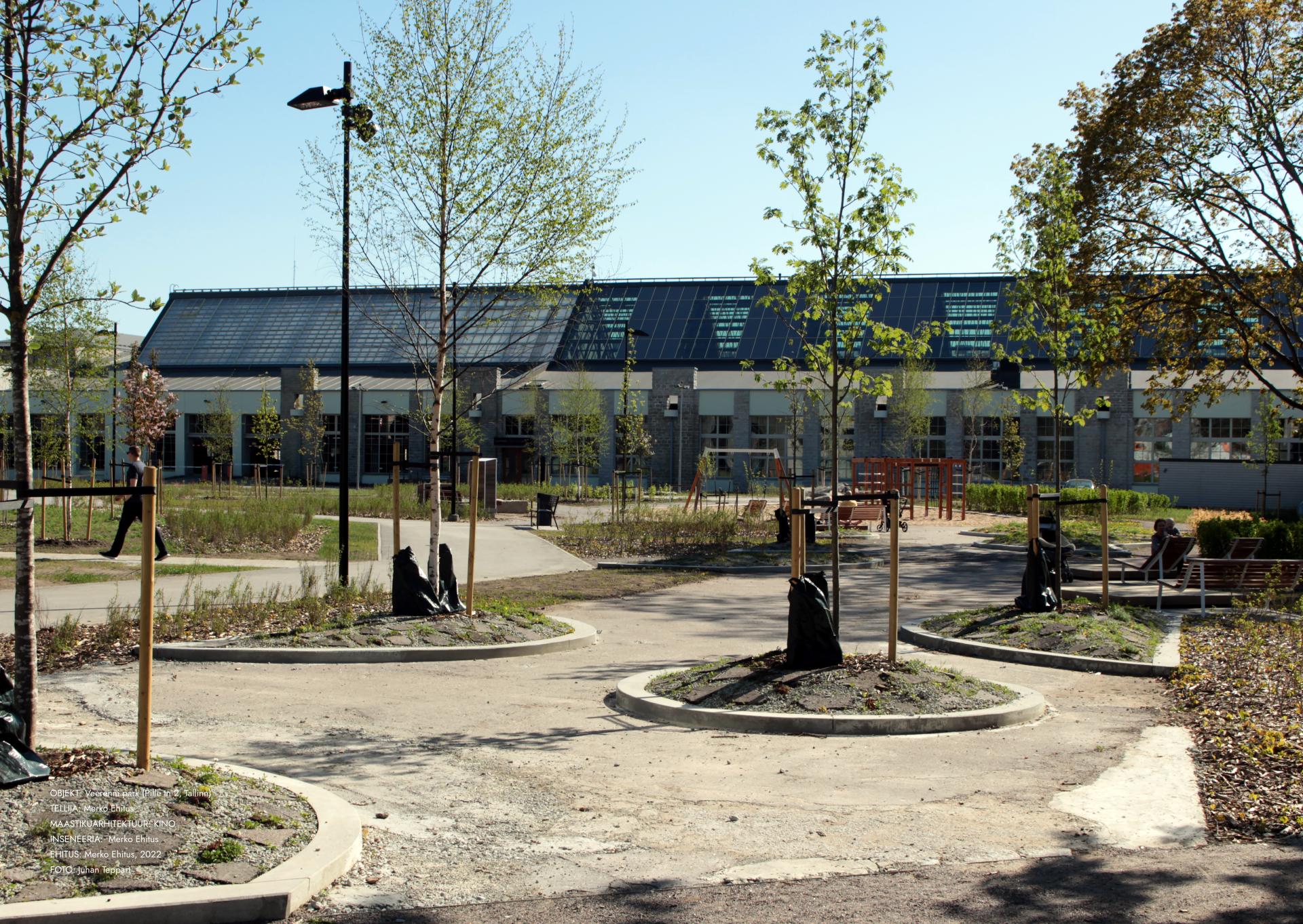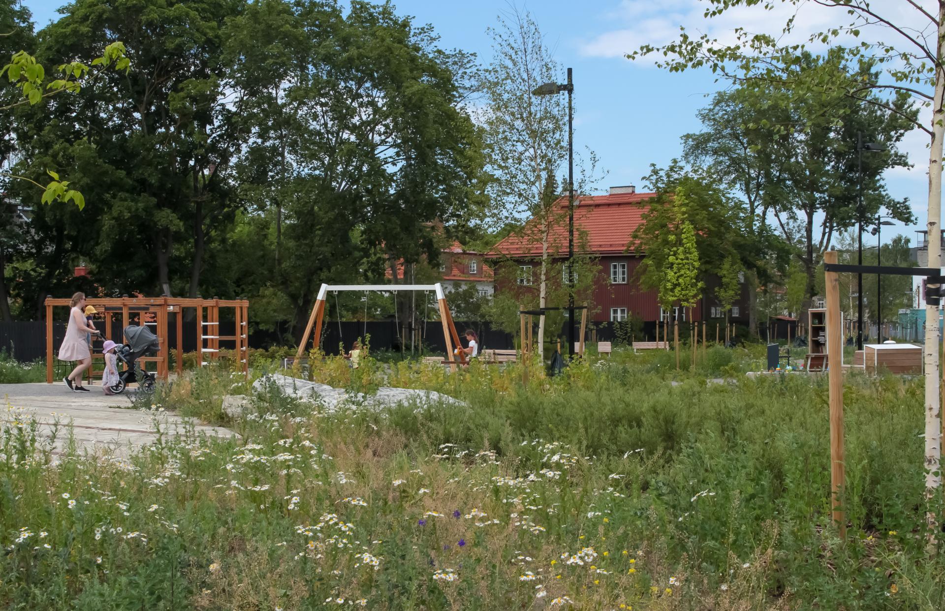 Park offers a common ground for the existing neighborhood and the new inhabitants. The landscaping of the park is based on the principles of supporting biodiversity. The park uses semi-natural communities that provide habitats and food for both insects and birds.