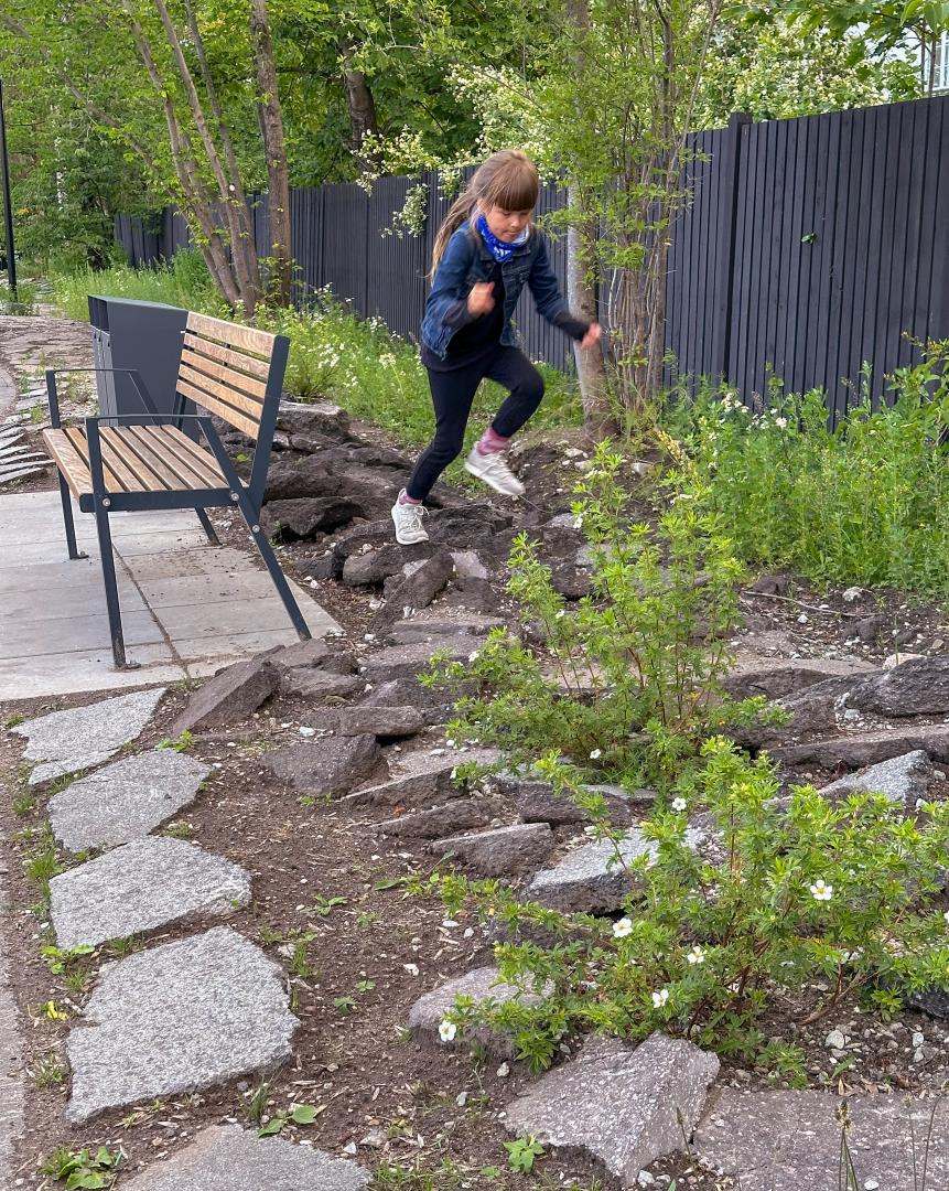 The idea of Uus-Veerenni park is based on sustainability and reuse. The aim was to value, first of all, the on-site material - so the stratification of the former industrial land, such as asphalt and concrete, as well as metal structures, has been cleverly used. This park is most likely one of the first examples in Estonian landscape architecture, where such a large amount of waste has found a new form of use in an exposed manner.