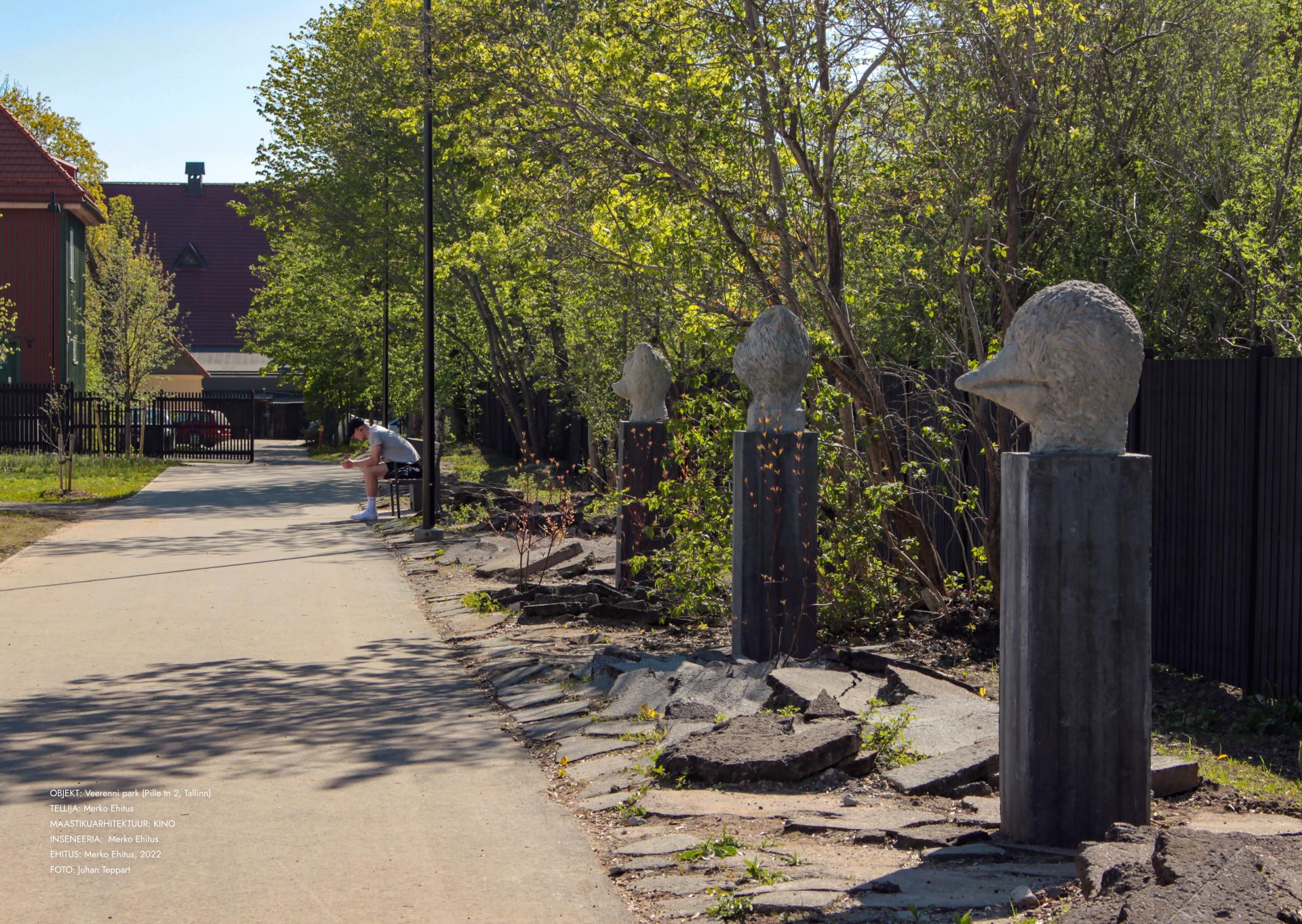 Veerenni Park is one of the first outdoor objects of this size in Estonia, where we have consciously and systematically looked beyond this oppressive indulgence of just planting trees and used design possibilities to explore what sustainable landscape architecture with a small CO2 footprint is and how to do it.The idea of Uus-Veerenni park is based on sustainability and reuse. The aim was to value, first of all, the on-site material - so the stratification of the former industrial land, such as asphalt and concrete, as well as metal structures, has been cleverly used. Tall concrete elements, the paved pathway and the concrete foundations of the building are reminders of the plywood industry that once operated here.