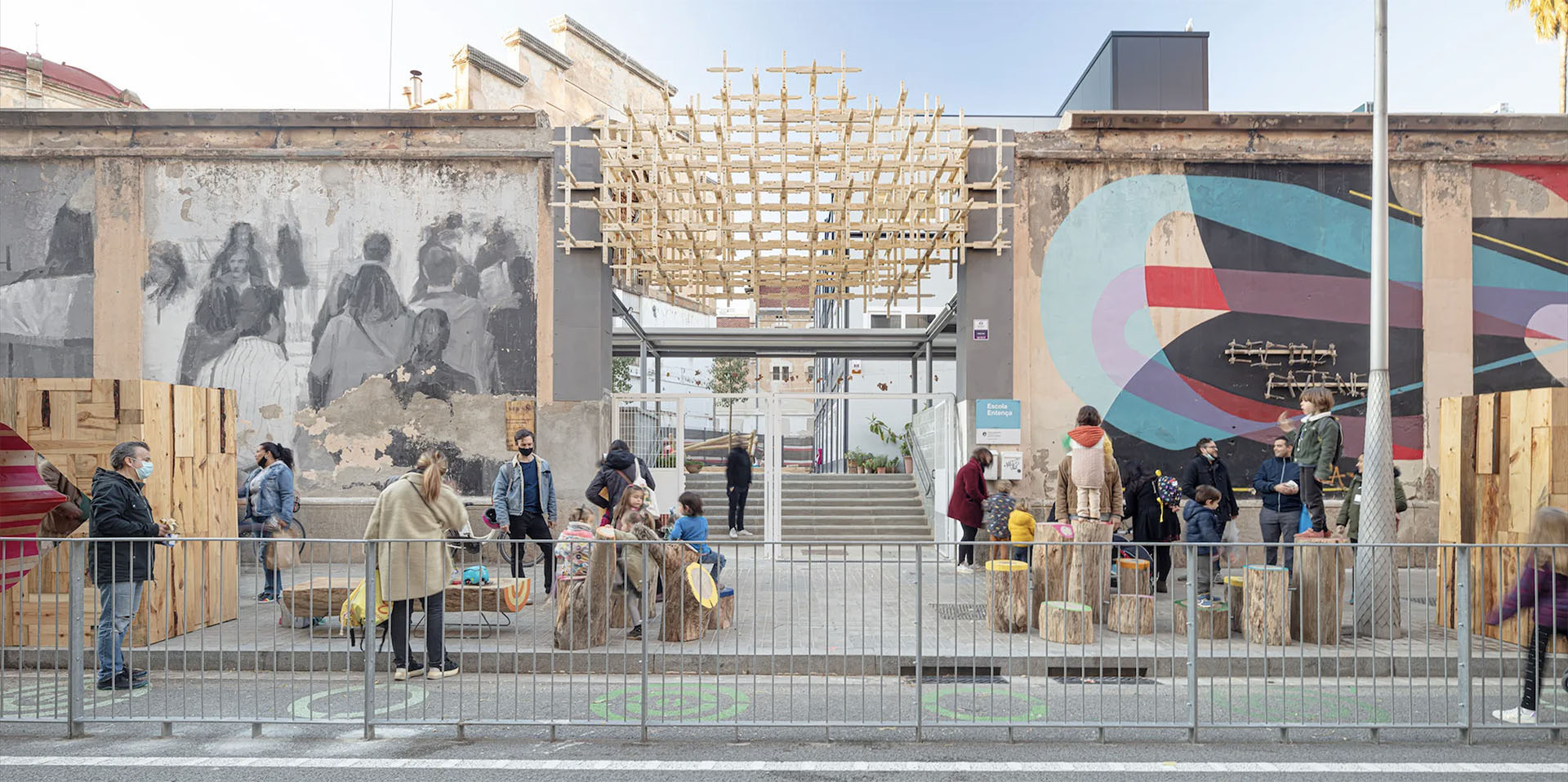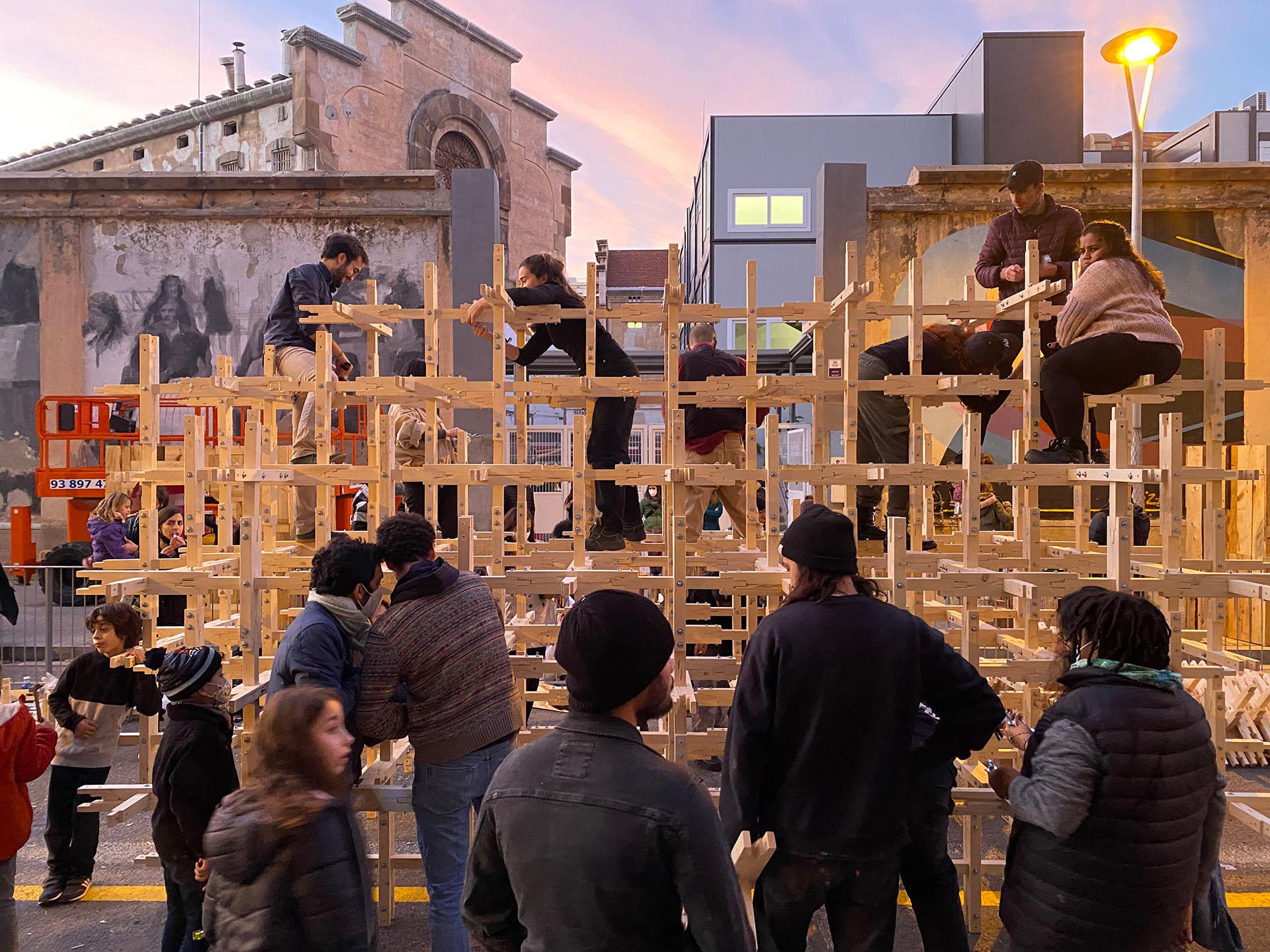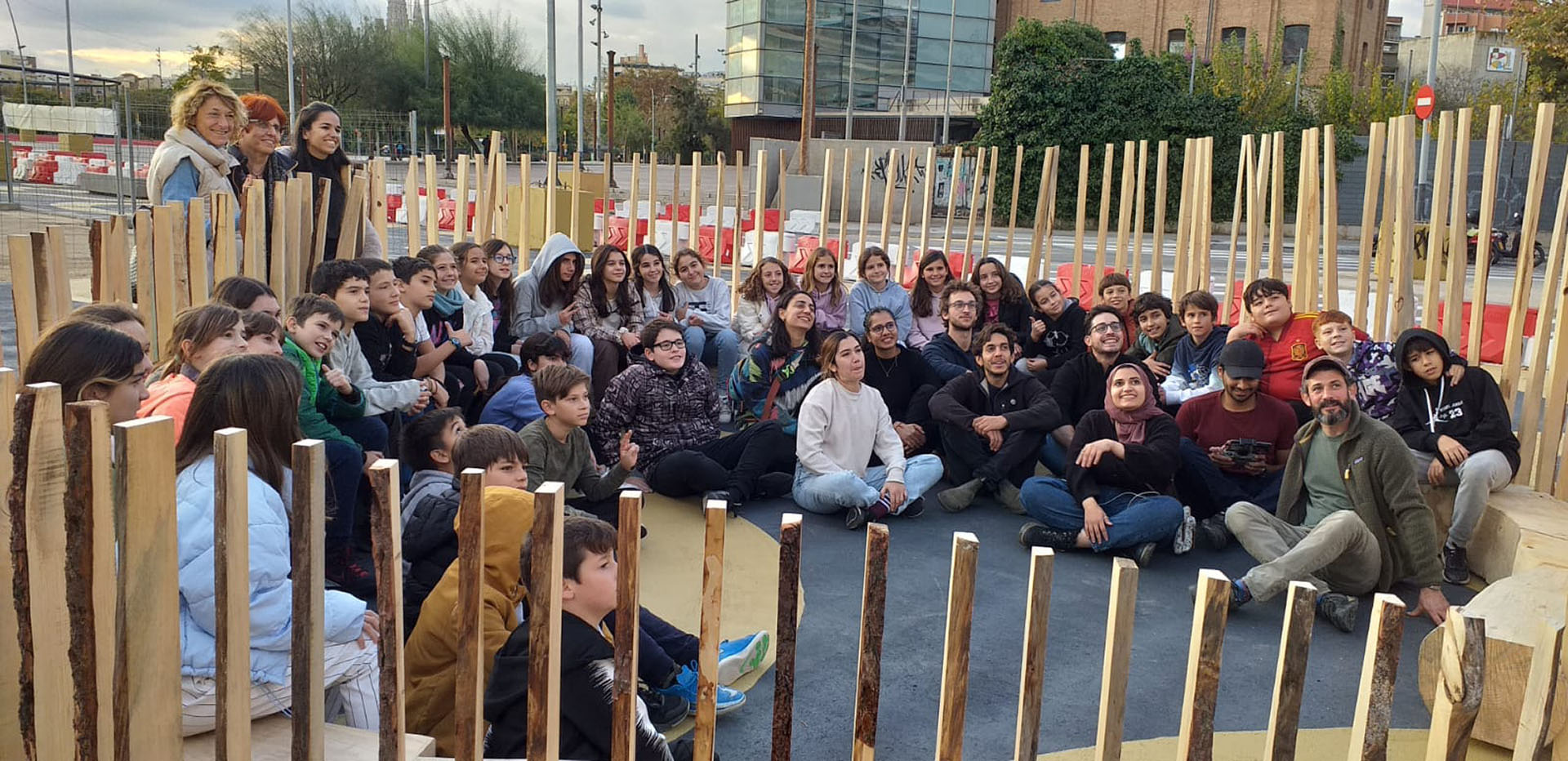 Apart from the benefits of VL projects to public spaces and the citizens they serve introduced above, citizens and civil society are intimately engaged as co-creators. In the 2021 edition of FURNISH, a ‘cloud’ of wooden frames marking the Escola Entença entry/exit was designed as a system of small, lightweight modules which amalgamate into a larger form. This enabled the young students, along with their teachers, to actively participate in the assembly under supervision of VL researchers and the MAEBB cohort. Thus the installation transformed into a vibrant street festival piquing the curiosity of passersby. For the 2022 edition, VL researchers and MAEBB students engaged classes of 4th graders at Escola Provençals in co-design sessions with guided sketching activities. It was during these sessions that the desired functions of outdoor classroom, musical performance venue and gathering space were identified. Again the young students were able to participate in the installation due to the modular, lightweight, rapidly-assemblable and non-toxic character of the wooden components. OPEN NATURE also engaged young students from 4 urban schools in forest lessons and co-design building sessions at VL. Besides, repeat dialogue between VL’s MAEBB cohort and locals at meetings of the neighbourhood association abutting the project site served the dual purpose of garnering public support and informing the project with place-based knowledge, such as the history of a defunct ancestral fountain accordingly prioritised for renovation. OPEN NATURE’s installation likewise became a festival, with many community members who attended the meetings bringing friends and family to assist the construction, similarly optimised for accessibility through reliance on natural materials such as wood and earth. As with the aesthetic and experiential value of VL projects, the participatory co-creation processes foster a sense of belonging or communal ownership leading towards collective stewardship.