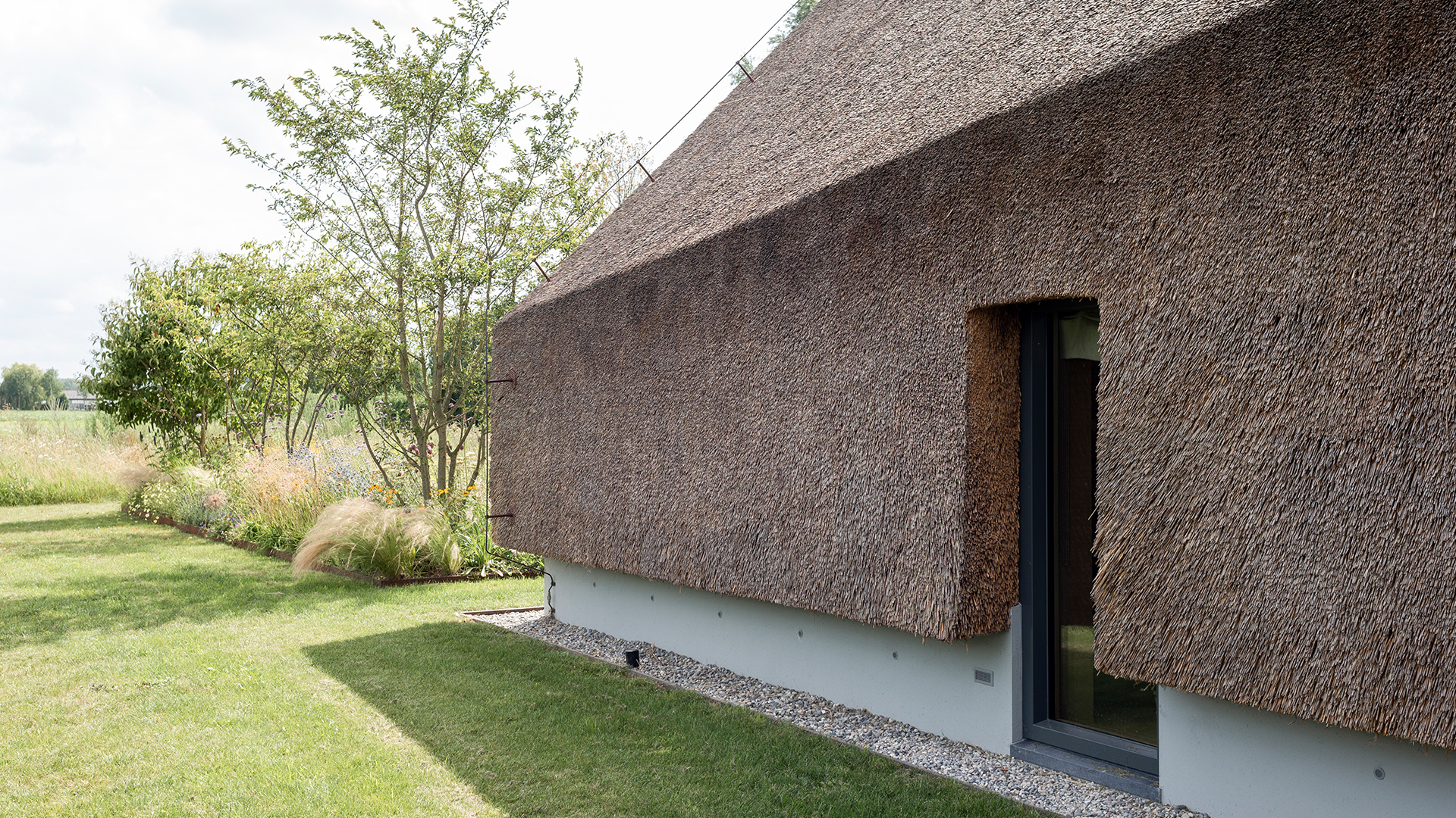 Veldhuis is a contextually relevant modern home with traditional references. The design is based on an archetypal Dutch barn house, of which the height and width is lessened at the rear. Built from cross laminated timber the main structure was erected in just twelve days and is clad in the world’s first biobased buildup of wood fibre insulation and thatch. Quality building materials were carefully sourced from as nearby as possible: a case study in testing sustainable building practices.